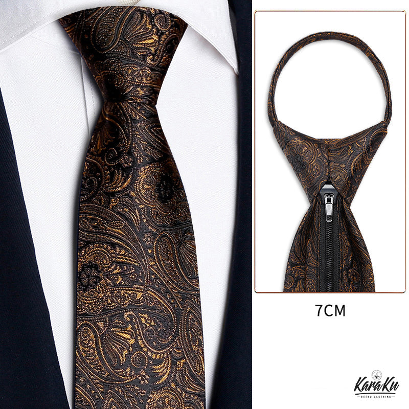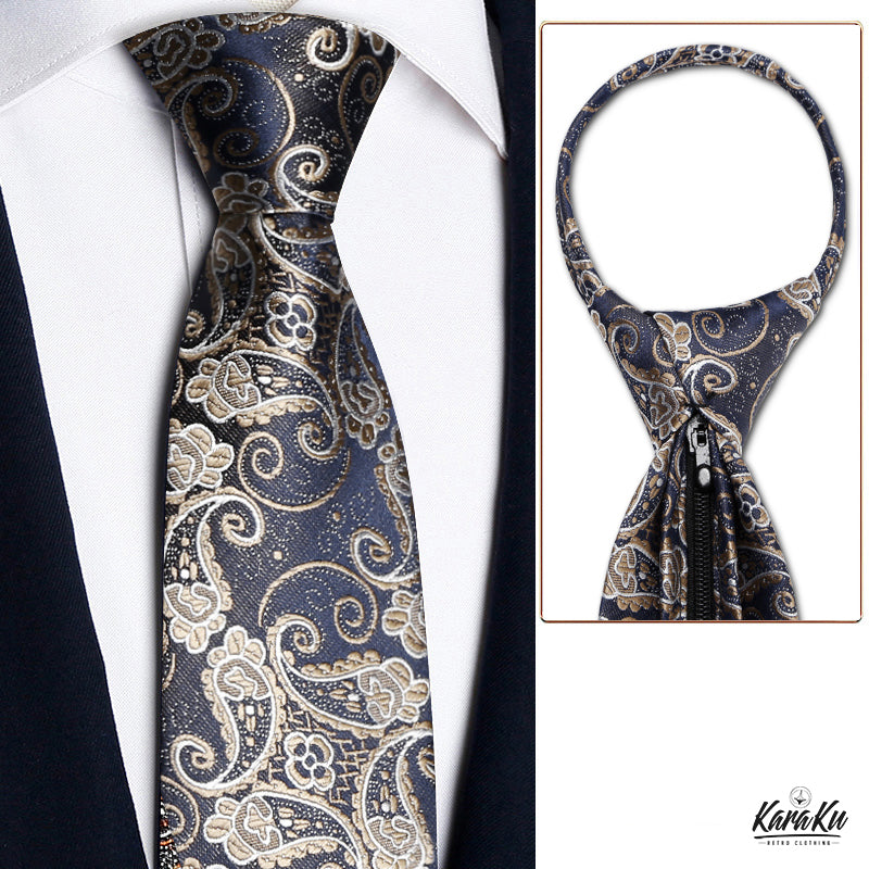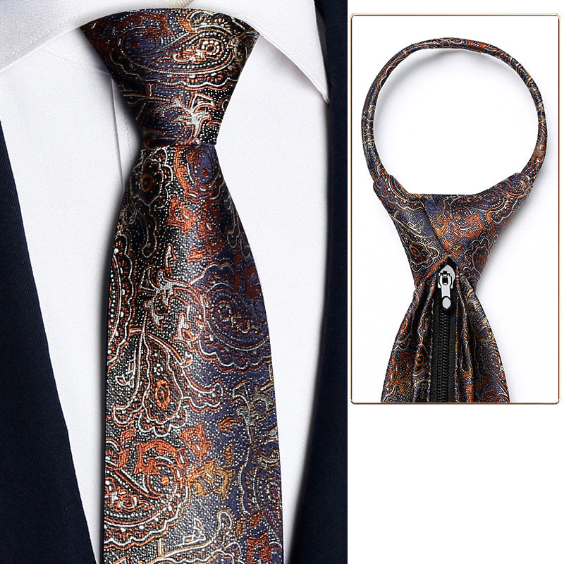 結ばないデザインとなって、ネクタイの後ろ側には隠しファスナーがあり。ネクタイを簡単に装着・取り外しできる。結ぶ必要がないため、時間の節約や簡便さを提供。