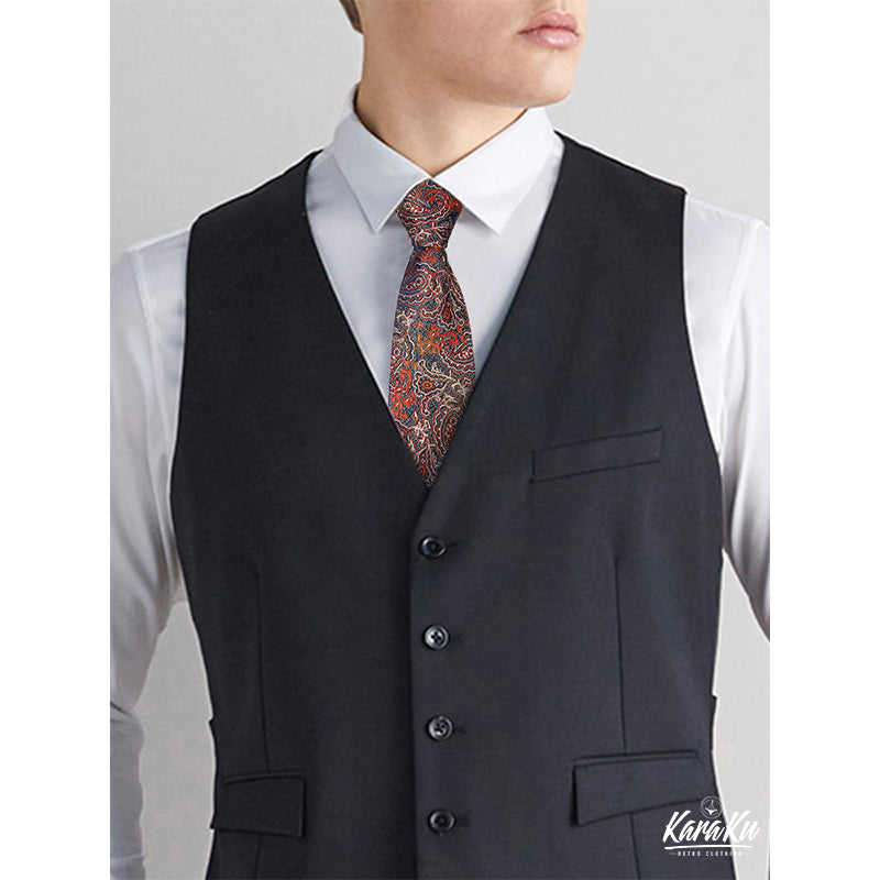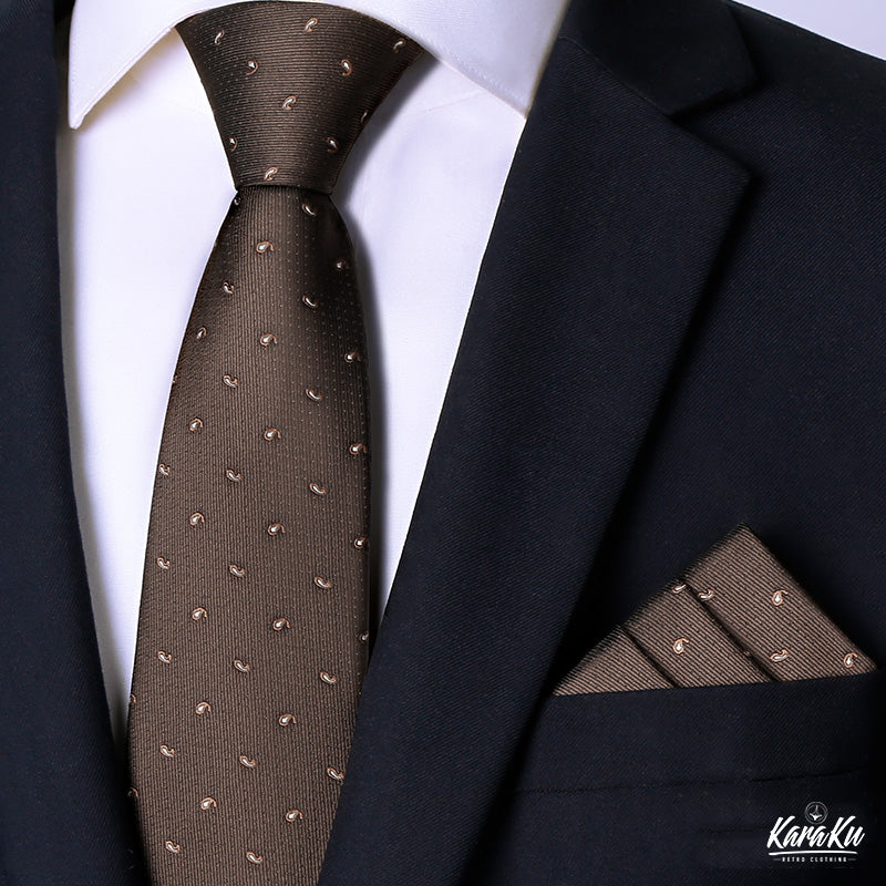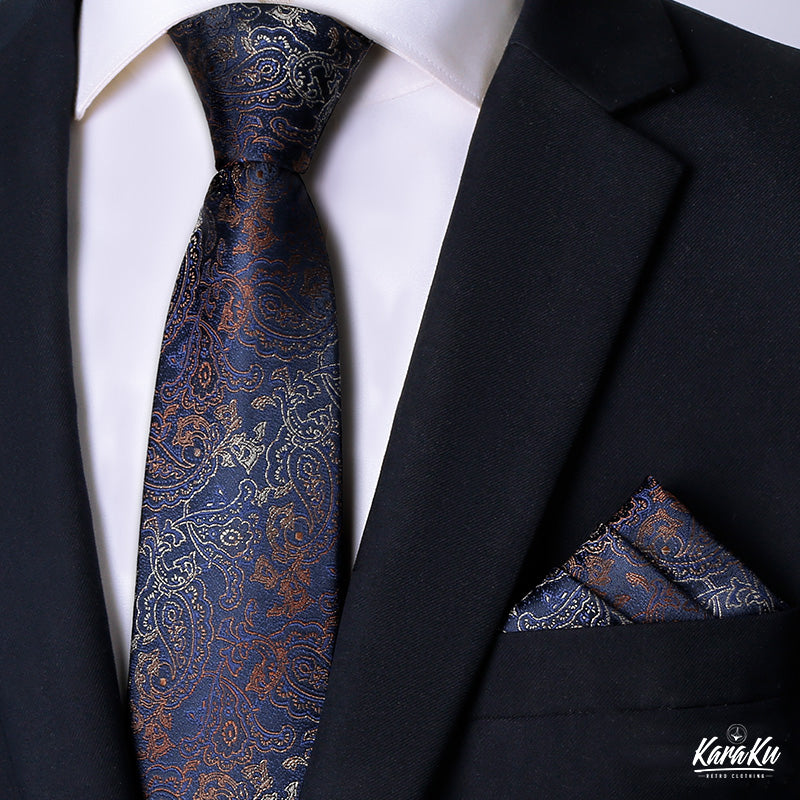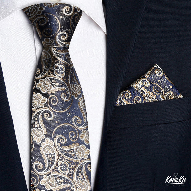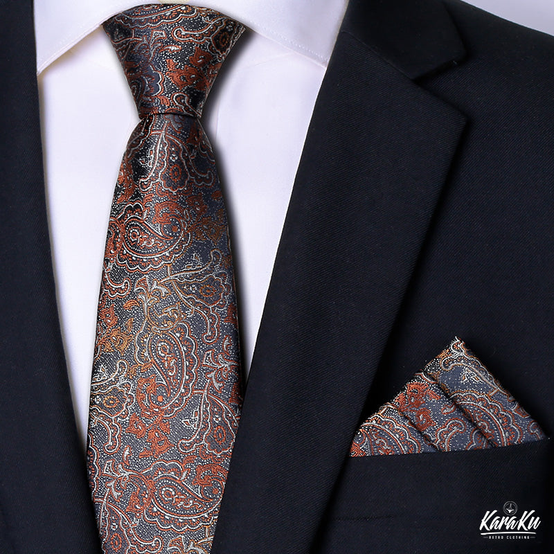 ペイズリー総柄を採用し、細かい曲線や渦巻き模様で構成され、クラシックでエレガントな印象を与え。柄の色合いは、豊かで鮮やかなトーンを持ち、ネクタイ全体を飾り立てる。