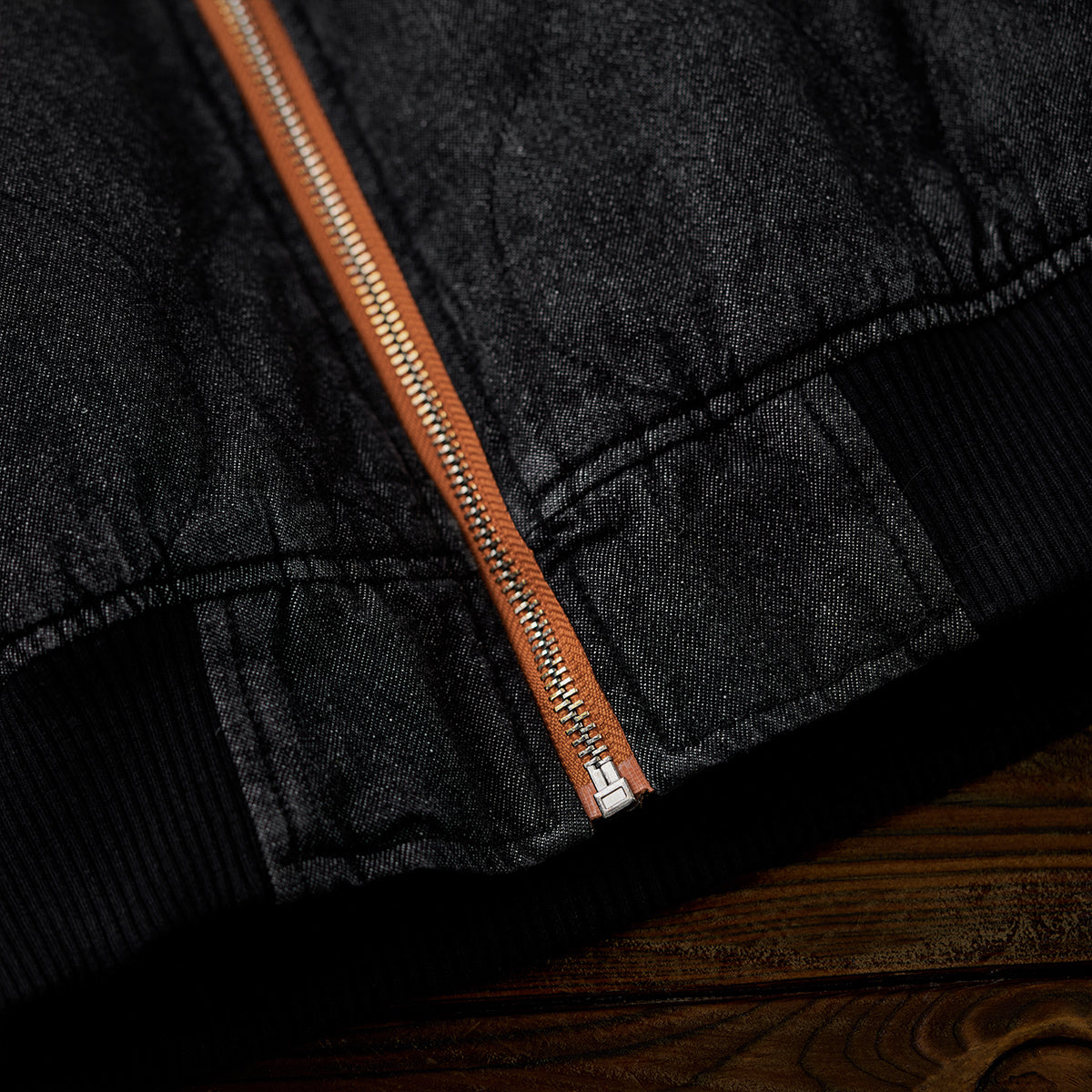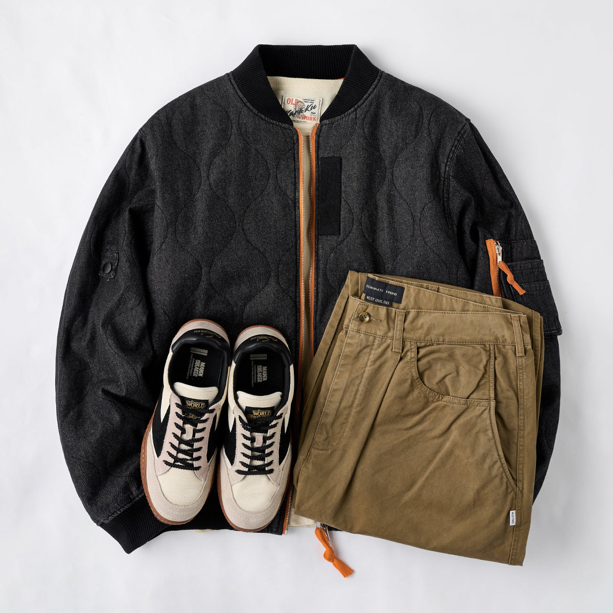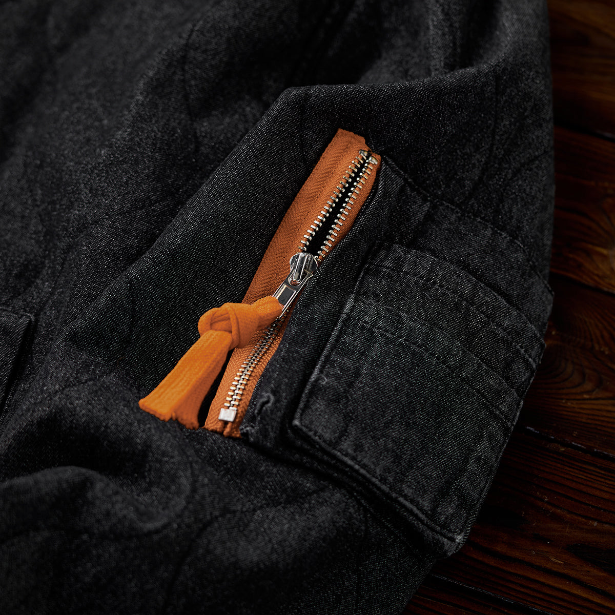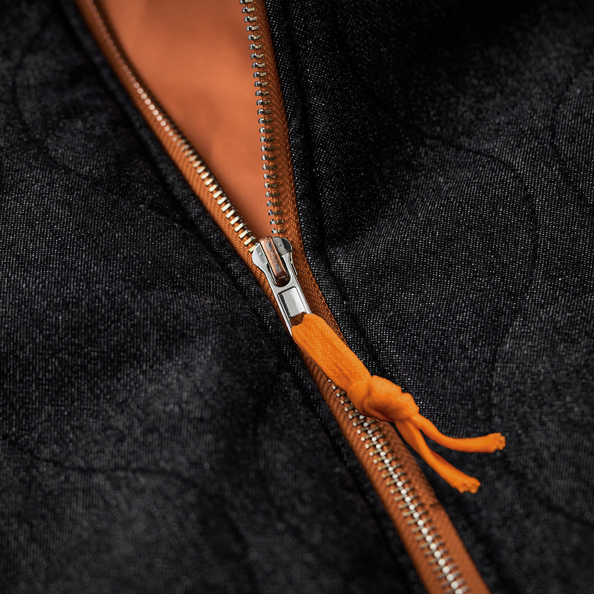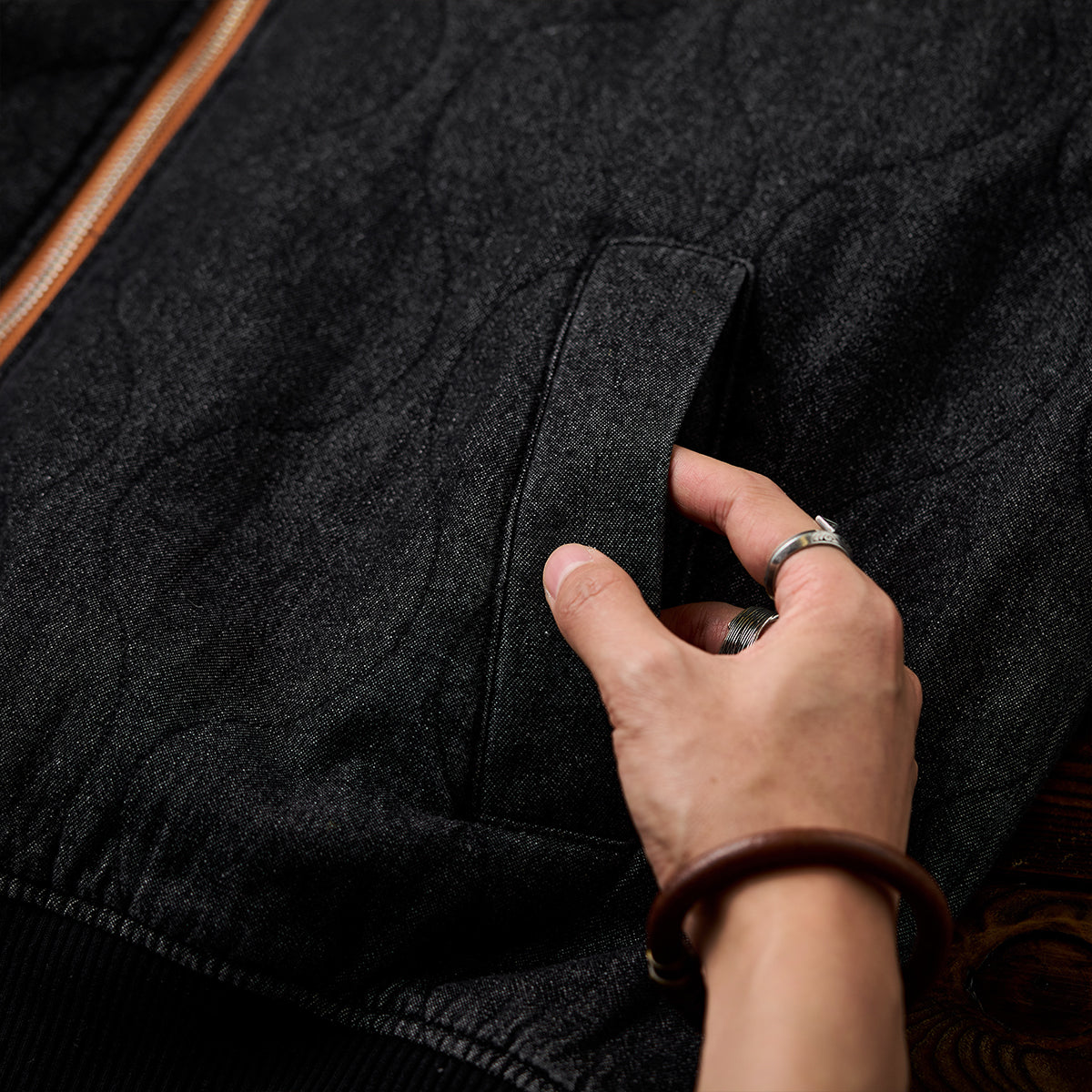 ヴィンテージフライトジャケットの無骨さを、ウォッシュドデニムとひょうたんキルトで再構築。全面に施したひょうたん型キルティングは、防寒性を高めるだけでなく、立体的な陰影をつくり、ジャケット全体に奥行きを与えます。内側のオレンジライニングに加え、前立てやジップ引き手にもオレンジ切替を採用。開けても閉めても表情が変わり、ブルーデニムとの鮮烈なコントラストが、スタイリングにエネルギーを与えます。デイリーからアウトドアまで幅広く対応します。重厚さがありながら、キルト構造により軽快な着心地を実現しているのも魅力。
