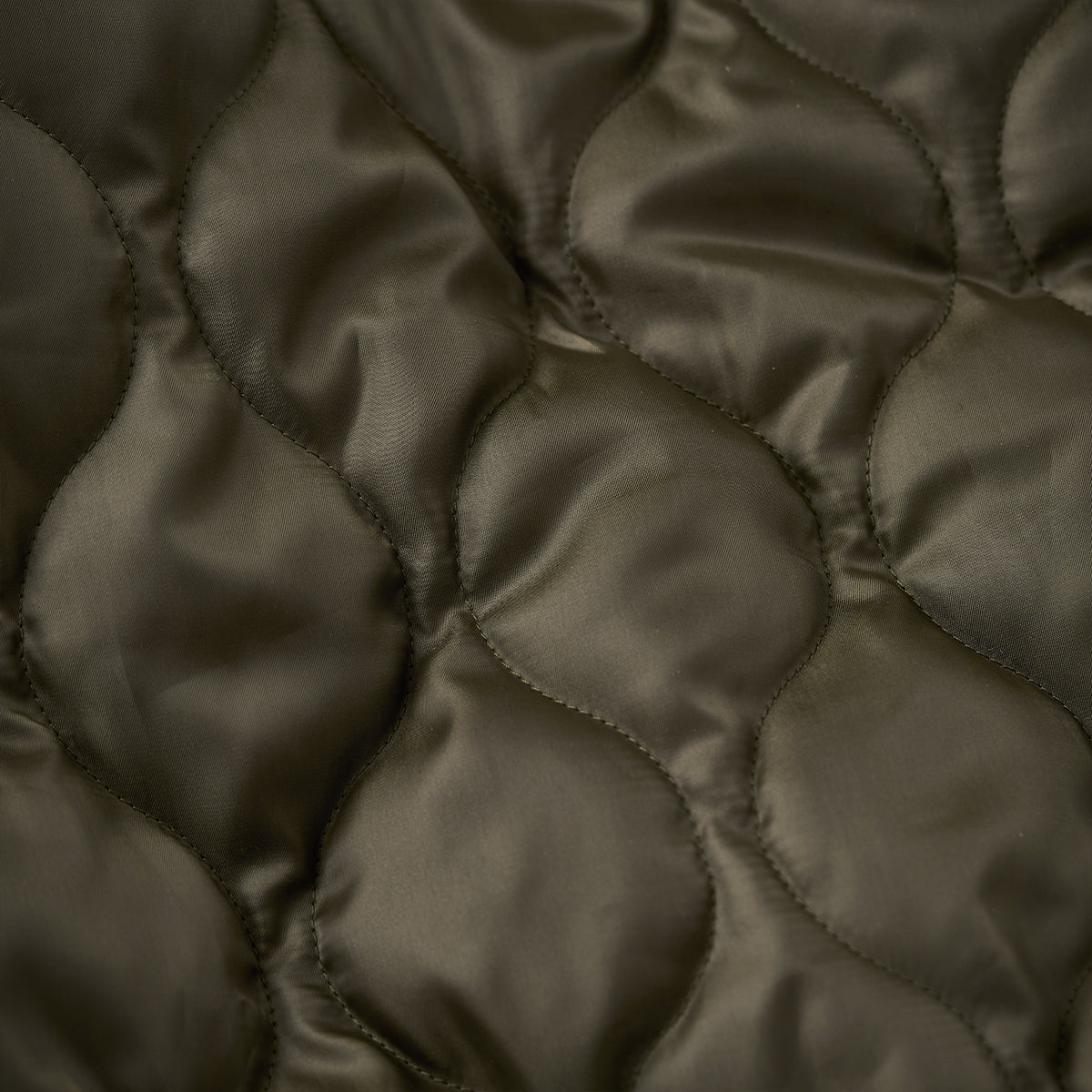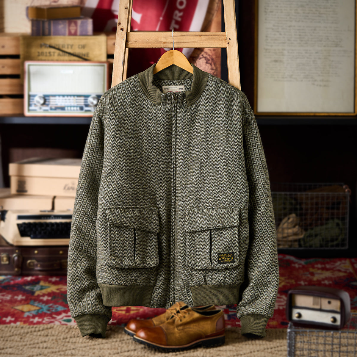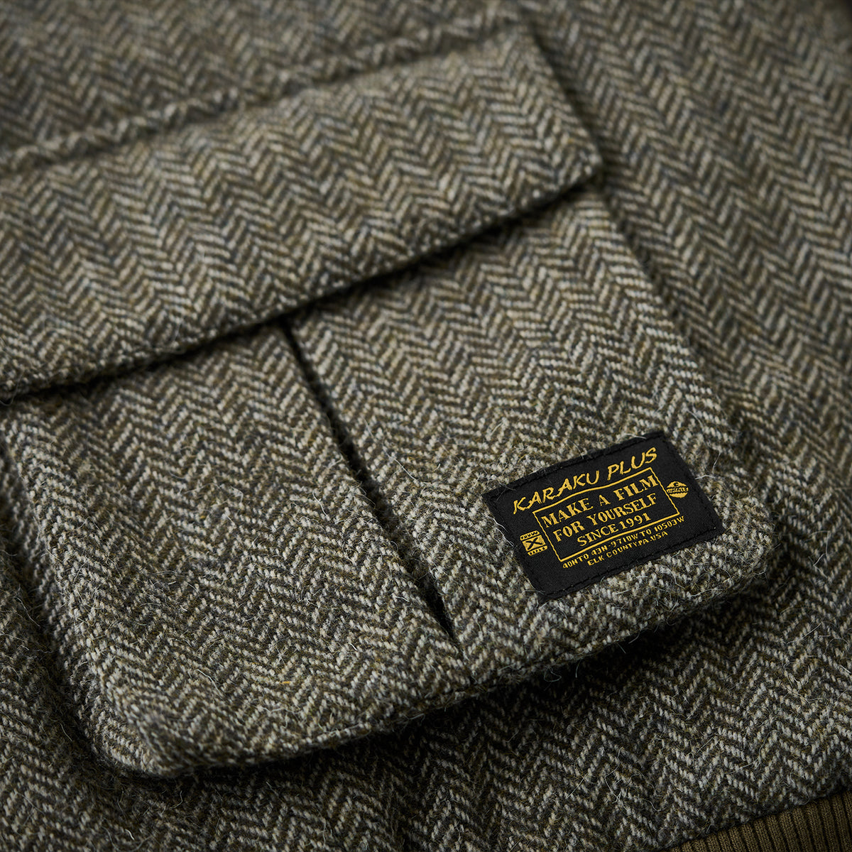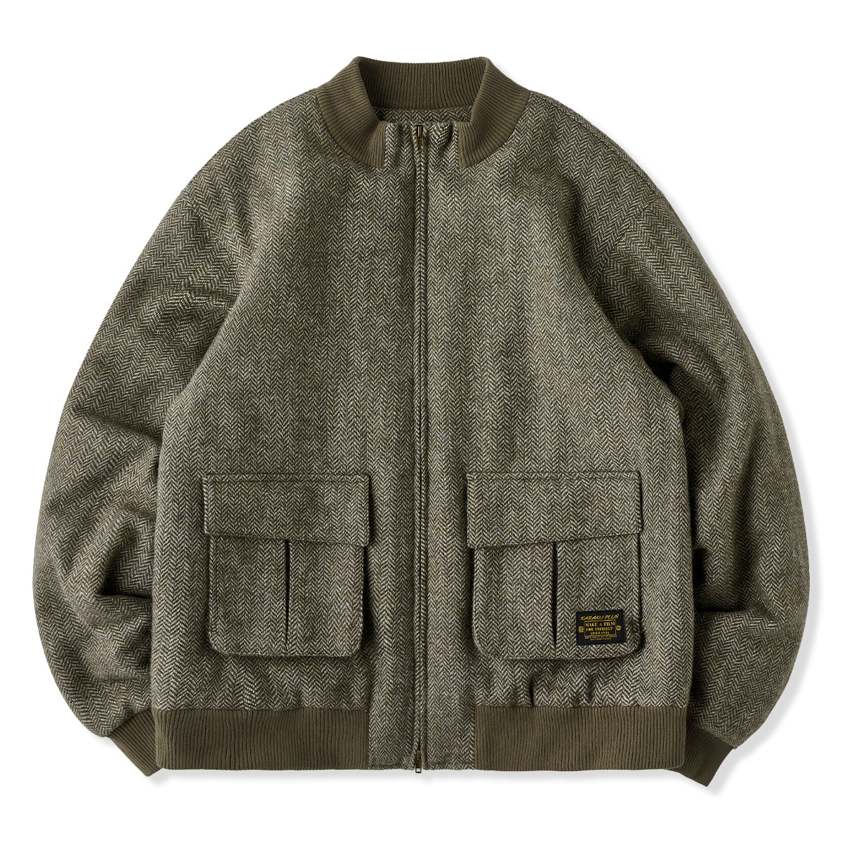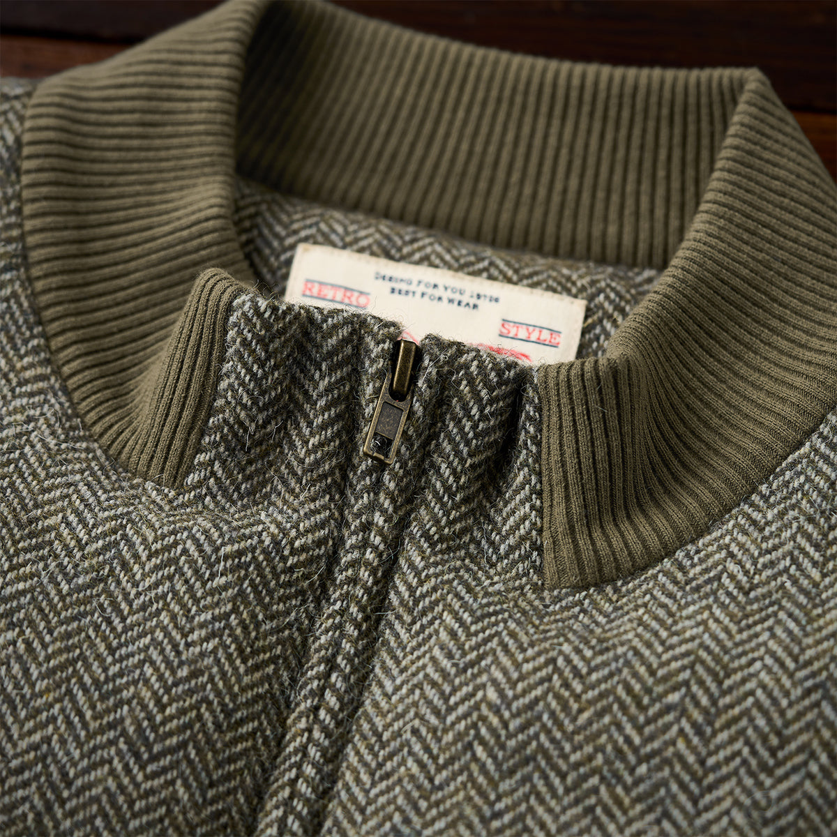 ヘリンボーンツイルは細かいV字のパターンが特徴で、クラシックで上品な印象を与えます。防寒性を高めるための中綿が使用されており、冬季の着用に適しています。