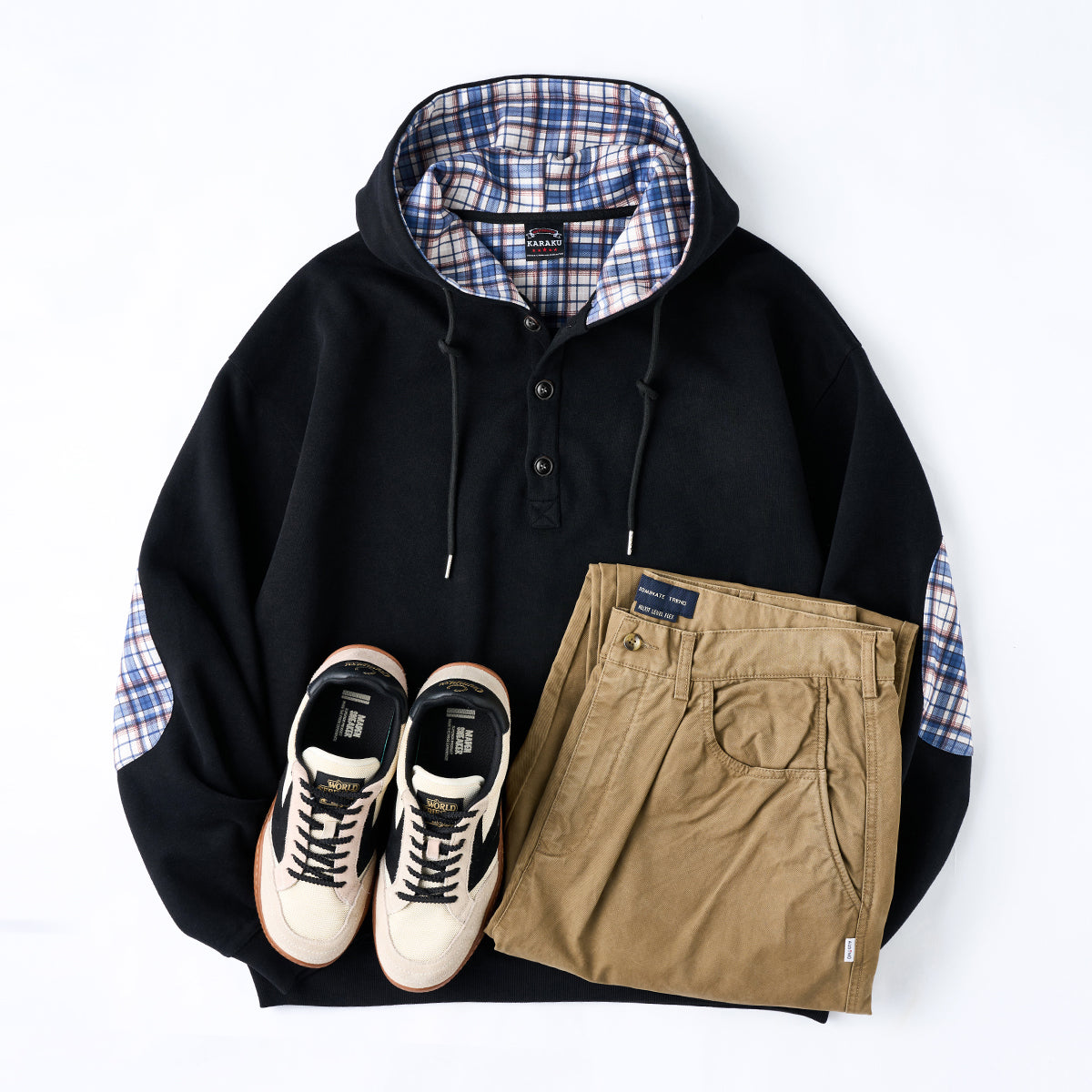 肘にチェック柄のパッチを施し、ワンポイントのアクセントを効かせたハーフボタンパーカー。前立てにはハーフボタンを採用し、着脱のしやすさとともにデザイン性を高めています。裏地にもチェック柄を取り入れることで、フードや前立てから覗くさりげない柄使いがスタイリングに遊び心をプラスします。シンプルなシルエットながらもディテールで個性を演出し、カジュアルからきれいめまで幅広いコーディネートに対応。ハーフボタンデザインにより着脱しやすく、レイヤードスタイルでも活躍する一着です。