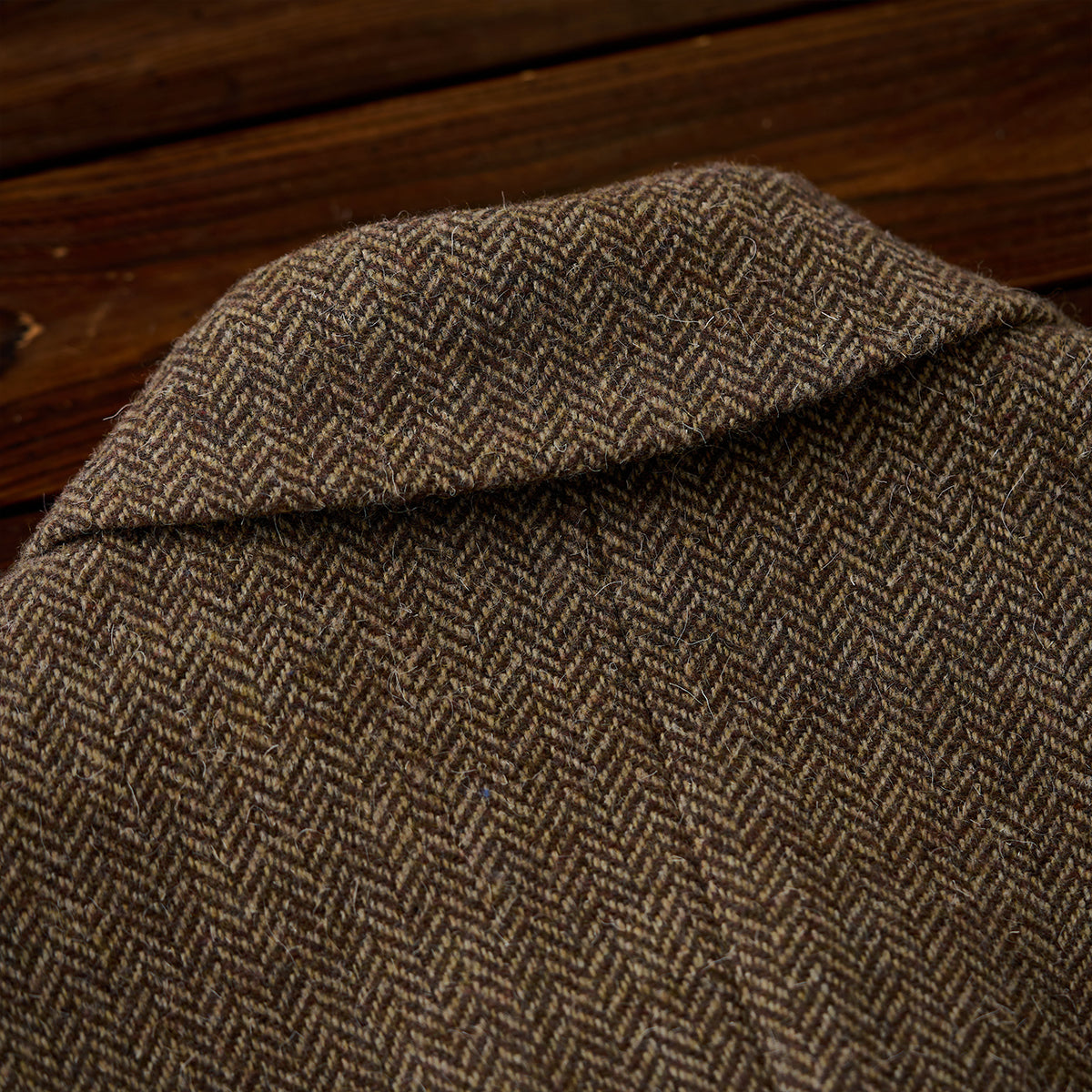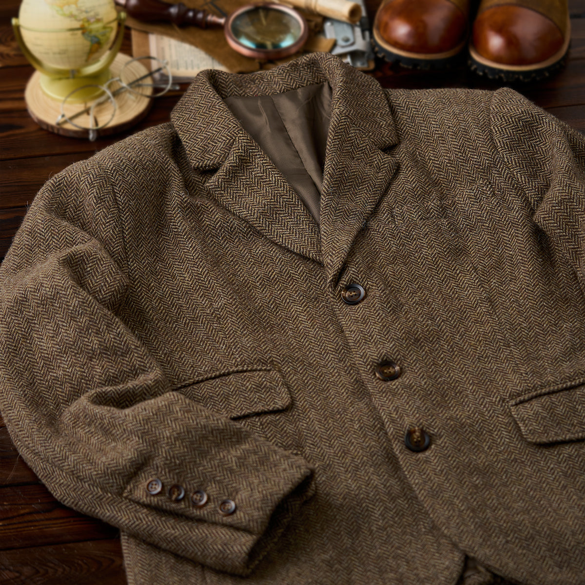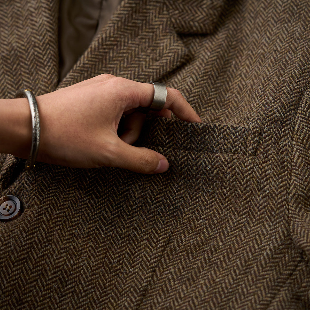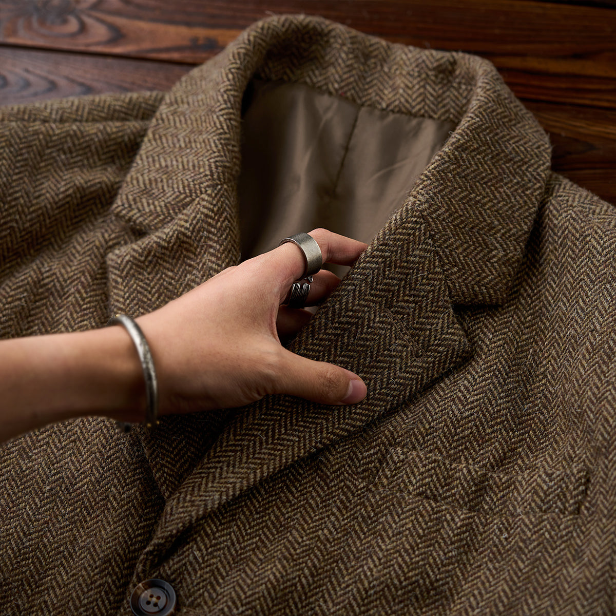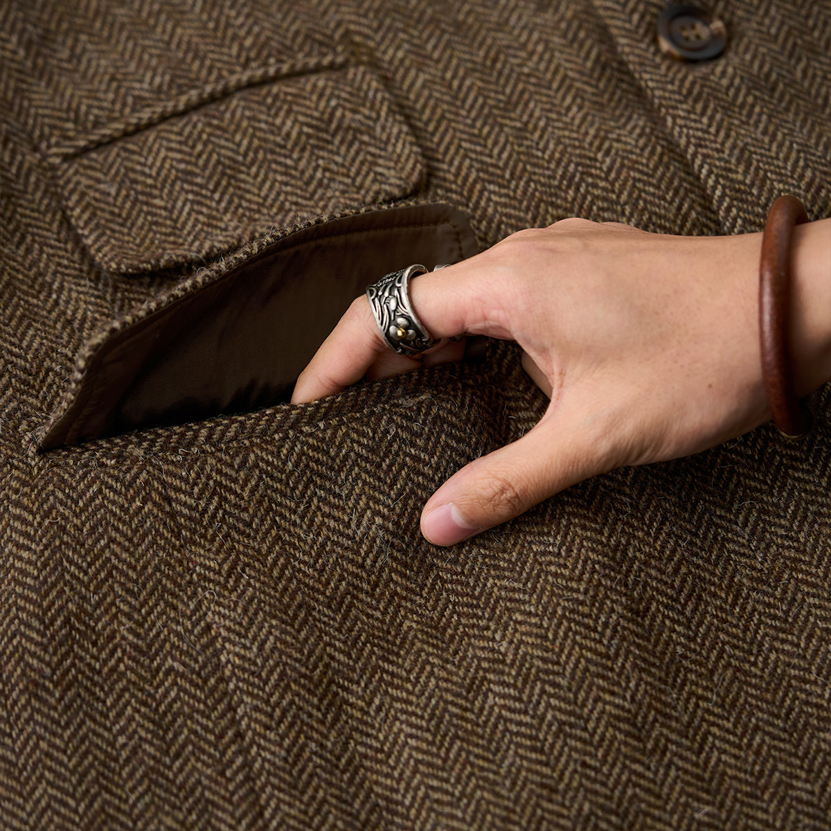 落ち着いた風合いと上品な佇まいが魅力の、ウール混紡ヘリンボーン織りツイードテーラードジャケット。襟元はオープンカラー仕様で、首周りの締め付けがなく、リラックスした着心地を実現。フロントには大きめのパッチポケットを備え、手ぶらで出かけられる実用的なデザインに仕上げました。袖口には定番の4つボタンを配し、クラシックな雰囲気をさりげなく演出。普段使いはもちろん、ビジネスシーンにも対応できる汎用性の高い一着です。クラシカルなテーラードシルエットが、カジュアルからフォーマルまで幅広いスタイリングにマッチします。細部まで丁寧に仕立てられた、長く愛用できる上質なツイードジャケットです。