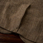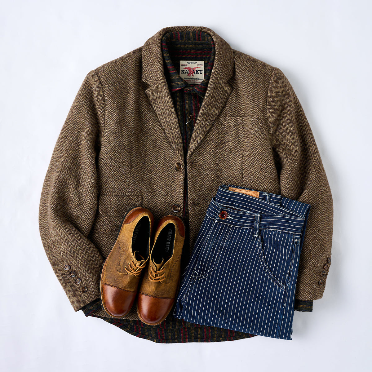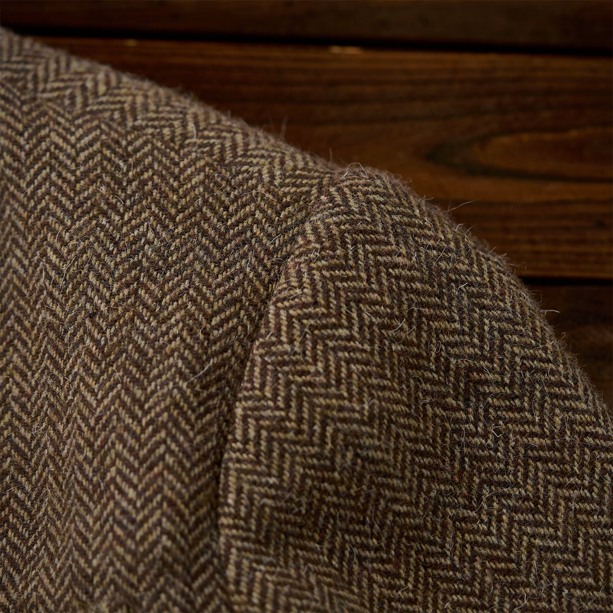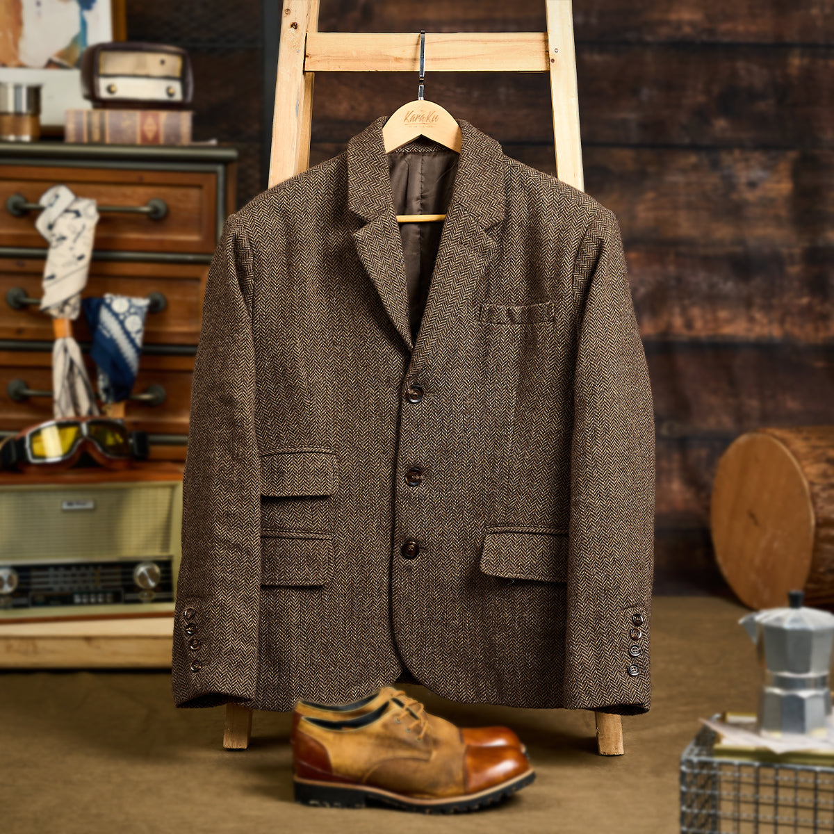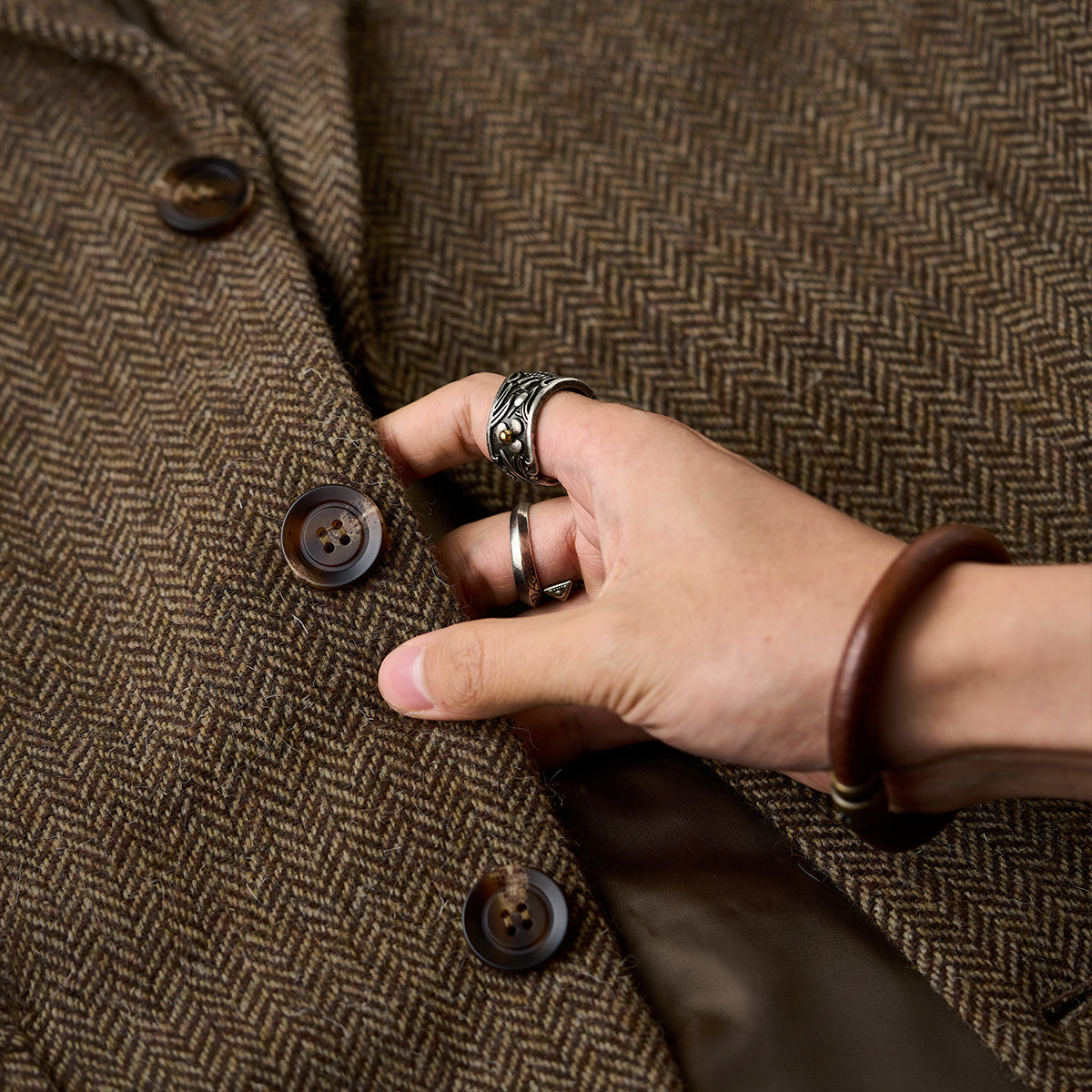 落ち着いた風合いと上品な佇まいが魅力の、ウール混紡ヘリンボーン織りツイードテーラードジャケット。襟元はオープンカラー仕様で、首周りの締め付けがなく、リラックスした着心地を実現。フロントには大きめのパッチポケットを備え、手ぶらで出かけられる実用的なデザインに仕上げました。袖口には定番の4つボタンを配し、クラシックな雰囲気をさりげなく演出。普段使いはもちろん、ビジネスシーンにも対応できる汎用性の高い一着です。クラシカルなテーラードシルエットが、カジュアルからフォーマルまで幅広いスタイリングにマッチします。細部まで丁寧に仕立てられた、長く愛用できる上質なツイードジャケットです。