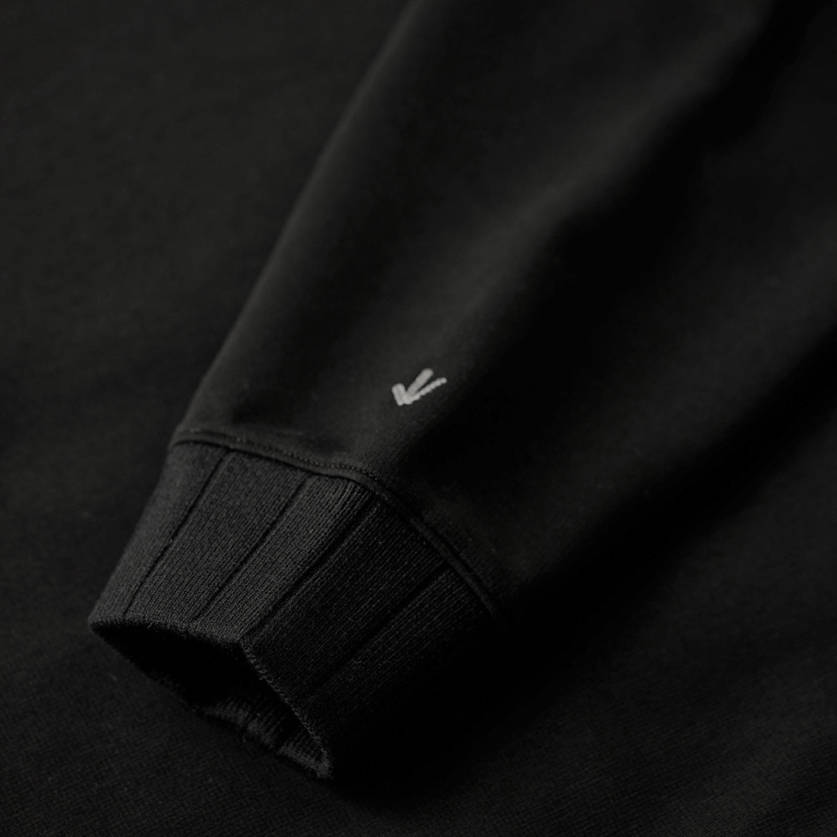 袖口と裾部分にも、しっかりとしたリブ素材が採用されて、フィット感を高めています。リブの幅が広めで、耐久性がありつつデザイン性も高い点が特徴的です。