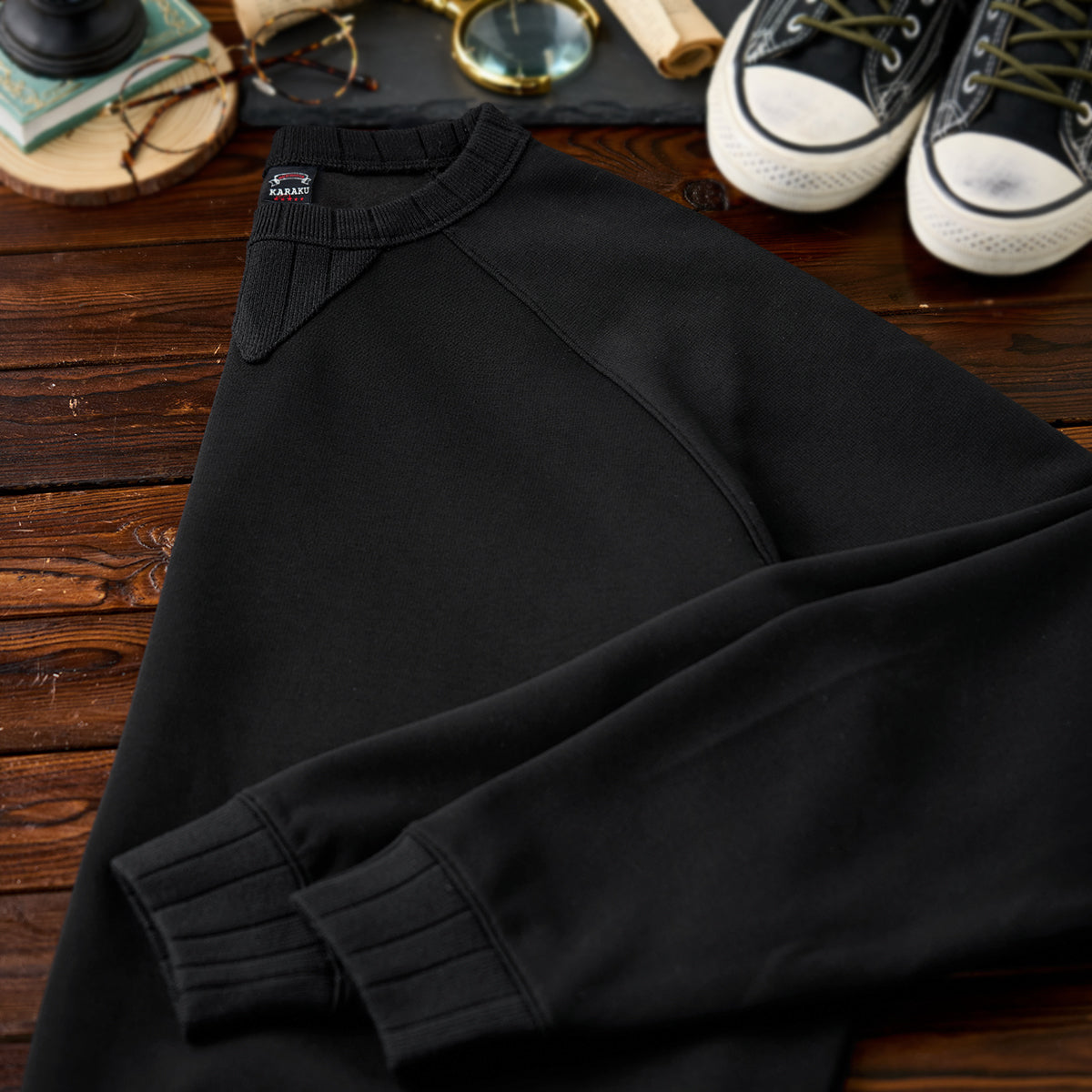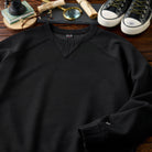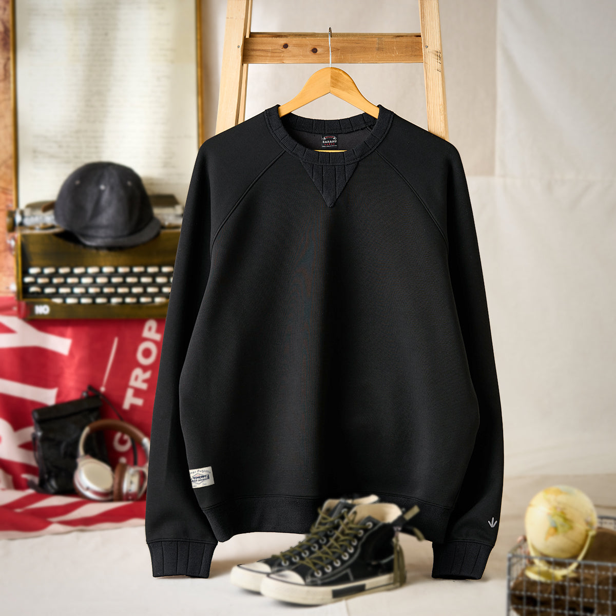 首元のV字型のガゼットは、スウェットシャツの伝統的なディテールであり、ヴィンテージ感を醸し出しています