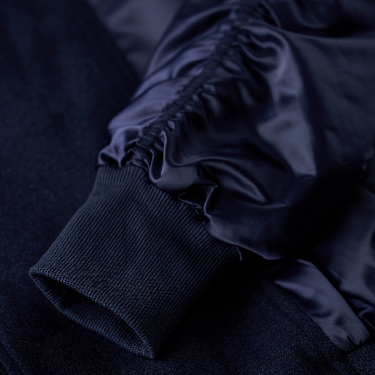 ボディ中心部にはツイード素材が使われて、マットでソフトな質感が特徴。保温性が高く、冬から春先まで快適に着用できます。袖とサイドパネルはナイロン素材。光沢感があり、防風性・撥水性を確保しつつ、スポーティーな印象を与えます。