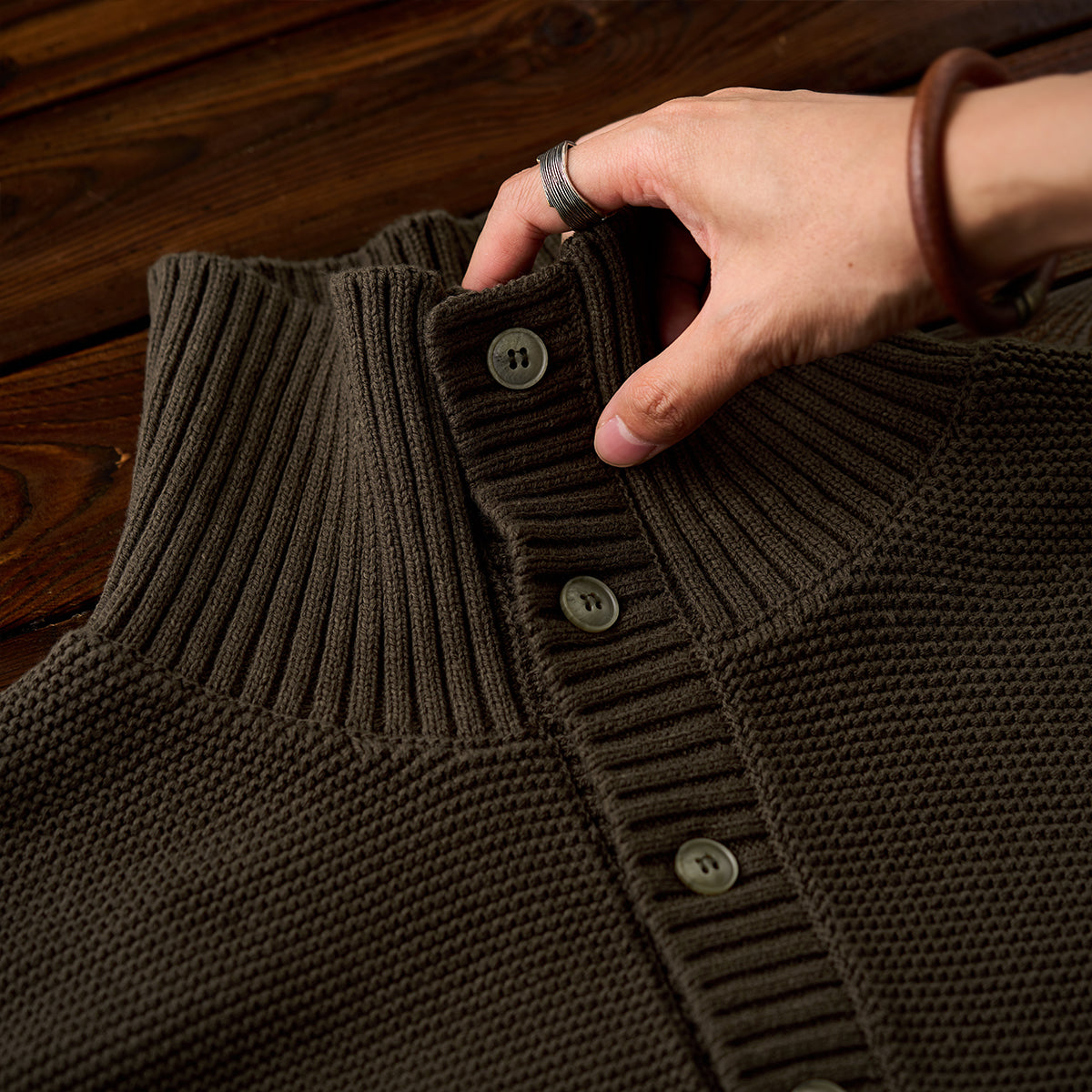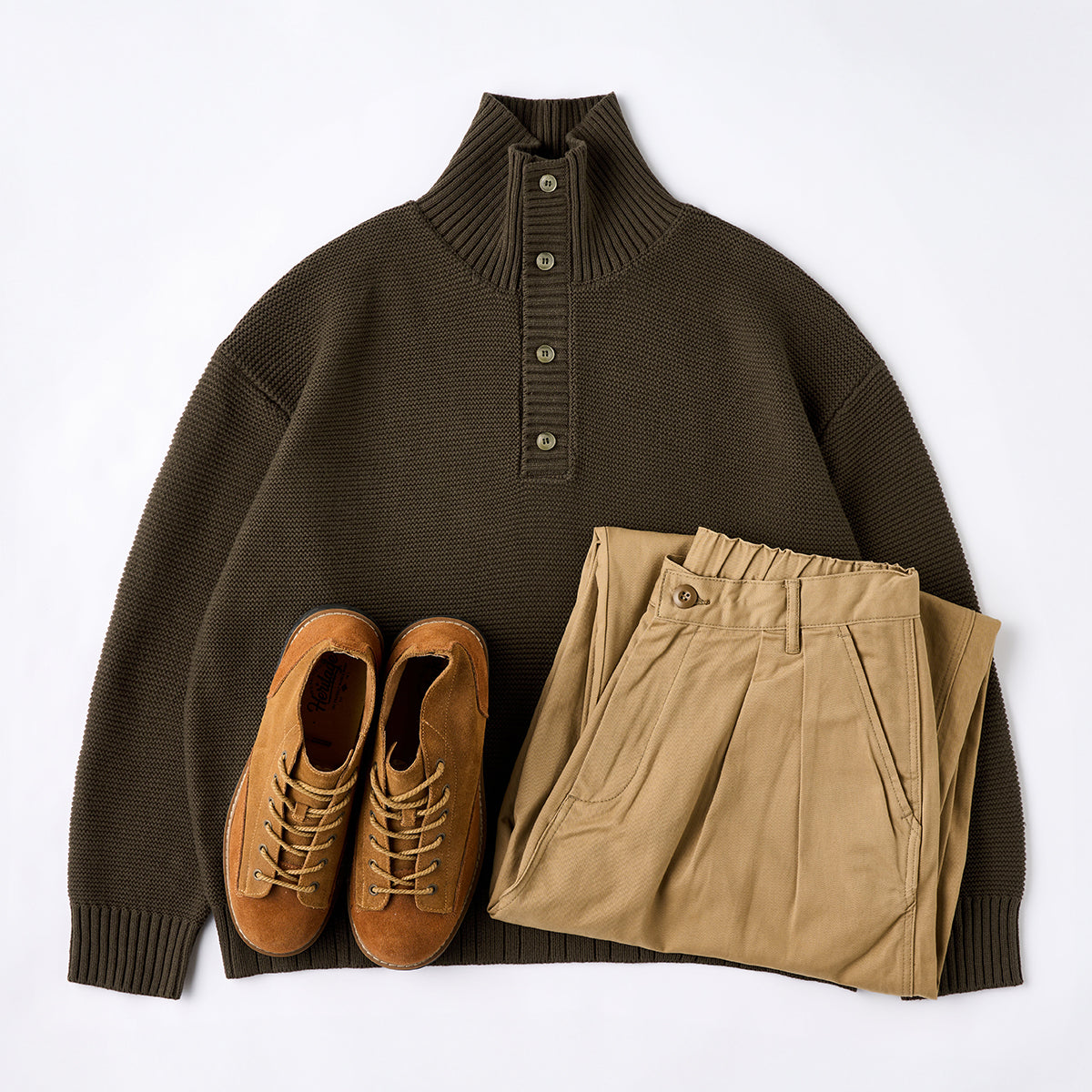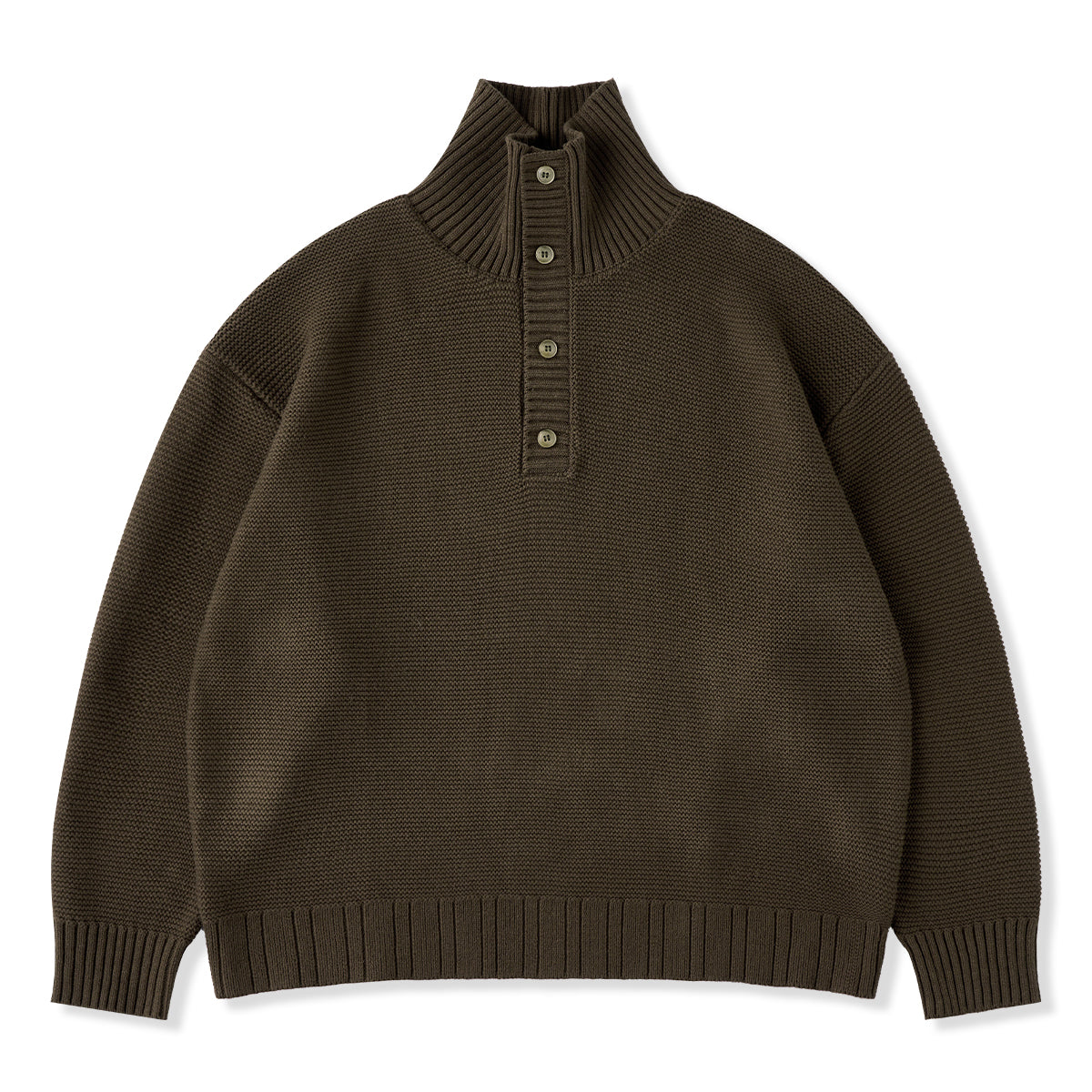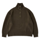 立体感のあるパイナップルパイル編みで仕上げた、表情豊かなハイネックニットセーター。ふっくらとした編地が空気を含み、軽やかであたたかな着心地を実現。襟元は2way仕様。ボタンを留めれば首まわりを包み込むハイネックに、開ければ自然な折り襟のようなシルエットに変化し、気分やスタイルに合わせたアレンジが楽しめます。柔らかな肌ざわりと程よいボリューム感で、秋冬のコーディネートに上品なアクセントを添える一着です。