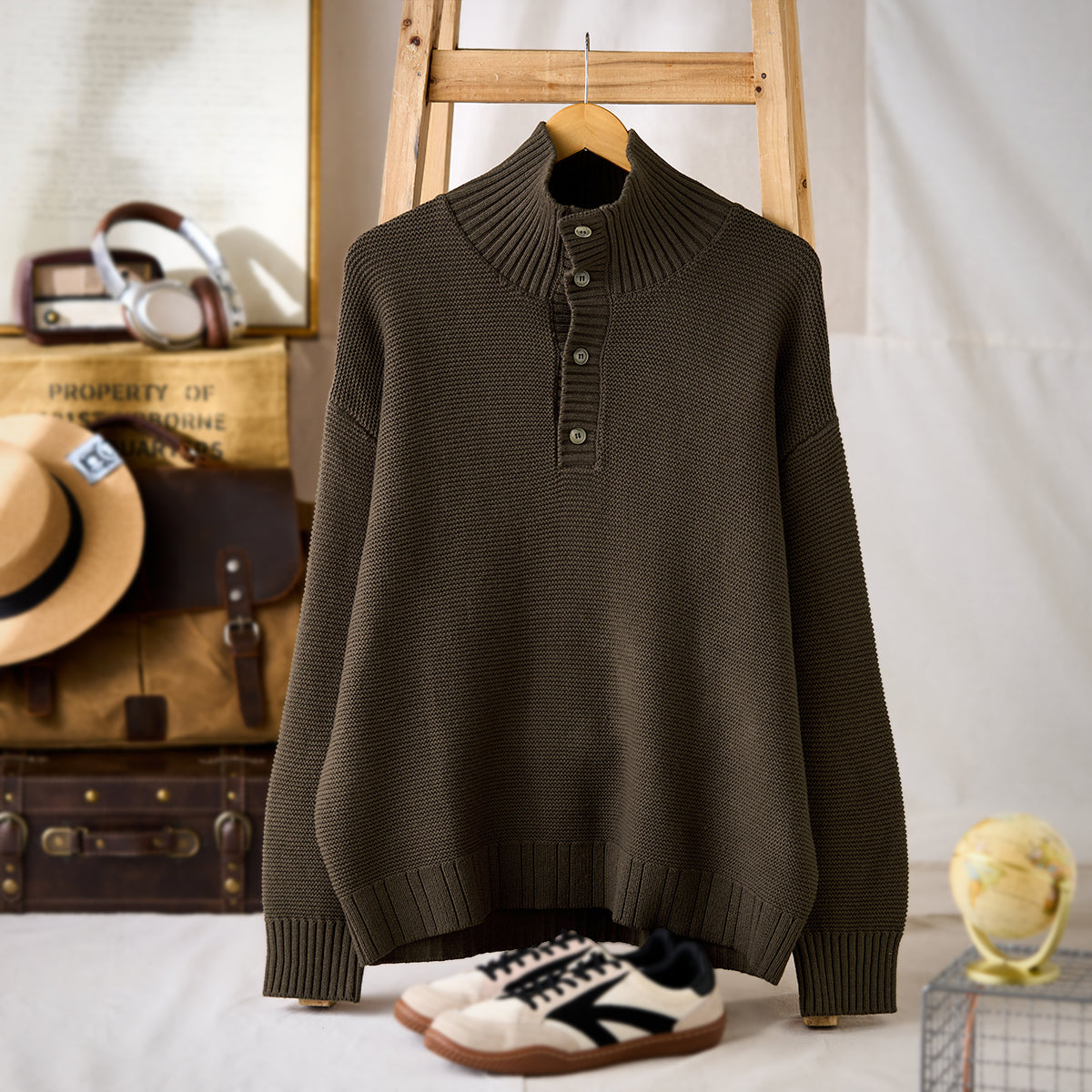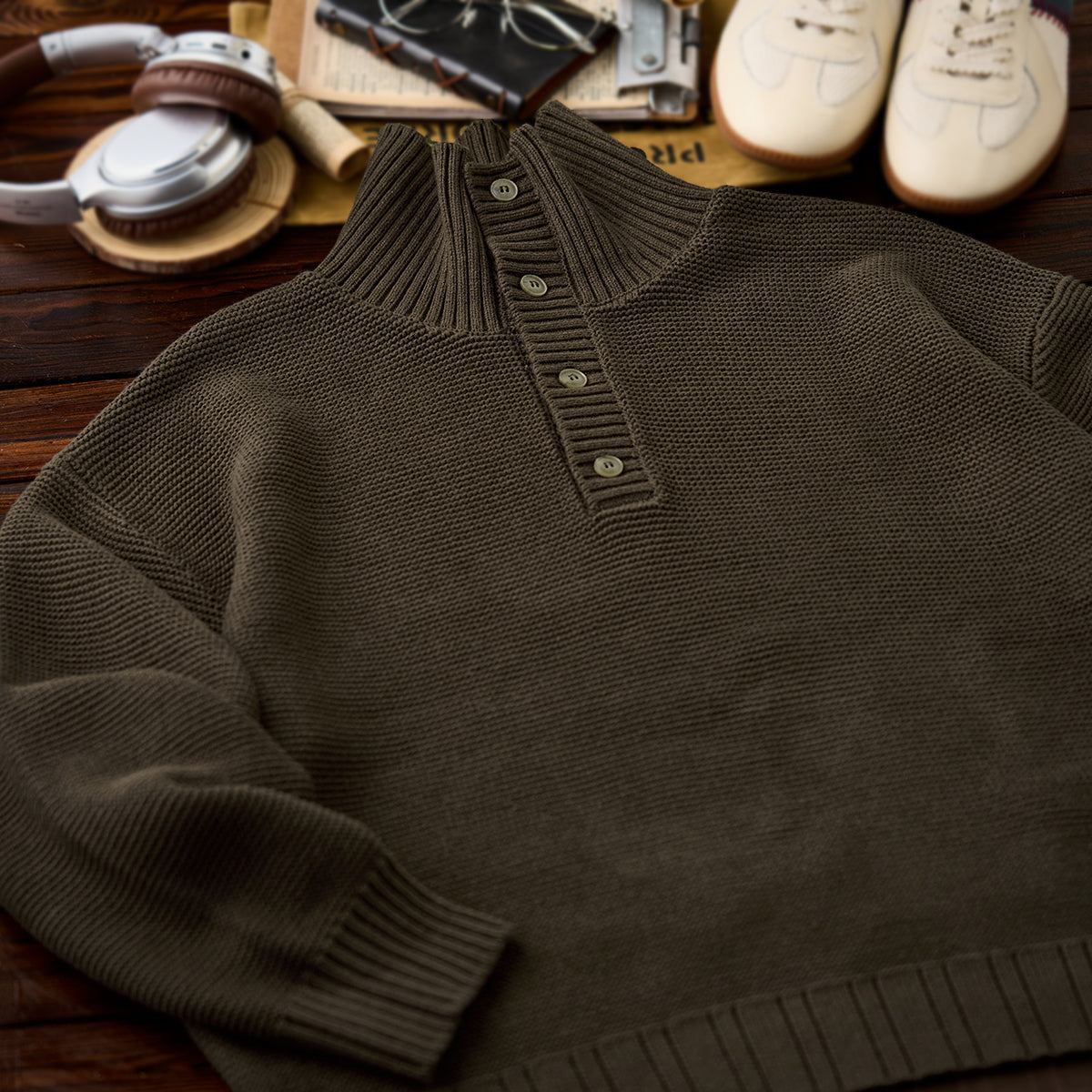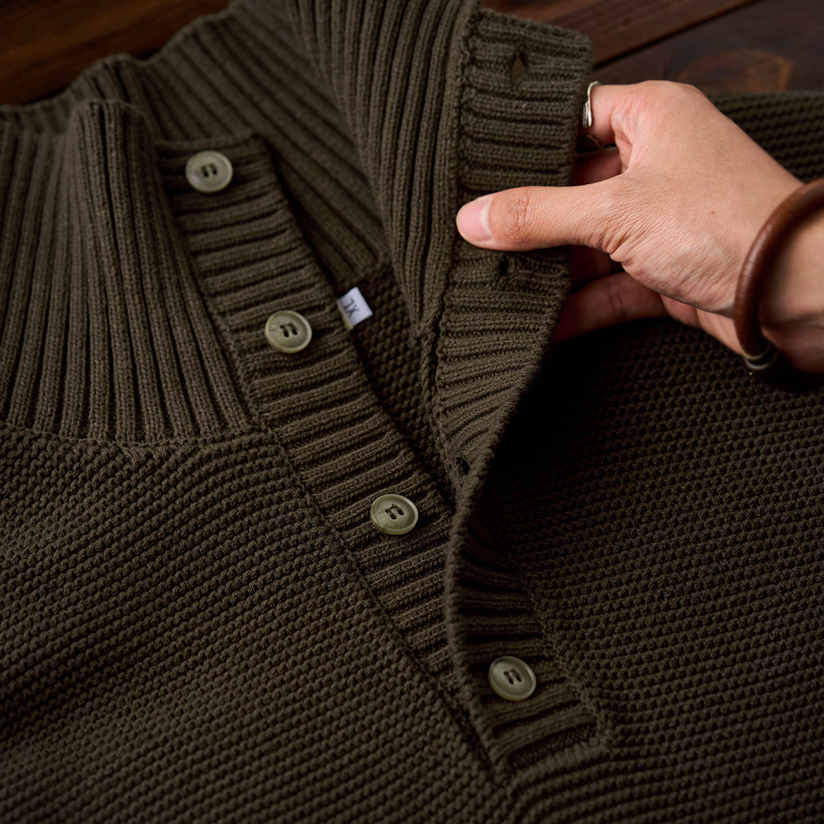 立体感のあるパイナップルパイル編みで仕上げた、表情豊かなハイネックニットセーター。ふっくらとした編地が空気を含み、軽やかであたたかな着心地を実現。襟元は2way仕様。ボタンを留めれば首まわりを包み込むハイネックに、開ければ自然な折り襟のようなシルエットに変化し、気分やスタイルに合わせたアレンジが楽しめます。柔らかな肌ざわりと程よいボリューム感で、秋冬のコーディネートに上品なアクセントを添える一着です。