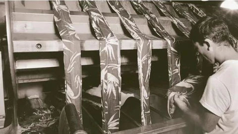 当時のアロハシャツの生地を製作、輸出していたのは主に日本だ。とりわけ友禅をはじめ染織の中心地である京都や大阪は、戦時中を除きアロハシャツの黎明期から最盛期を支えた重要なテキスタイル産地であった。文様の意味を損なうことなく自由闊達に布地に描かれた和柄もあれば、ハワイらしいトロピカルな柄も日本でデザインされていた。アロハシャツ発展の歴史には日系人のみならず日本という国も深くかかわっていたのだ。