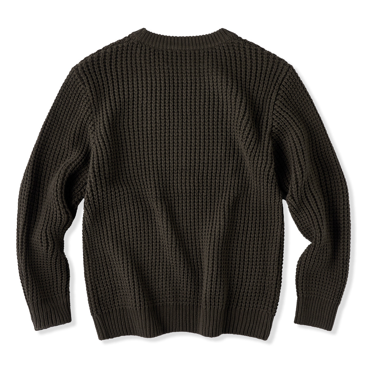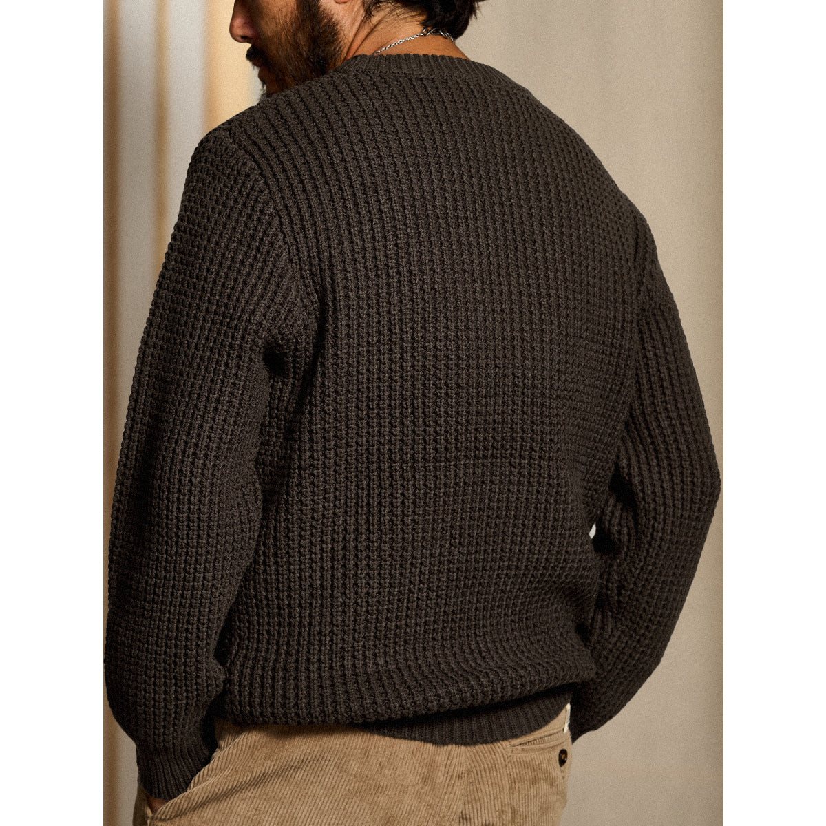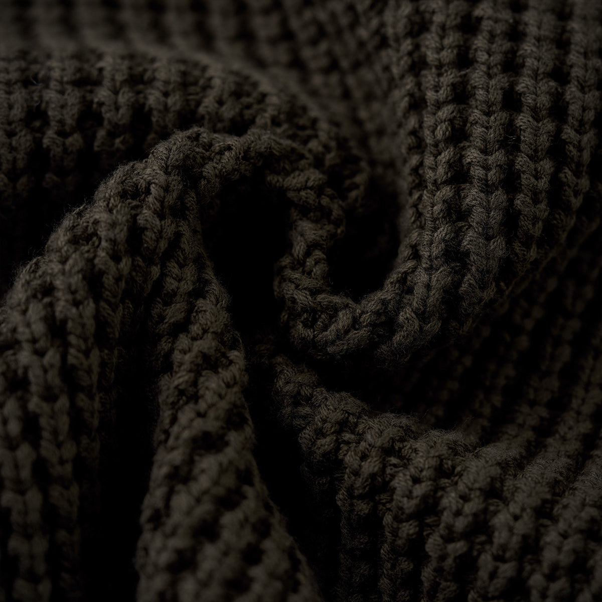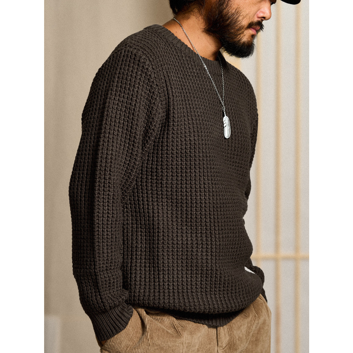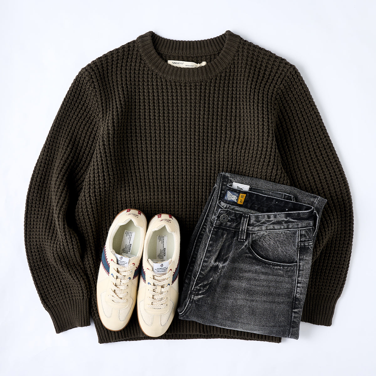 スウェットのような雰囲気を出すために襟、袖と裾にリブ編みの切り替えを施した、さりげないディテールが光るデザインがポイント。毎シーズン人気ののワッフル編みにした。凸凹のあるふっくらとした見た目は高級感もあり、秋冬のコーディネートの主役として使っていただけます。目の粗いワッフル編みと落ち着いたコーヒー色で仕上げたため、シンプルなデザインで着回しやすいのが魅力。デイリーはもちろん、お出掛けやデートなど、幅広いシーンで活躍してくる一点。すっきりとしたジャストサイズでレイヤードには最適です。柔らかな肌触りと、保温性の高さが魅力のコットンアクリル混紡した素材を使用し、着心地と保温性が優れた。アウターとしても、インナーとしても活躍する、秋冬の着こなしに欠かせない一点。ワイドパンツやタイトなトラックパンツを合わせたシルエットで魅せるコーデはもちろん、スウェットパンツと合わせればこなれ感のあるリラックススタイルでも着こなせます。