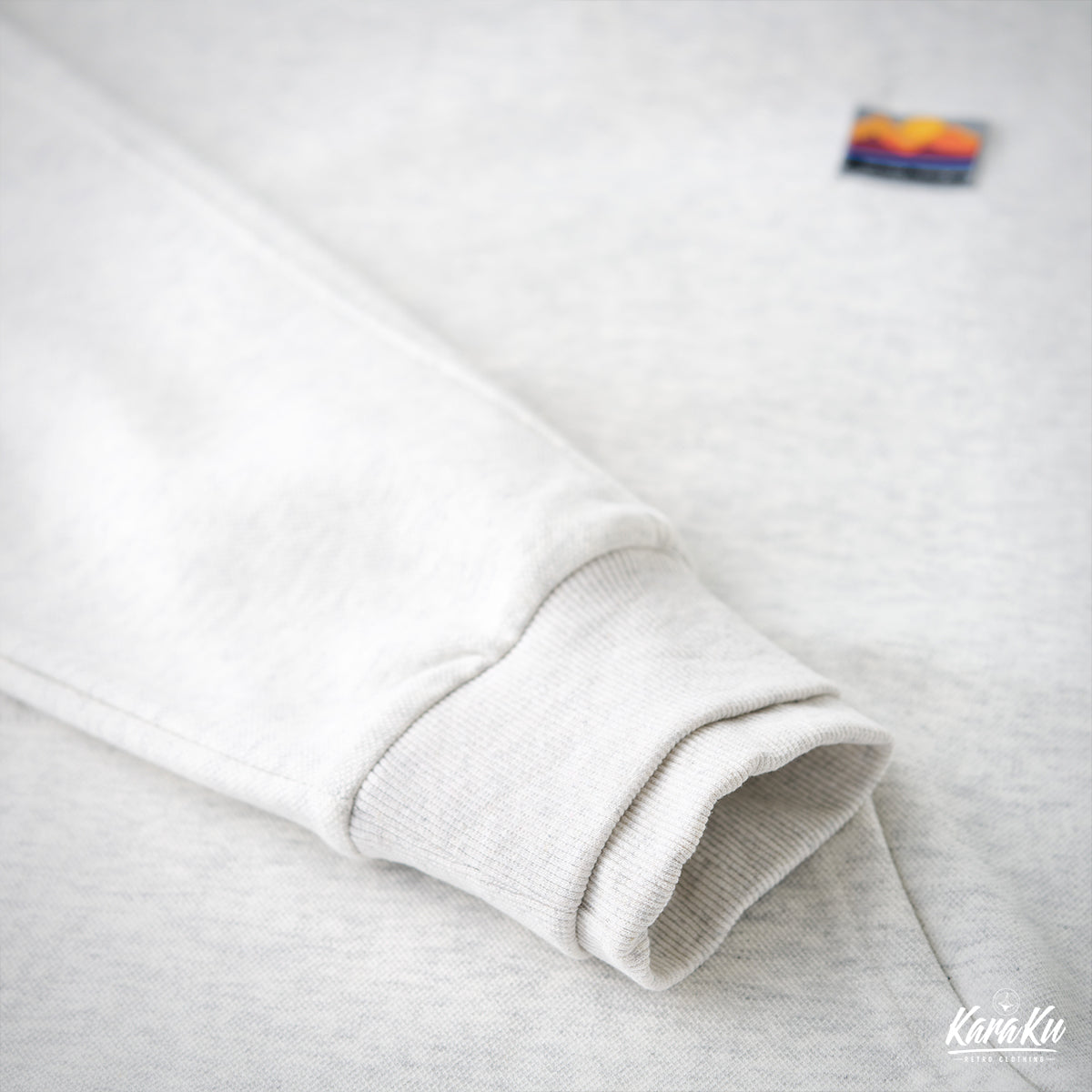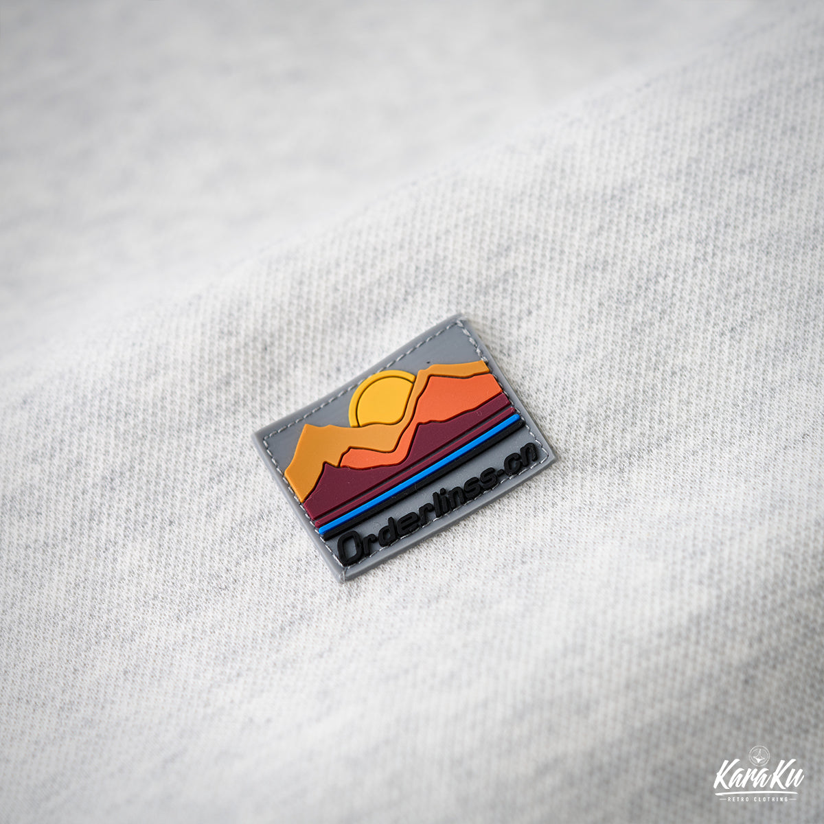 胸元の小さなロゴデザインが特徴的、ロゴには山や自然をモチーフにしたイラストが描かれて、アウトドアやナチュラルなイメージを感じさせる。