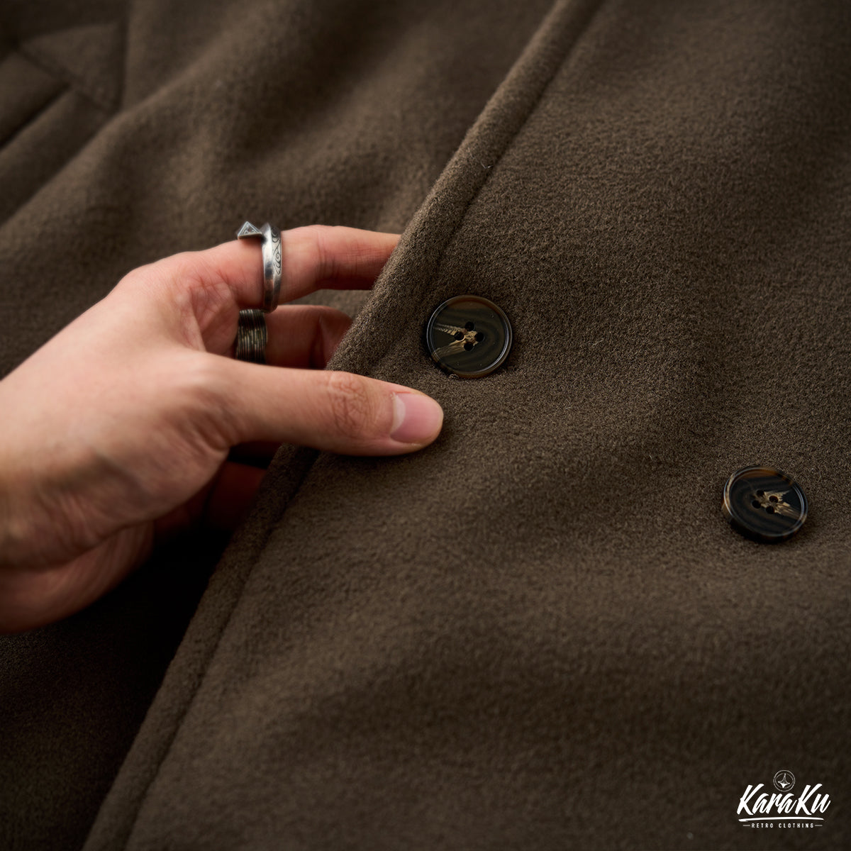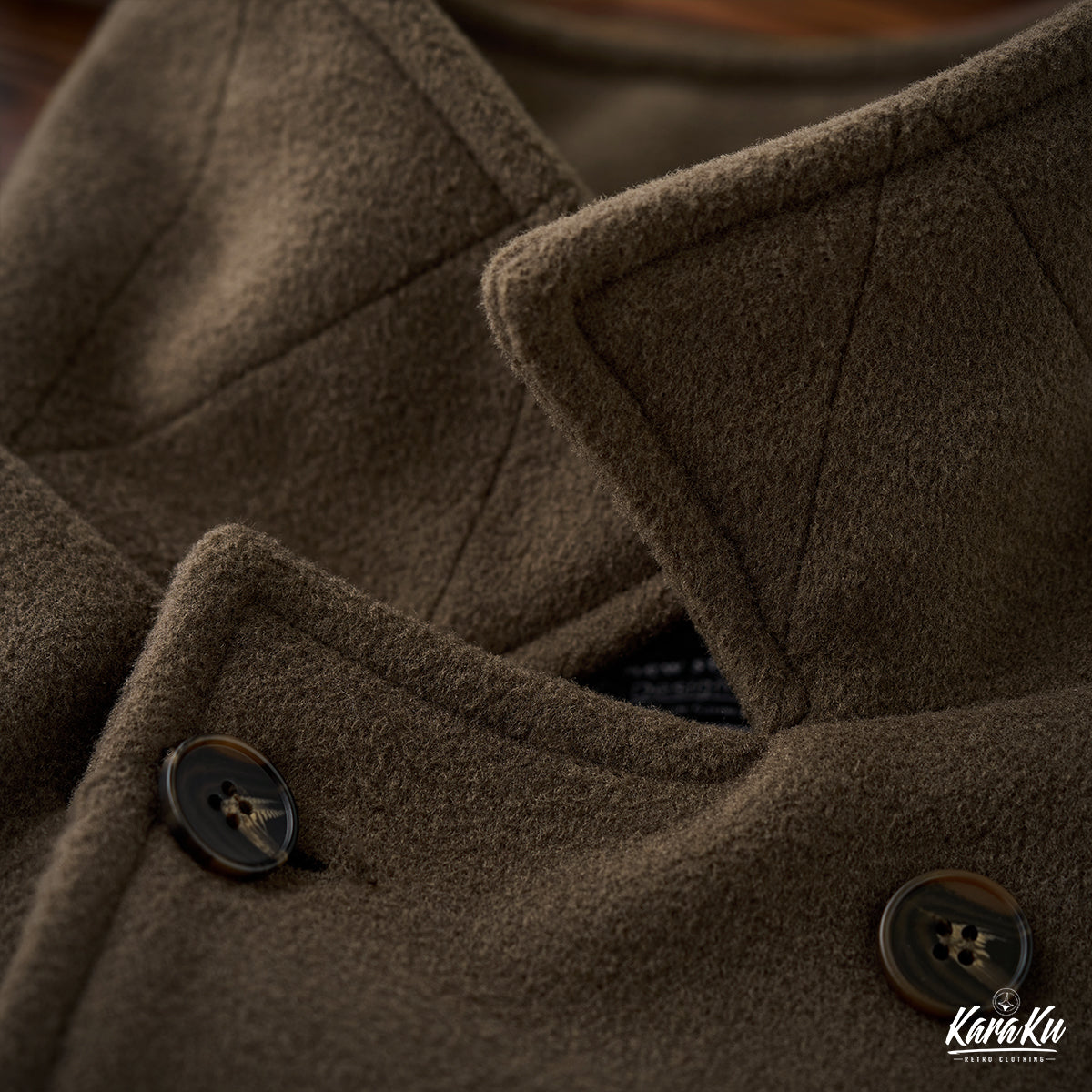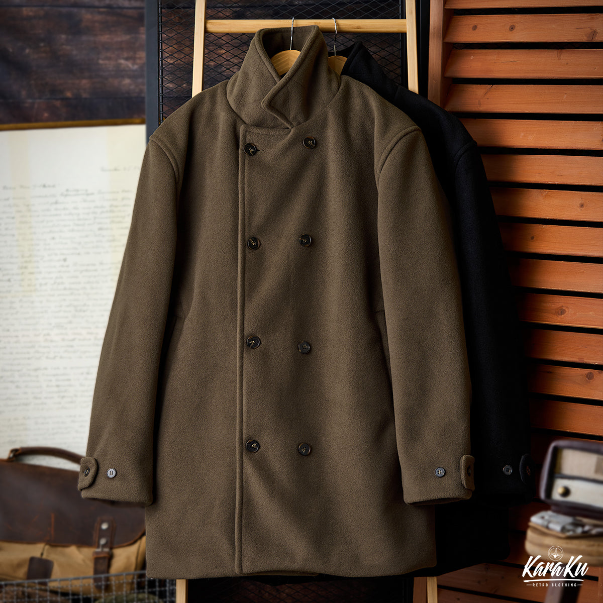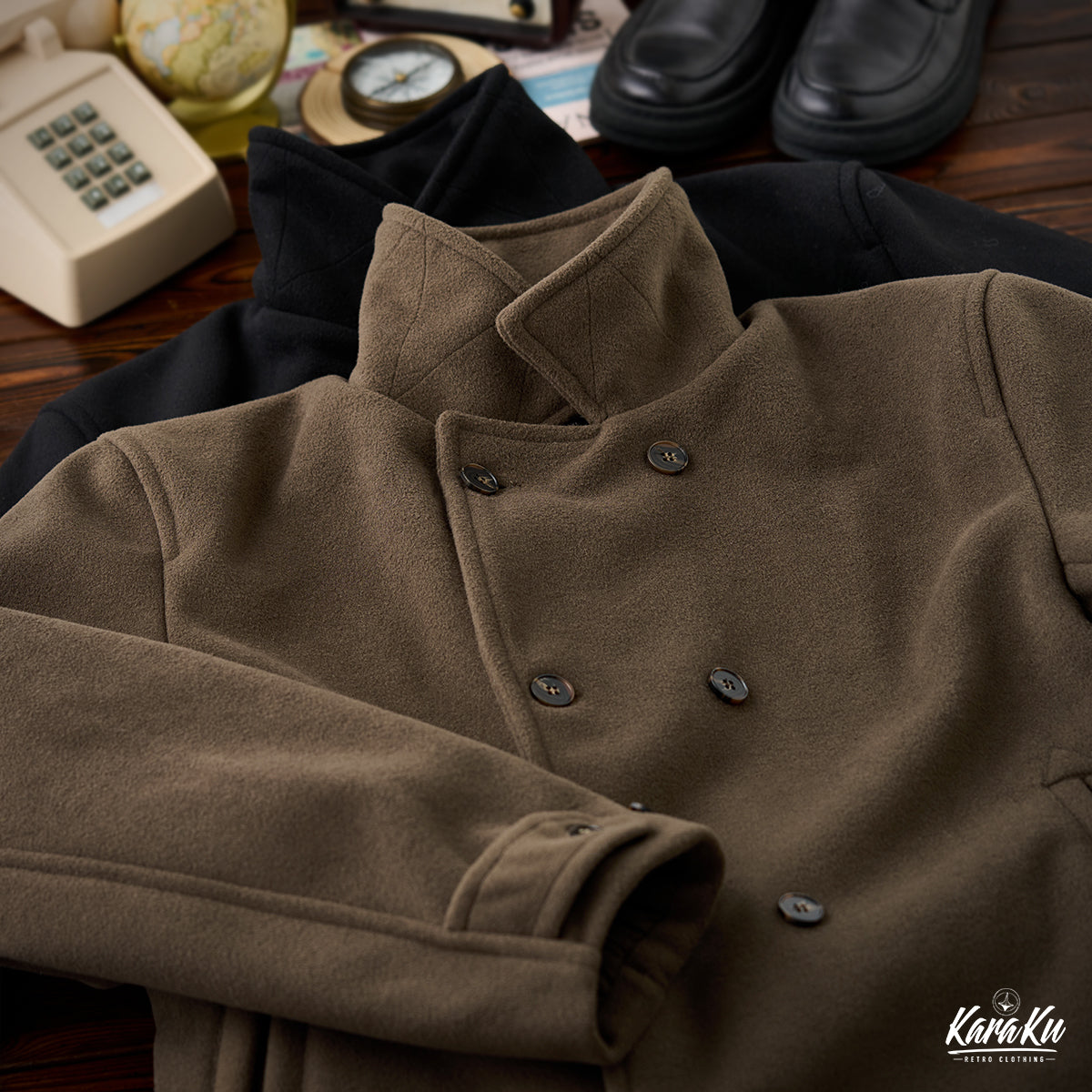 ダブルブレストのデザインは、ピーコートの伝統的な特徴であり、上品でフォーマルな印象を与える。