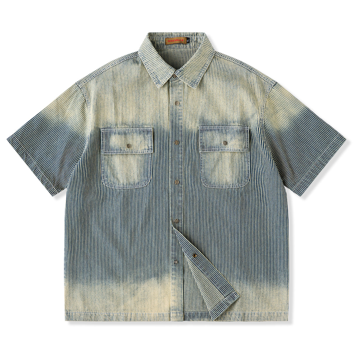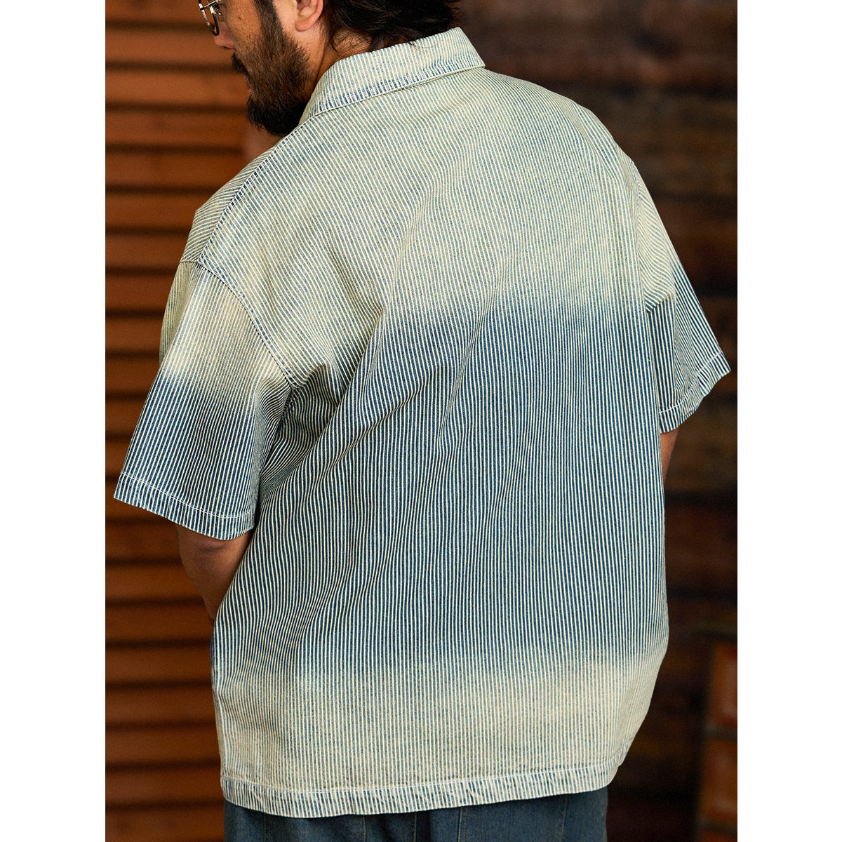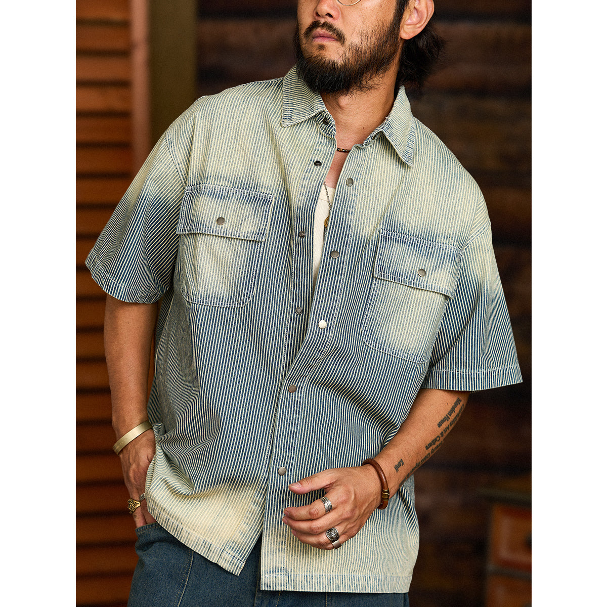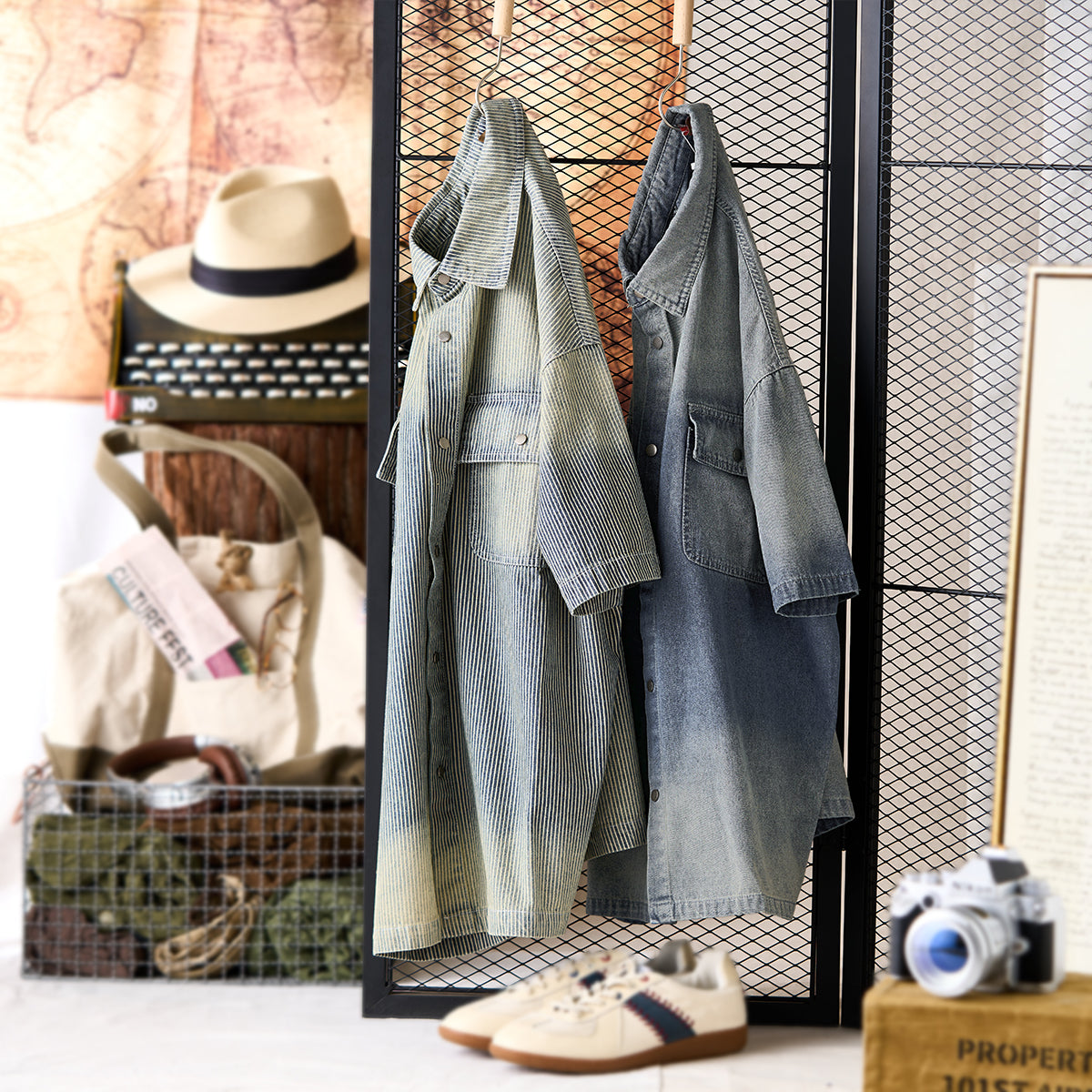 ストライプ柄&無地選べる ウォッシュド加工半袖デニムワークシャツ
