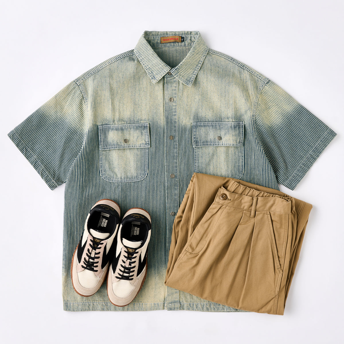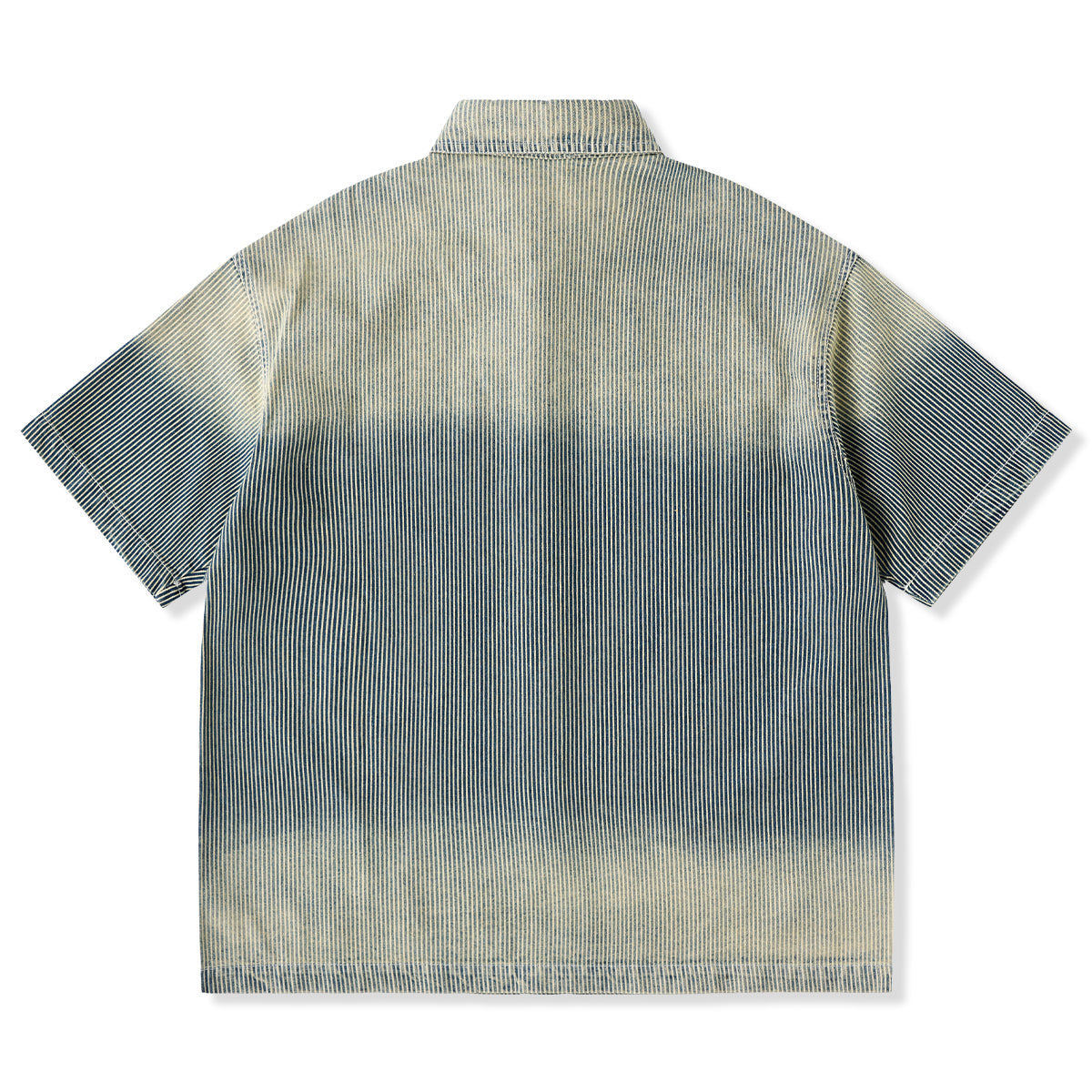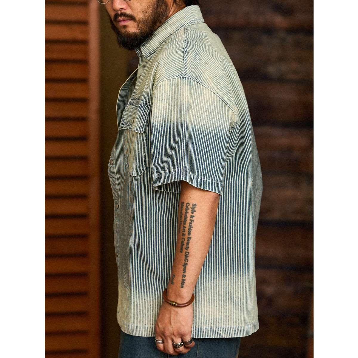 ストライプ柄&無地選べる ウォッシュド加工半袖デニムワークシャツ