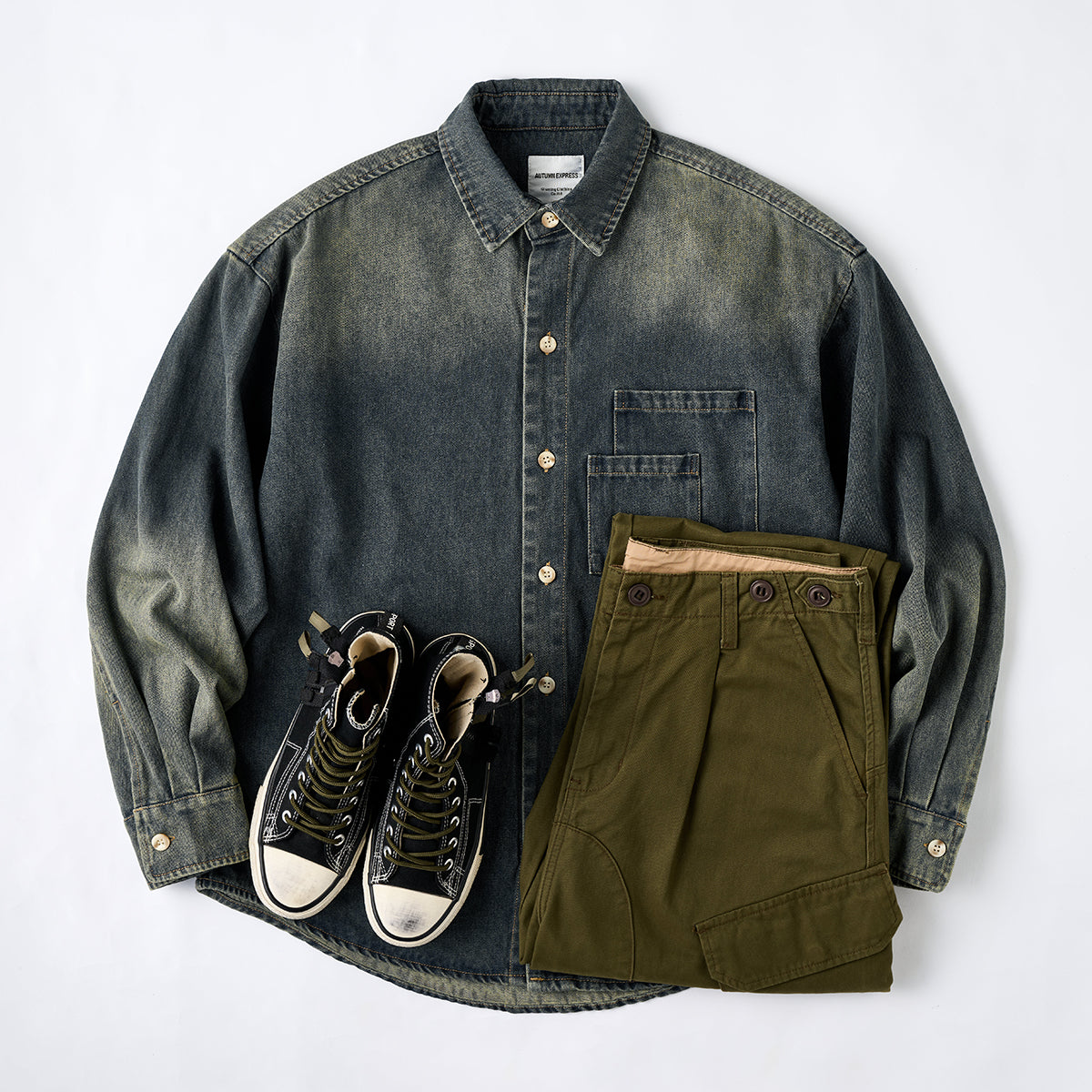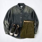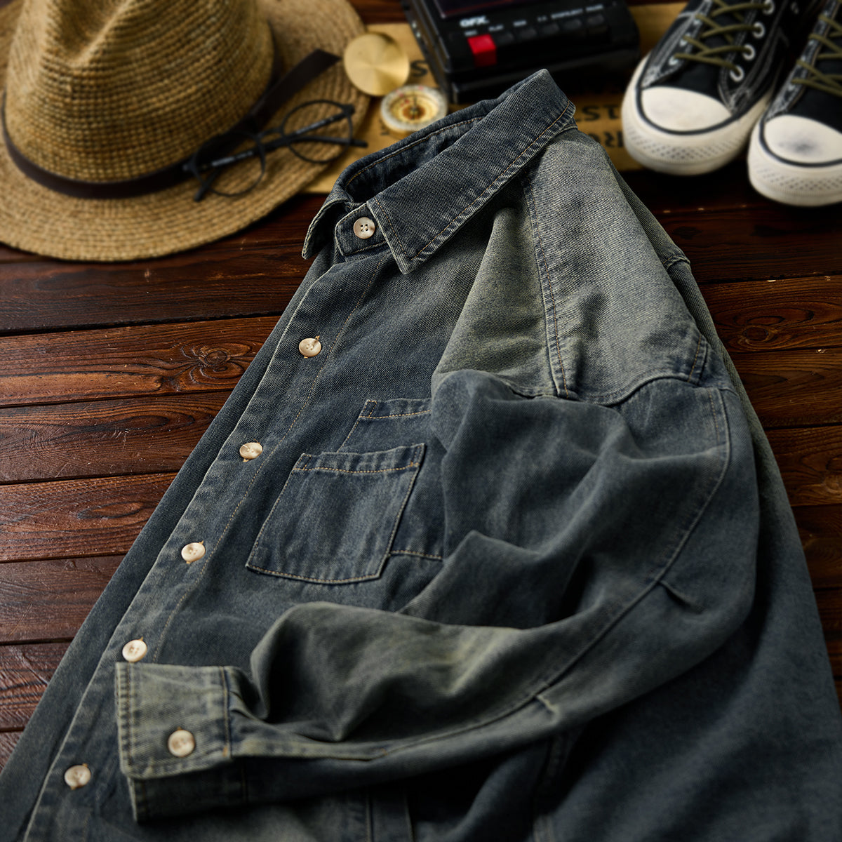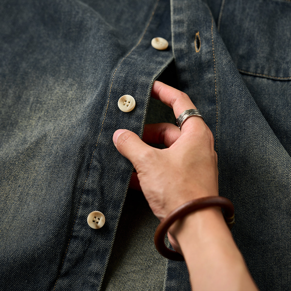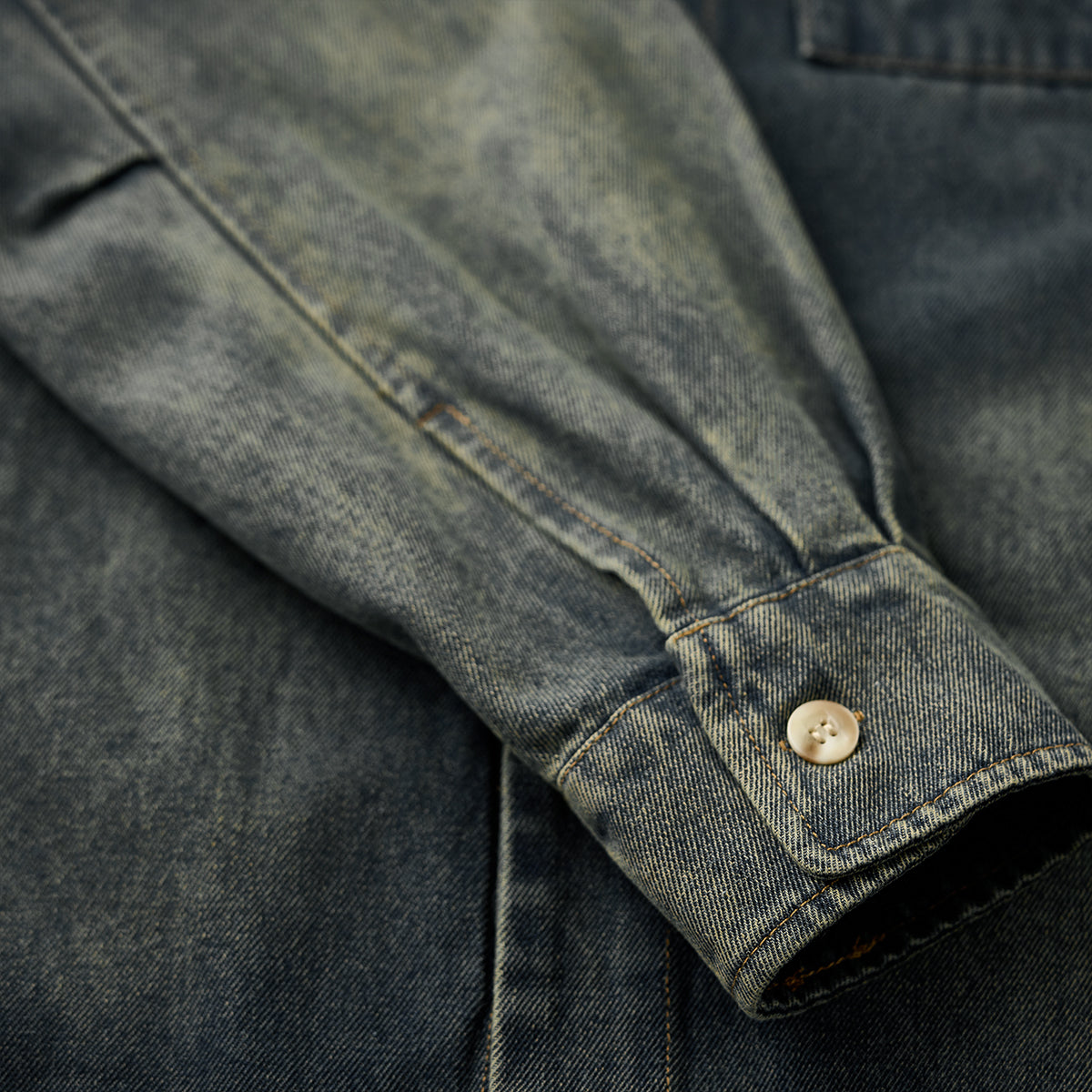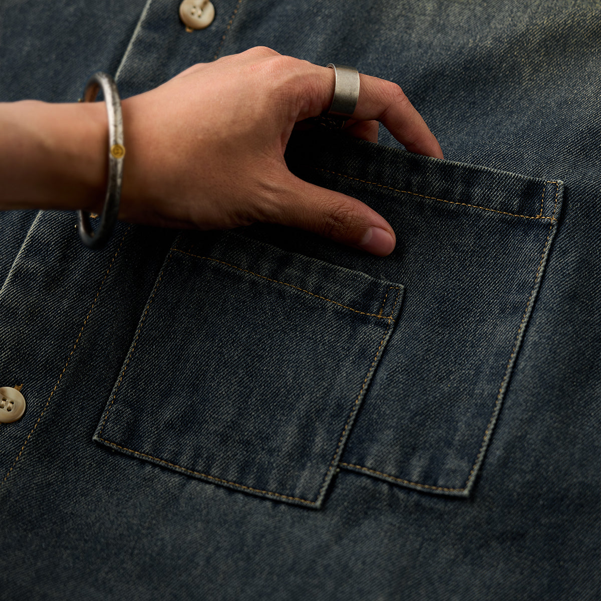 重ねる胸ポケット付き ウォッシュ加工デニム長袖シャツ
