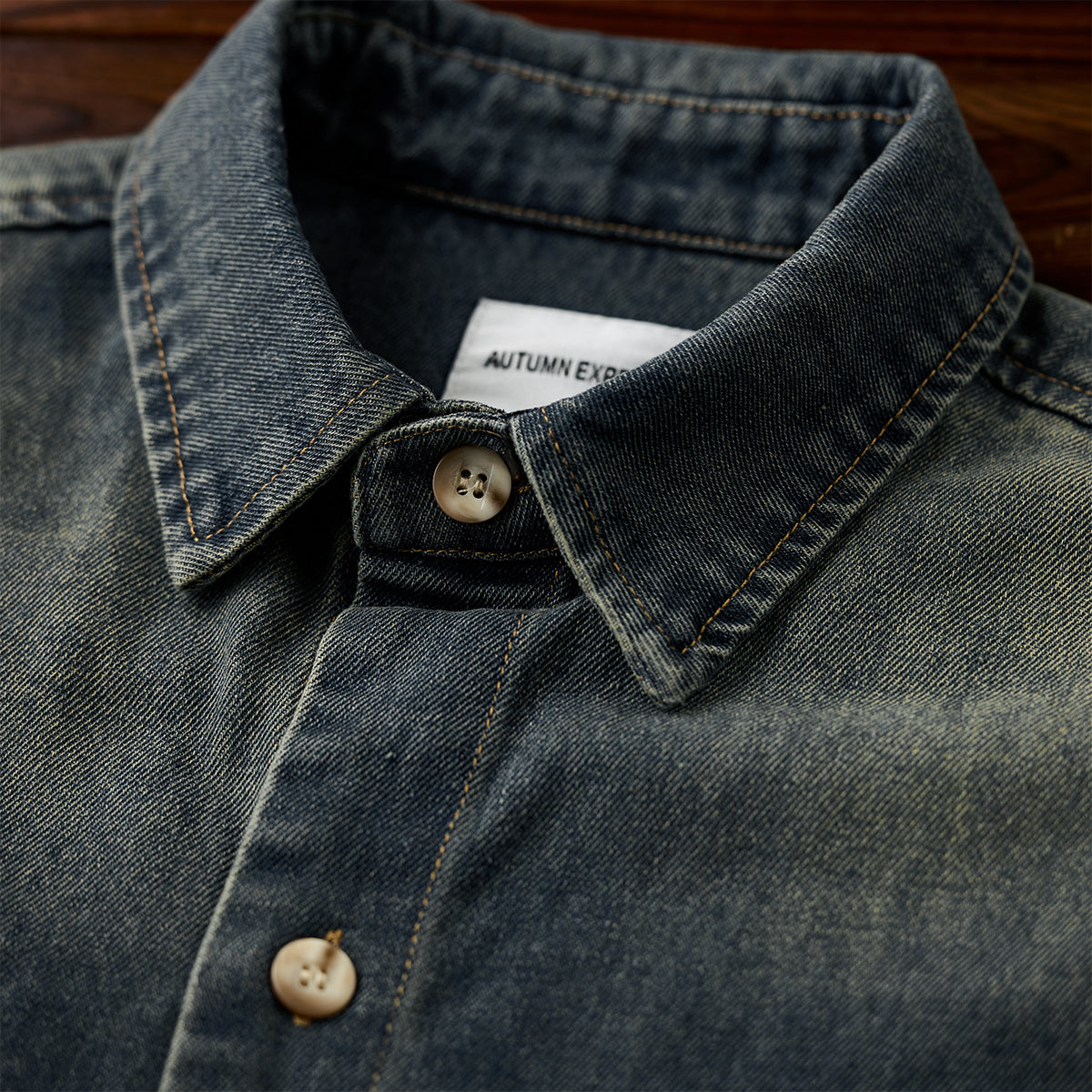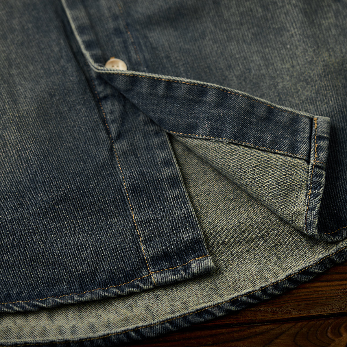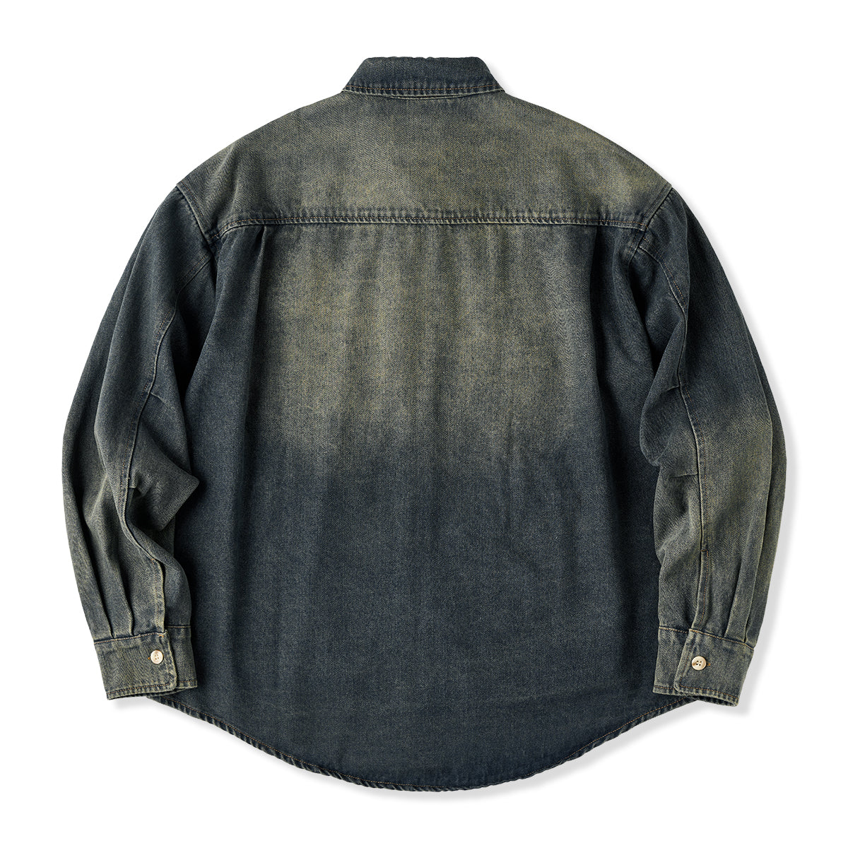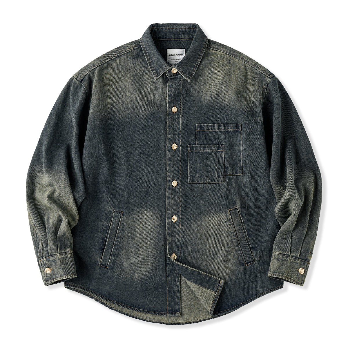 重ねる胸ポケット付き ウォッシュ加工デニム長袖シャツ
