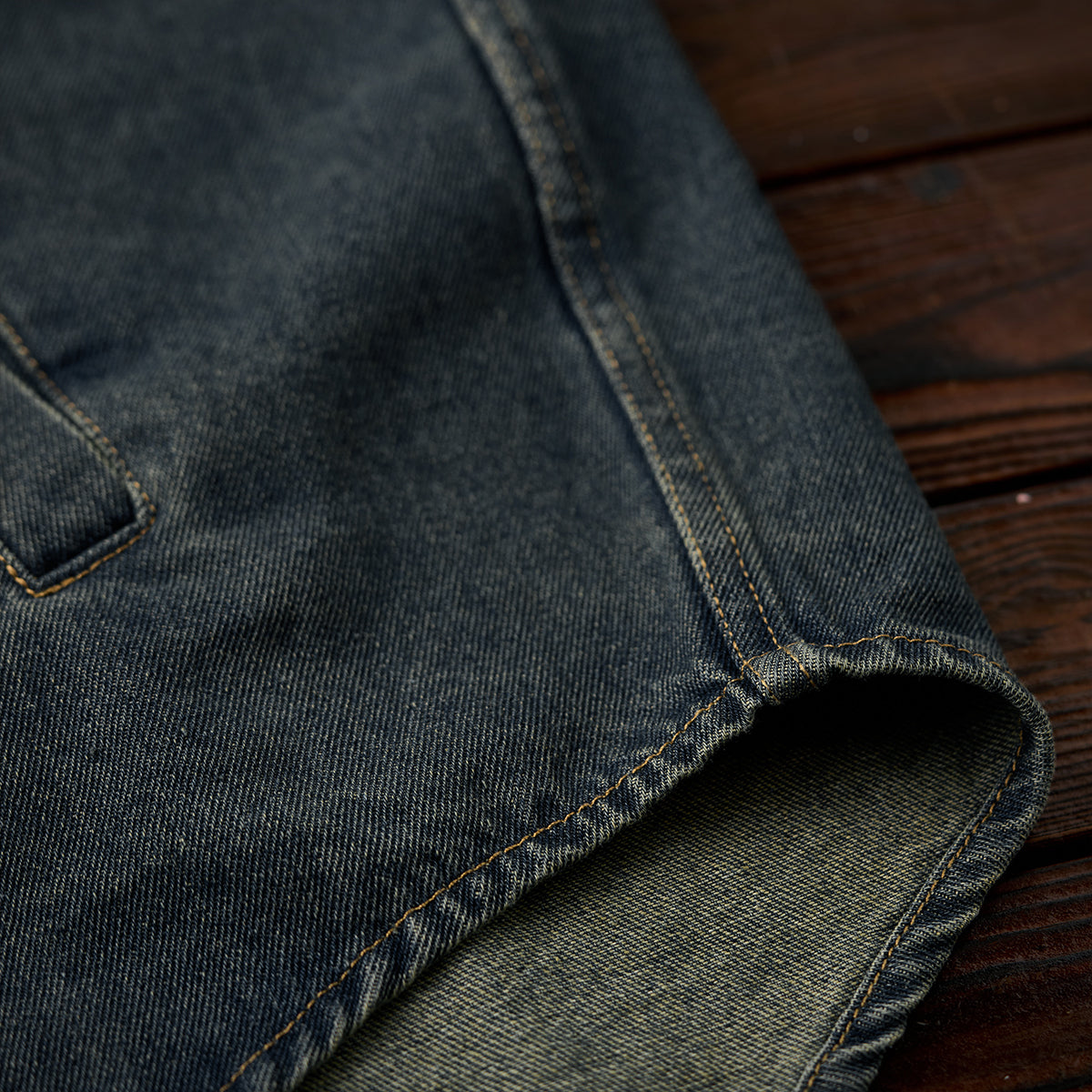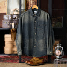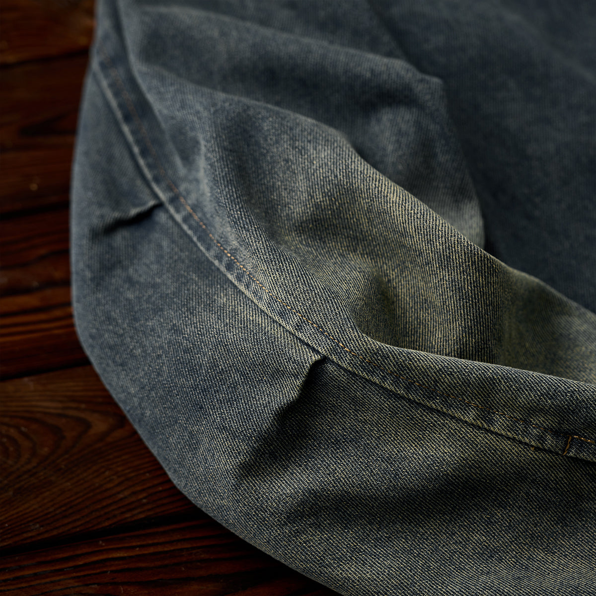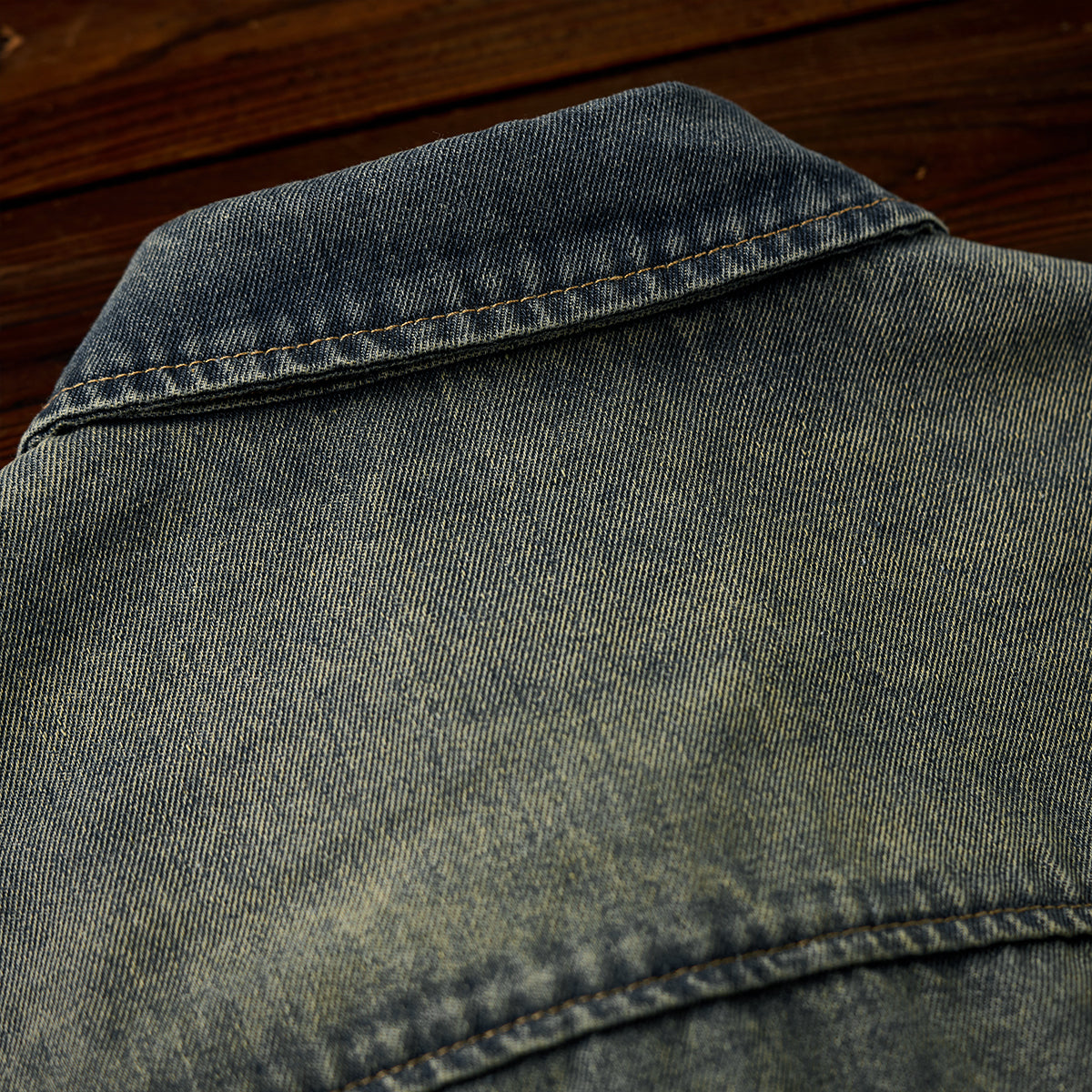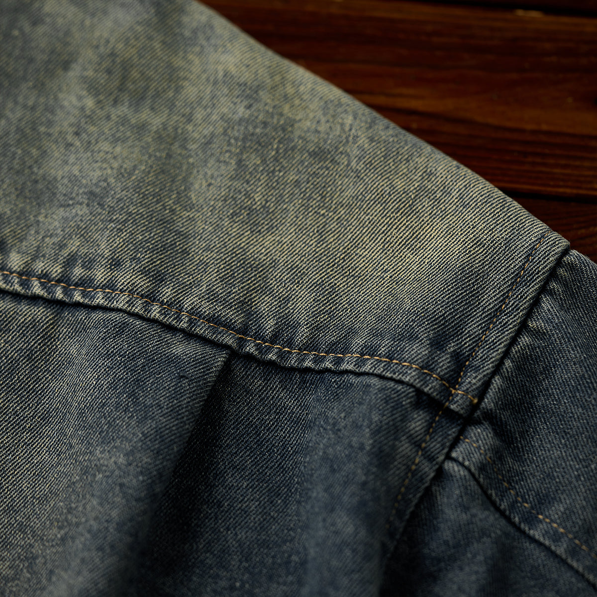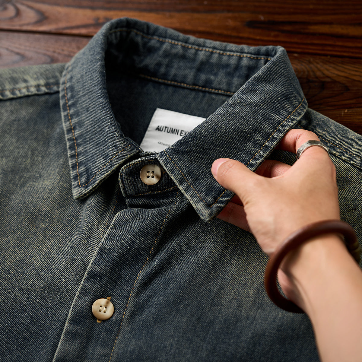 重ねる胸ポケット付き ウォッシュ加工デニム長袖シャツ
