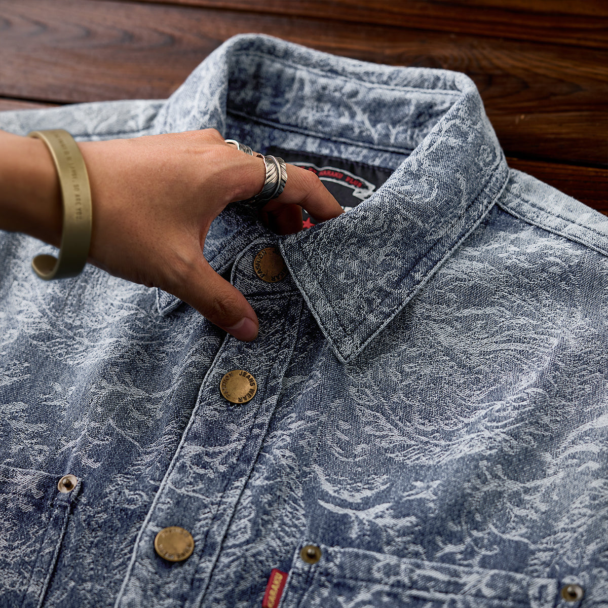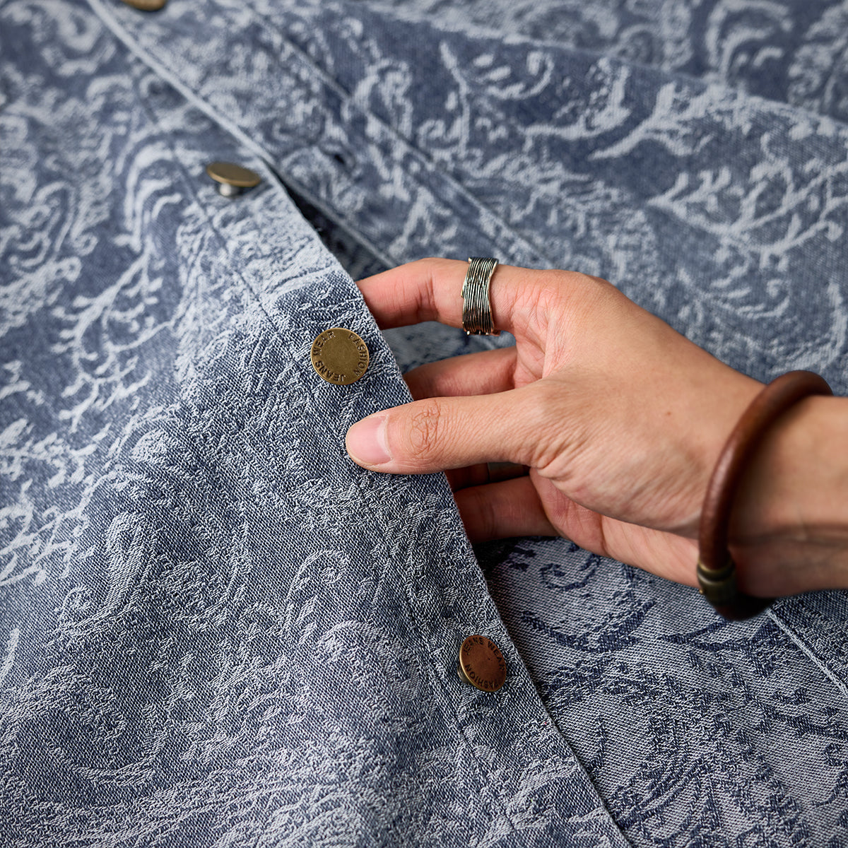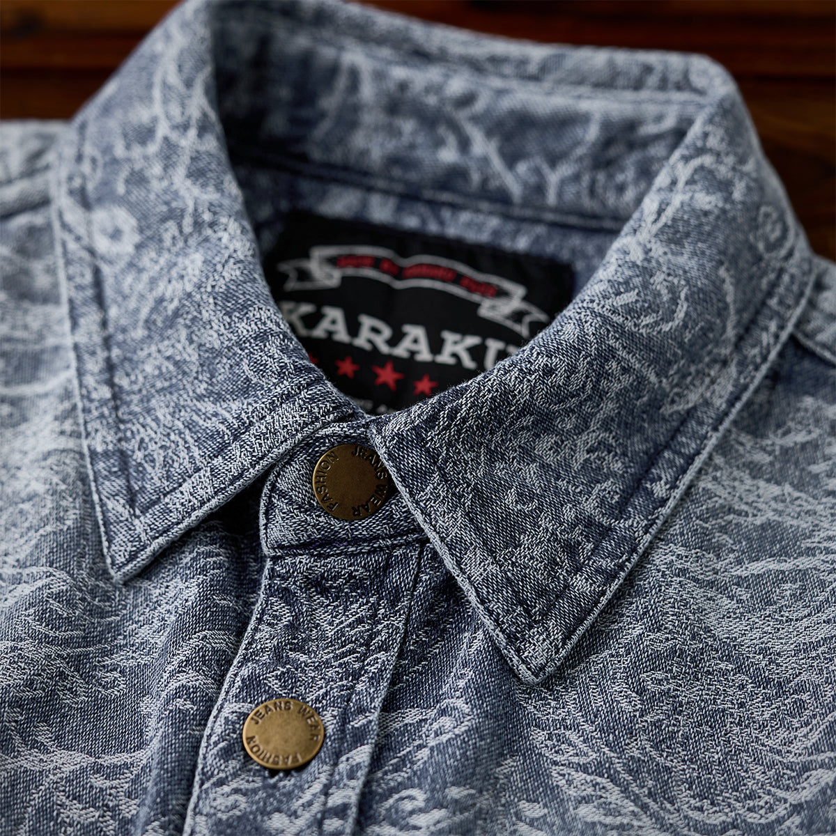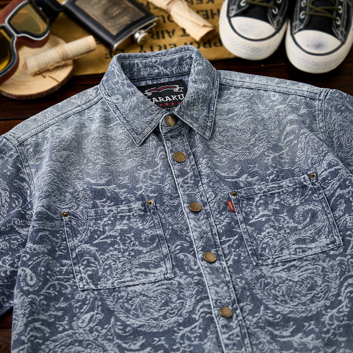 ジャガードペイズリー柄ユーズド加工デニムシャツ