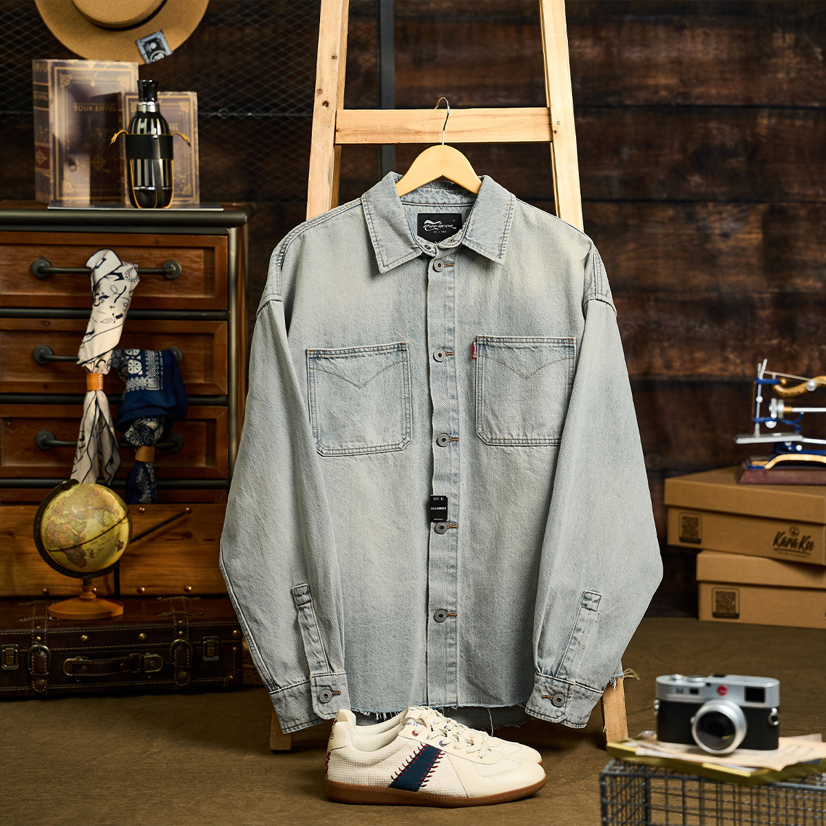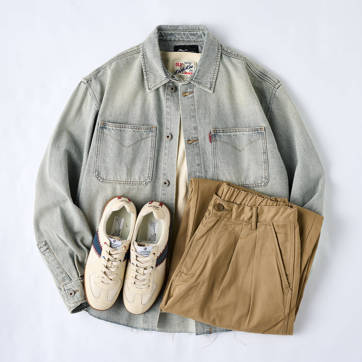 デニムやチノパンと合わせて、ヴィンテージ感を活かしたスタイルが似合います。アクセサリーとして、ブーツやキャップを取り入れることで、さらにワークウェア感を強調できます。