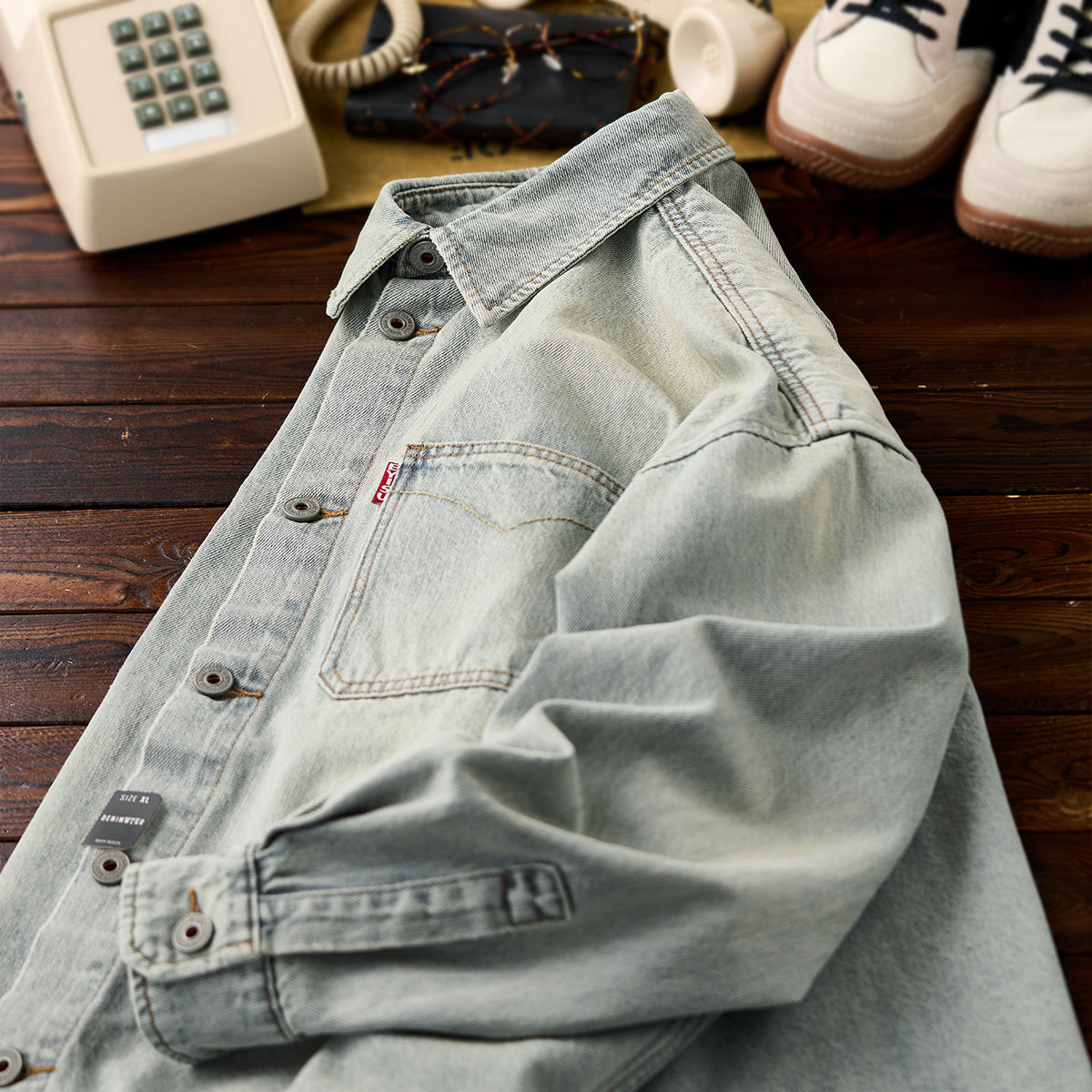 丈夫で耐久性のあるコットン混紡デニム素材を使用して、カジュアルかつワークウェアとしての実用性を備えています。