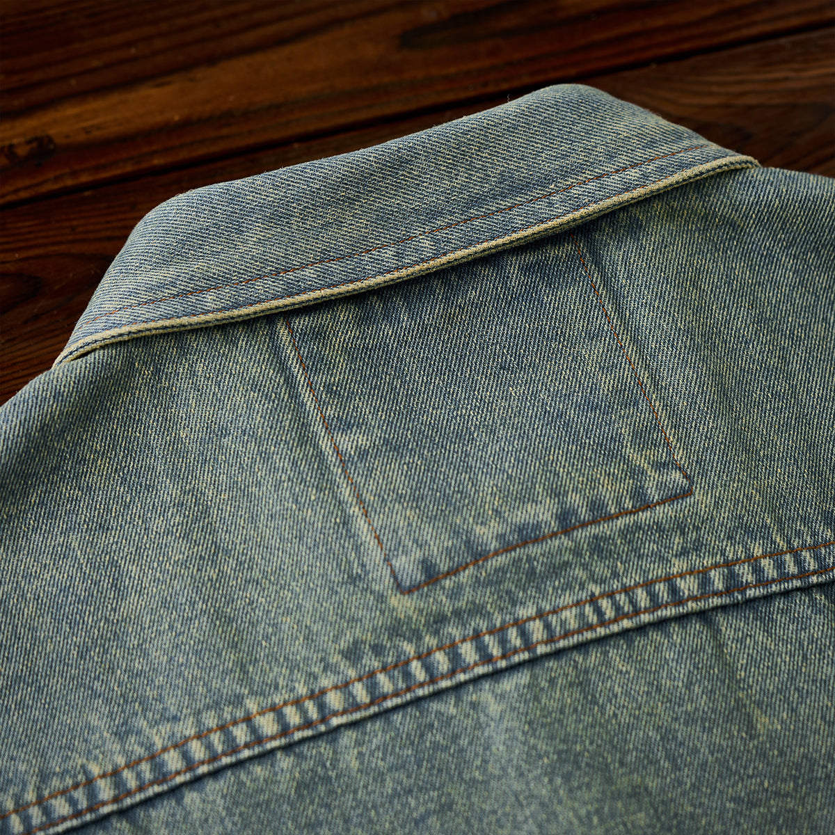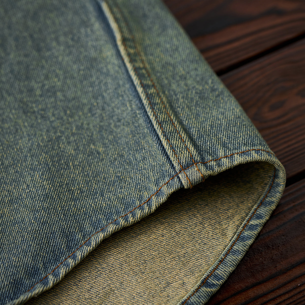 中厚手のデニム素材が使用されている。ユーズド加工&ウォッシュ加工が施され、部分的に色褪せたような表現が全体のヴィンテージ感を引き立てている。