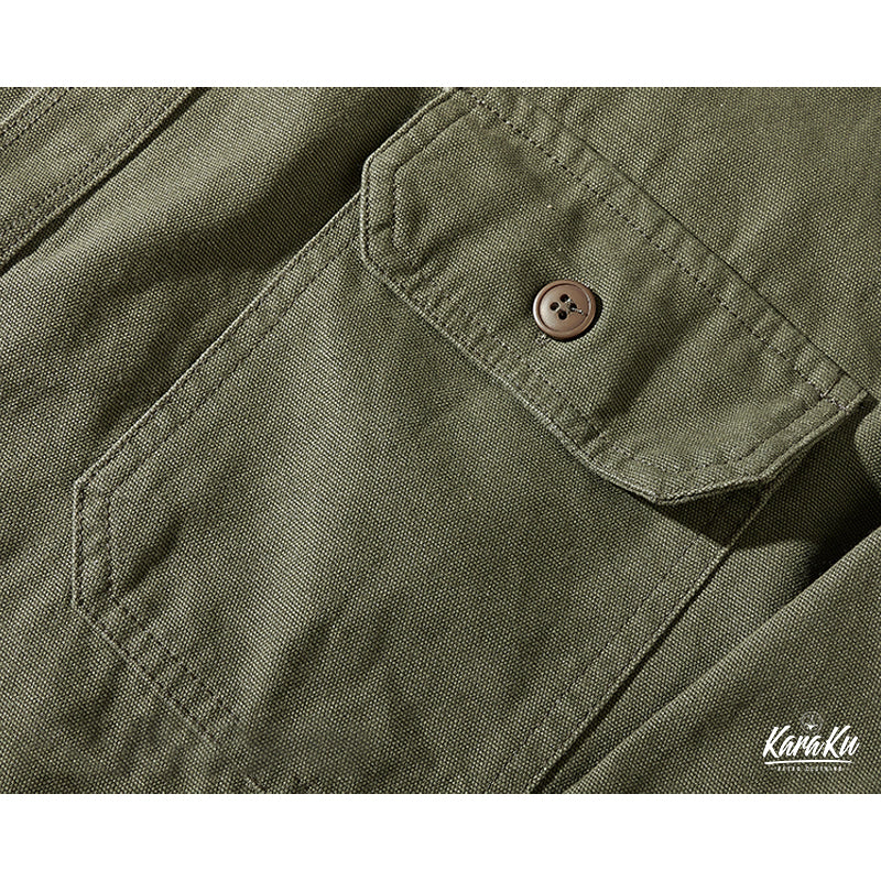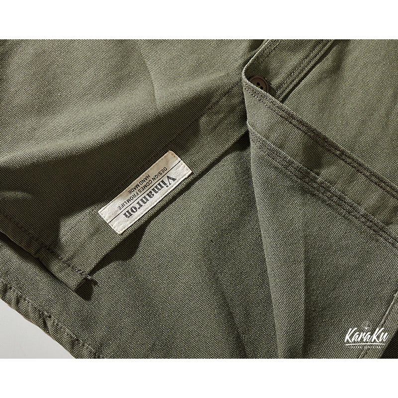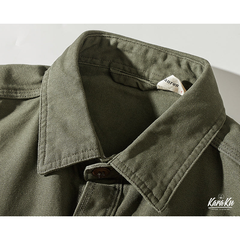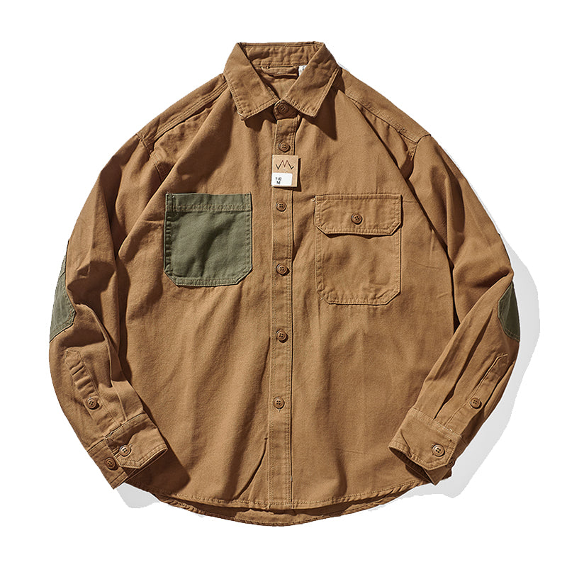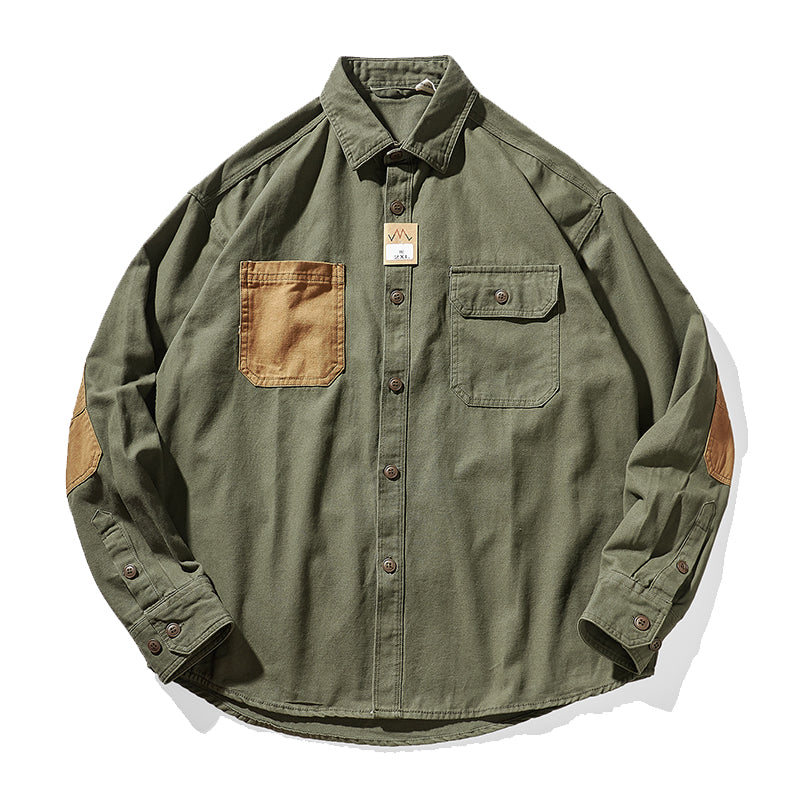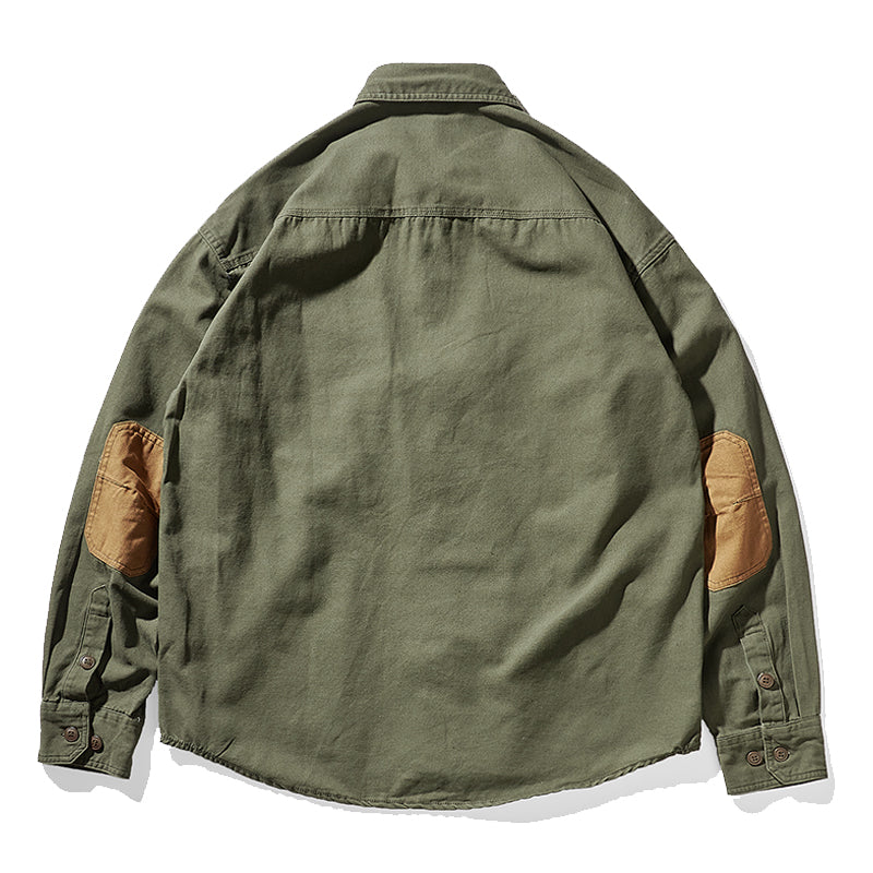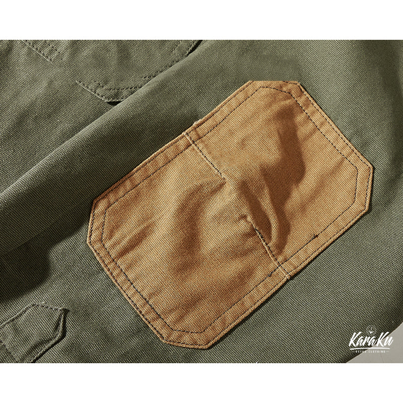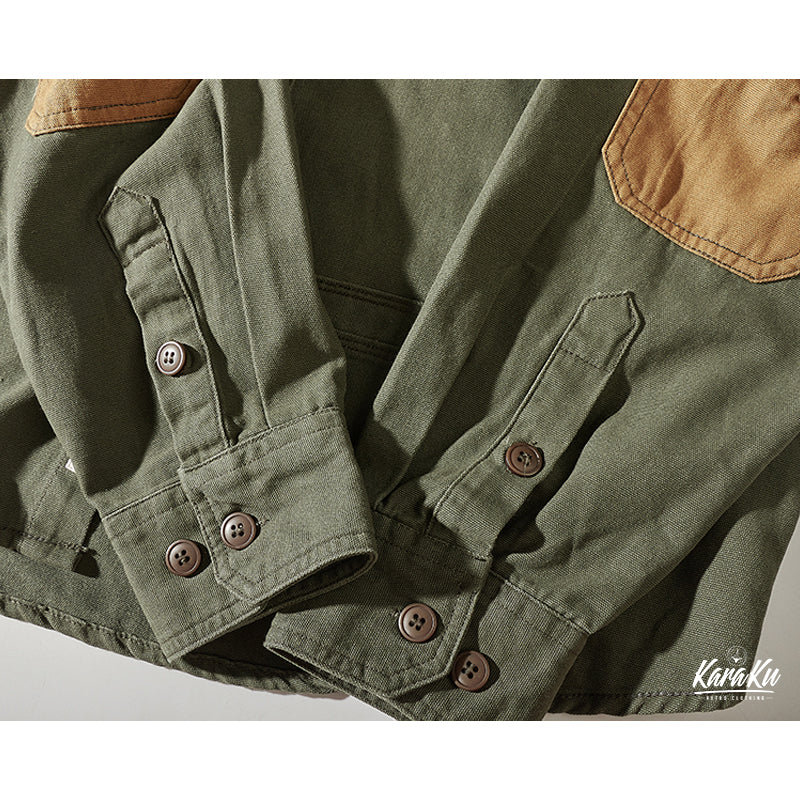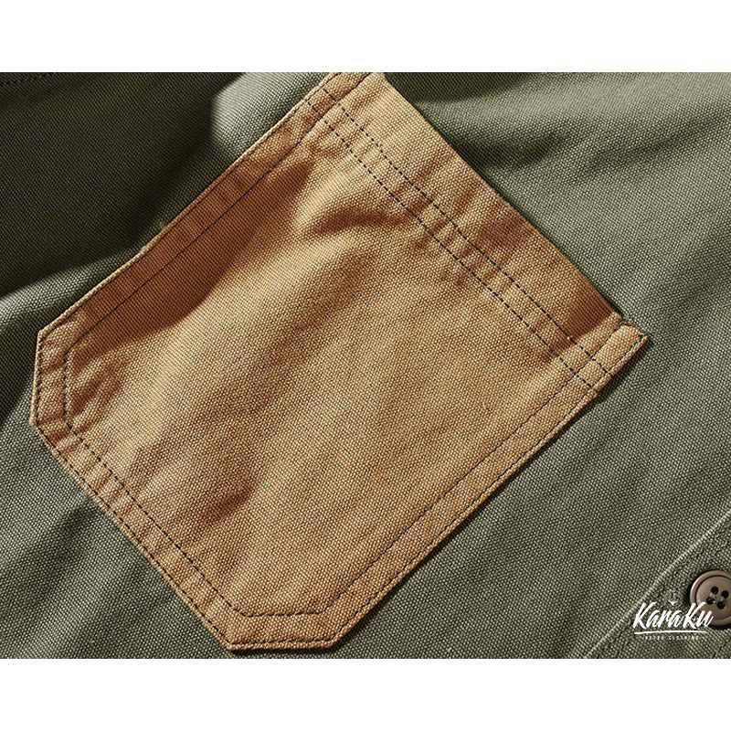 右胸元と両肘に配色のパッチワークデザインが目を惹く、ヴィンテージ感のある風合いも演出、1着でも十分な存在感を放つ。袖口はボタン付きで調整可能、シンプルのデザインは洒脱でこなれた雰囲気になること間違いなし。肩を絶妙にドロップさせ、こなれたルーズ感とナチュラルさを表現できるシルエットに仕上げた。ワークの雰囲気を残しながらも、現代的なゆったりとしたフィッティングにまとめている使いやすいカラーと素材感がカジュアルすぎず様々なスタイリングを楽しんで頂ける。色はミリタリーな雰囲気満載のアーミーグリーンとカーキの2色を展開、アメカジやミリタリースタイルに欠かせないアイテム。