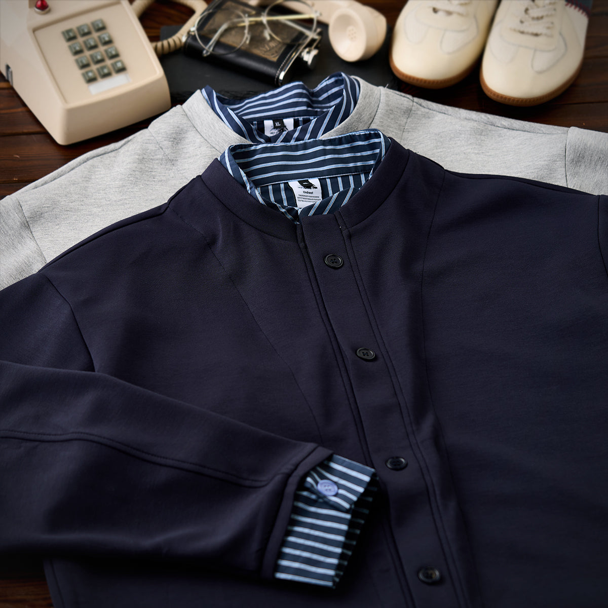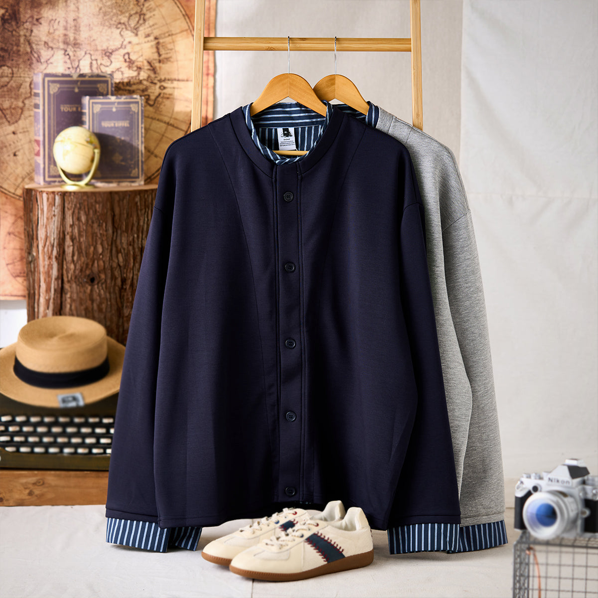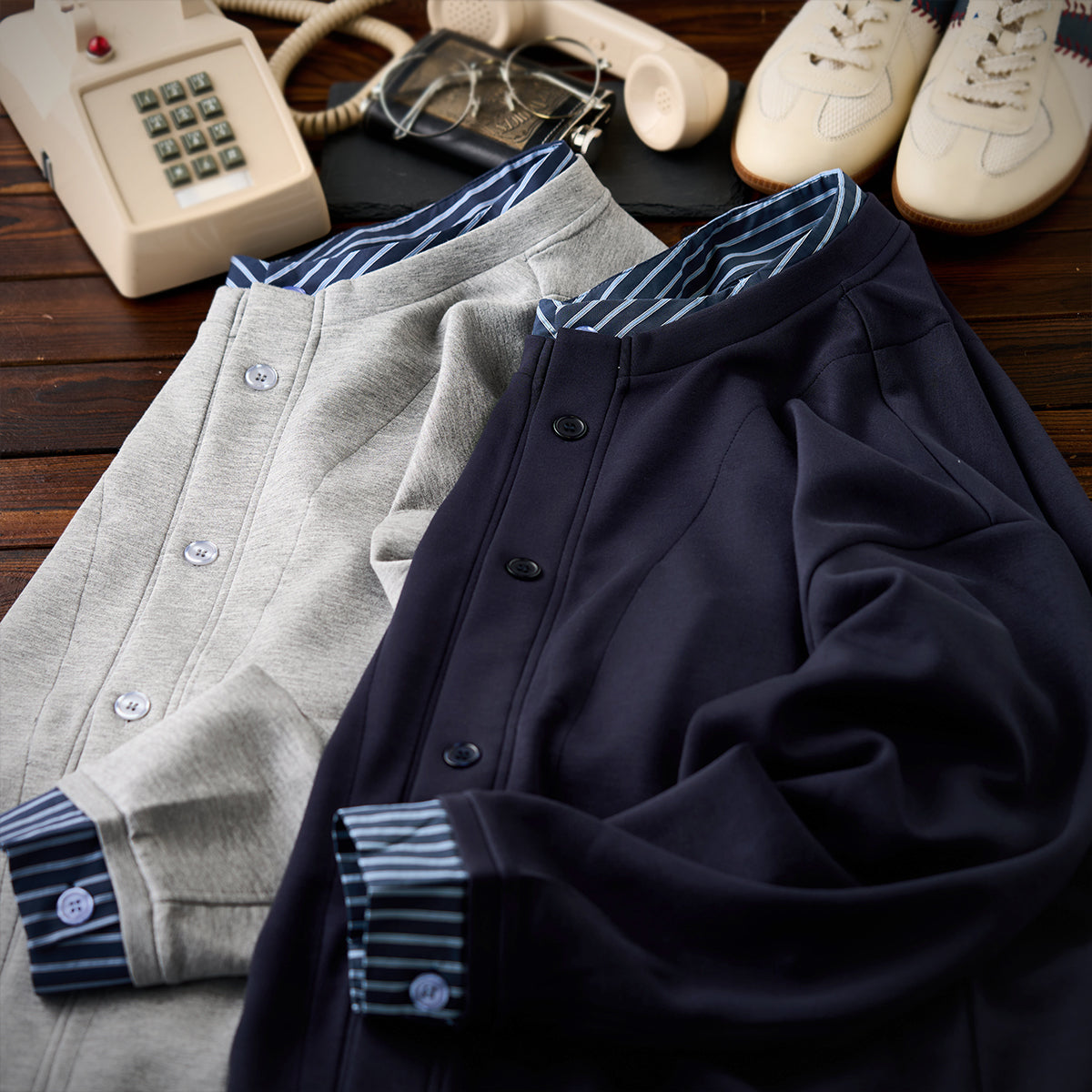 ストライプシャツとカーディガンをレイヤードしたかのようなデザインを採用した、フェイクレイヤードジャケット。重ね着の洒落感を一枚で表現でき、コーディネートに奥行きを与えてくれるアイテムです。ストライプ柄が爽やかな印象を添え、カーディガン風のパーツが落ち着いた雰囲気を演出。ジャケットとしてのきちんと感を持ちながら、カジュアルにも合わせやすい絶妙なバランスが魅力です。シーズンを問わず、幅広いスタイリングで活躍する一着に仕上がっています。