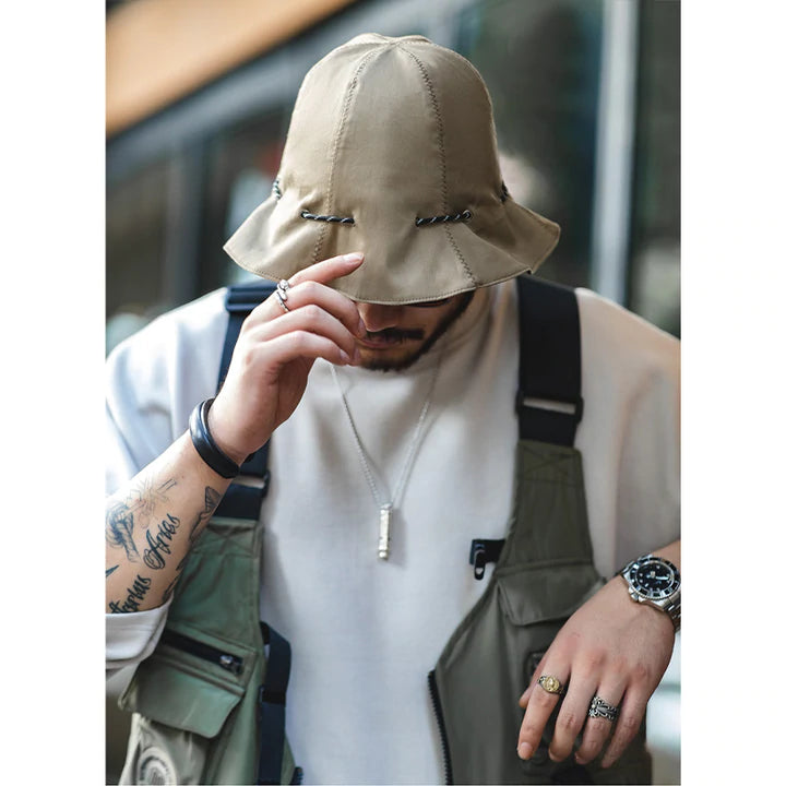 カーキ色×ブラック色の気分に合わせて使えるリバーシブル仕様になっています。更に、調整できる紐が付いていて、引き締めることで簡単なウォレットの形になる機能性満載のバケットハット。
