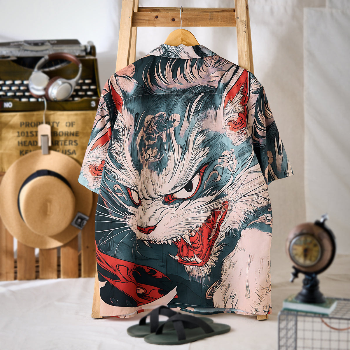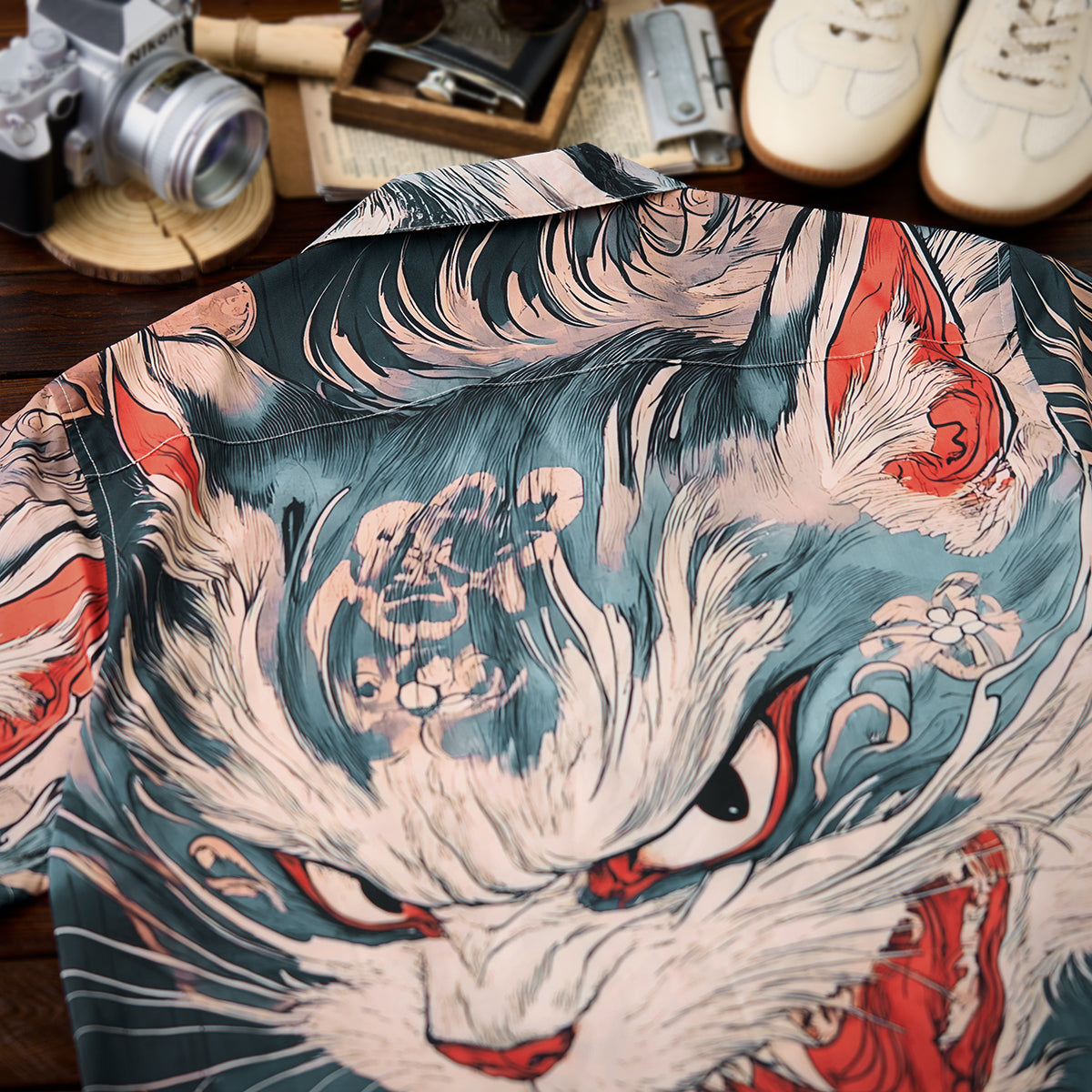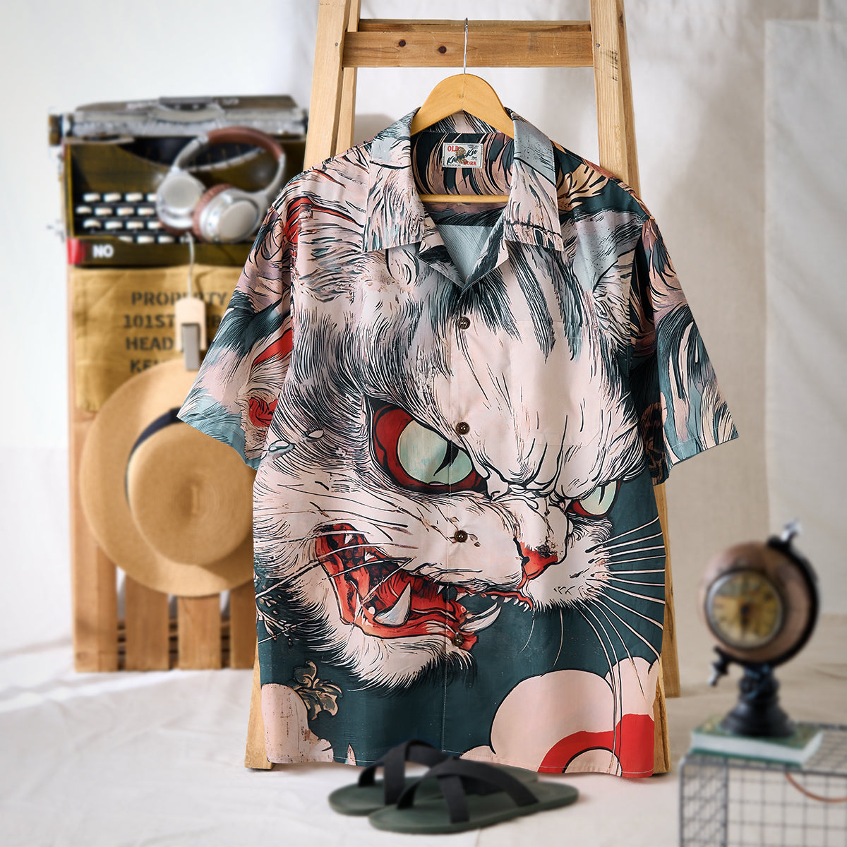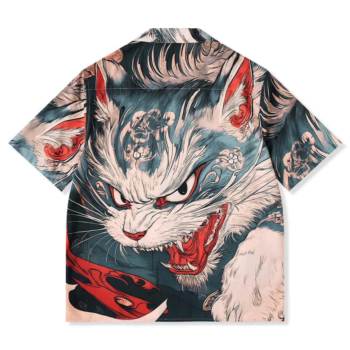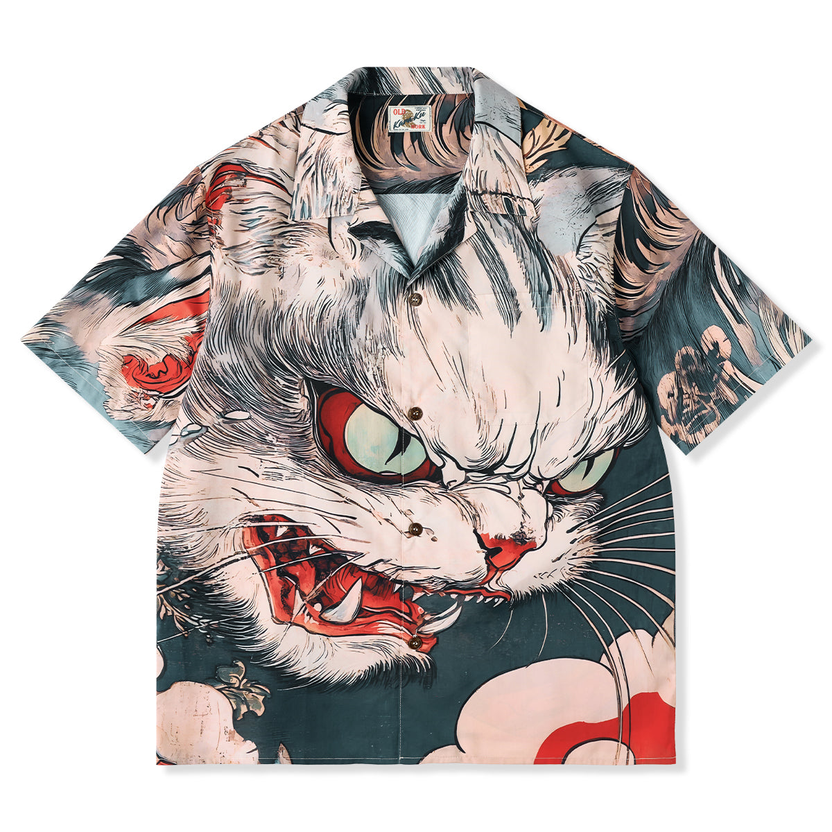 民間伝承「烈吼ノ猫又」浮世絵風前後アシンメトリープリントオープンカラーシャツ