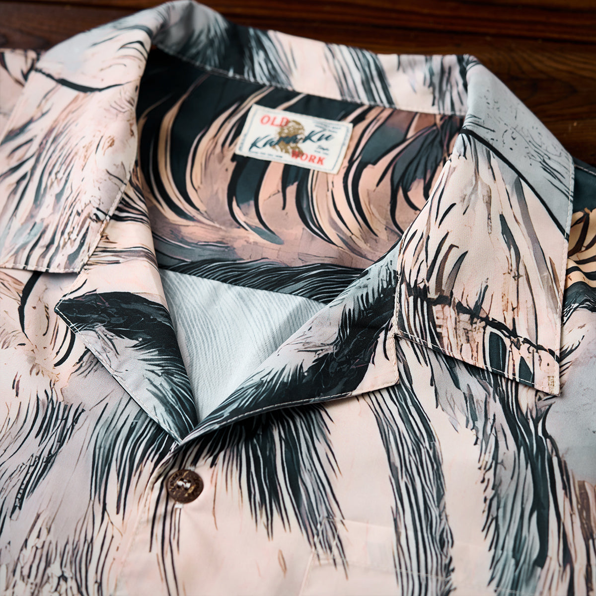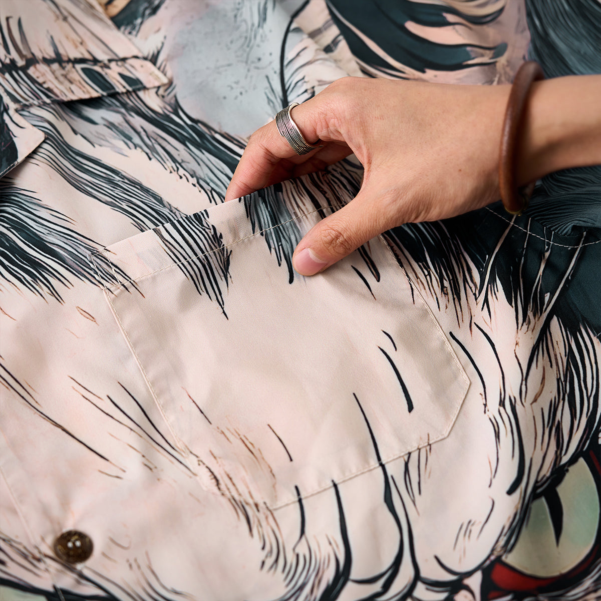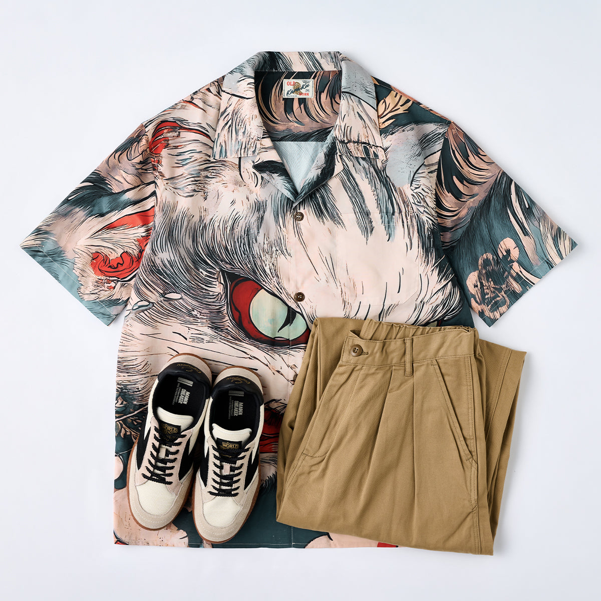 インパクト抜群のグラフィックが目を引く、浮世絵風オープンカラーシャツ。フロントとバックで異なる猫の表情を描き分けたダイナミックな総柄デザイン。繊細に描かれた毛並みや鋭い眼光、むき出しの牙が、まるで今にも飛びかかってきそうな迫力を放ちます。深みのあるブルーに、情熱的なレッドを差し込んだ配色は、見る者の視線を釘付けに。アートピースのような存在感で、1枚でコーデの主役になるアイテムです。