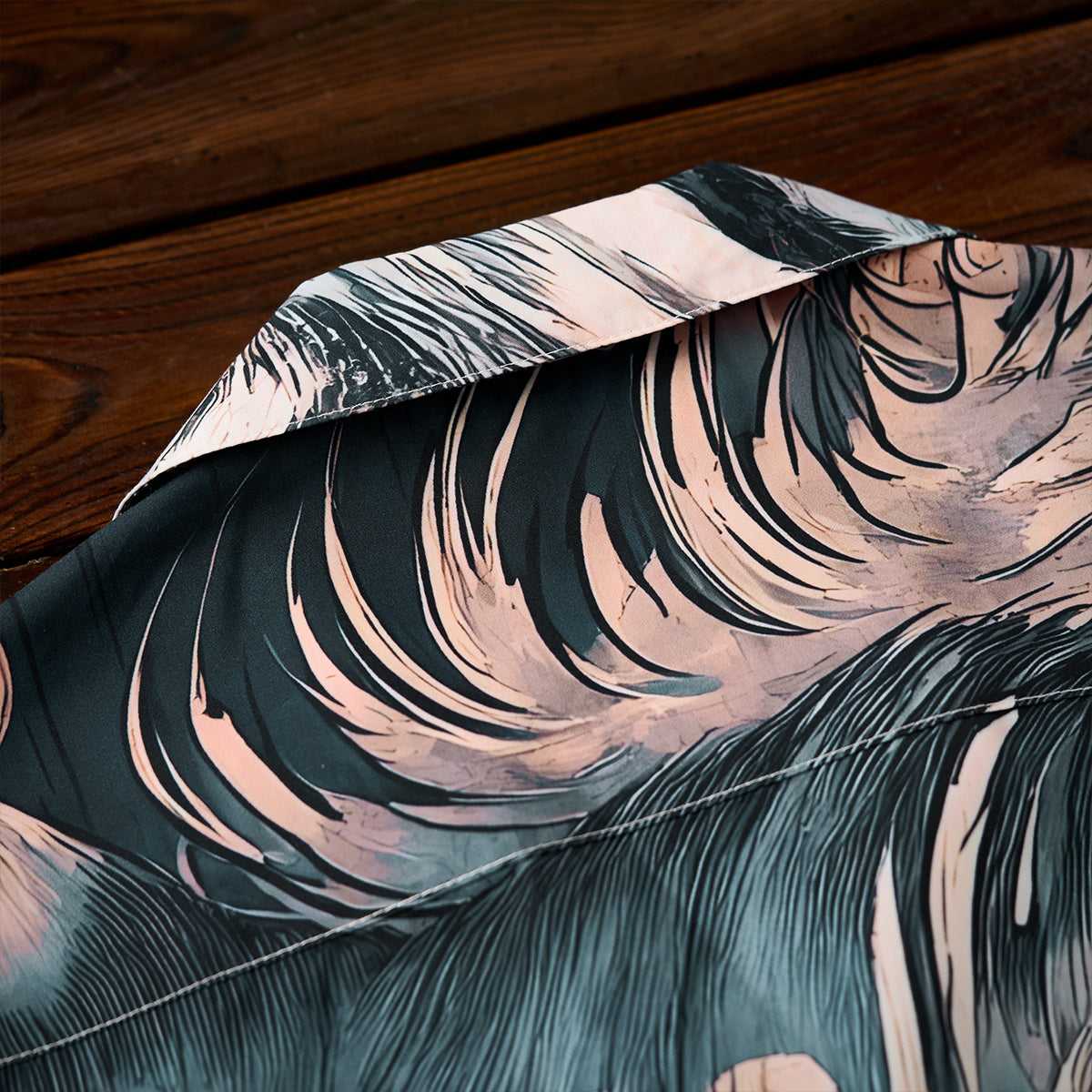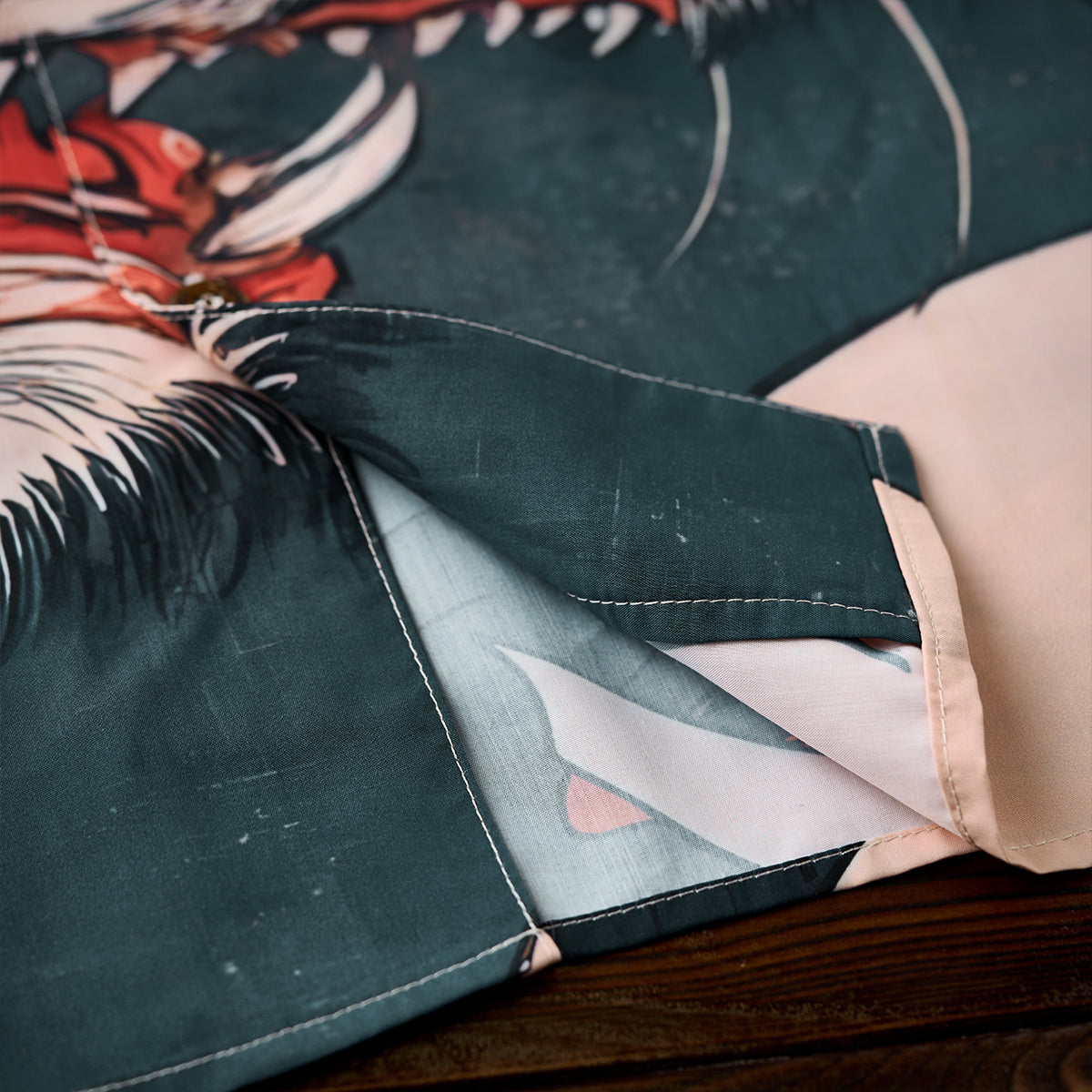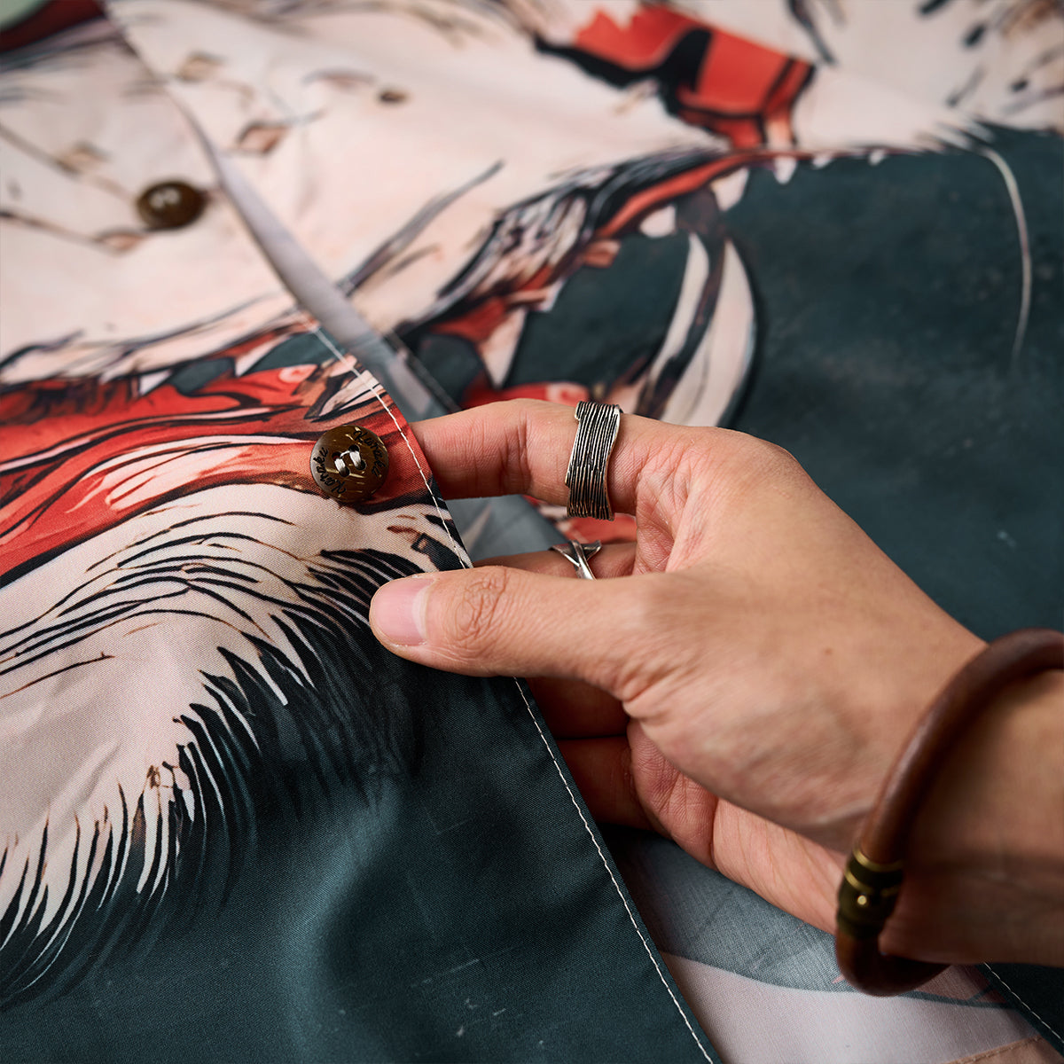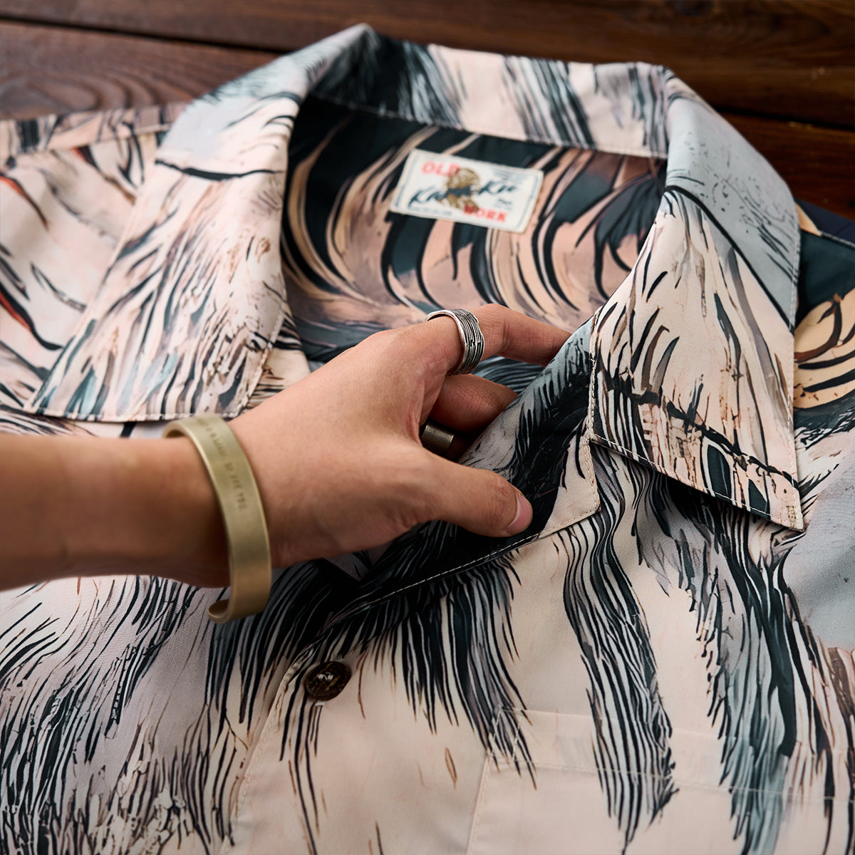 インパクト抜群のグラフィックが目を引く、浮世絵風オープンカラーシャツ。フロントとバックで異なる猫の表情を描き分けたダイナミックな総柄デザイン。繊細に描かれた毛並みや鋭い眼光、むき出しの牙が、まるで今にも飛びかかってきそうな迫力を放ちます。深みのあるブルーに、情熱的なレッドを差し込んだ配色は、見る者の視線を釘付けに。アートピースのような存在感で、1枚でコーデの主役になるアイテムです。