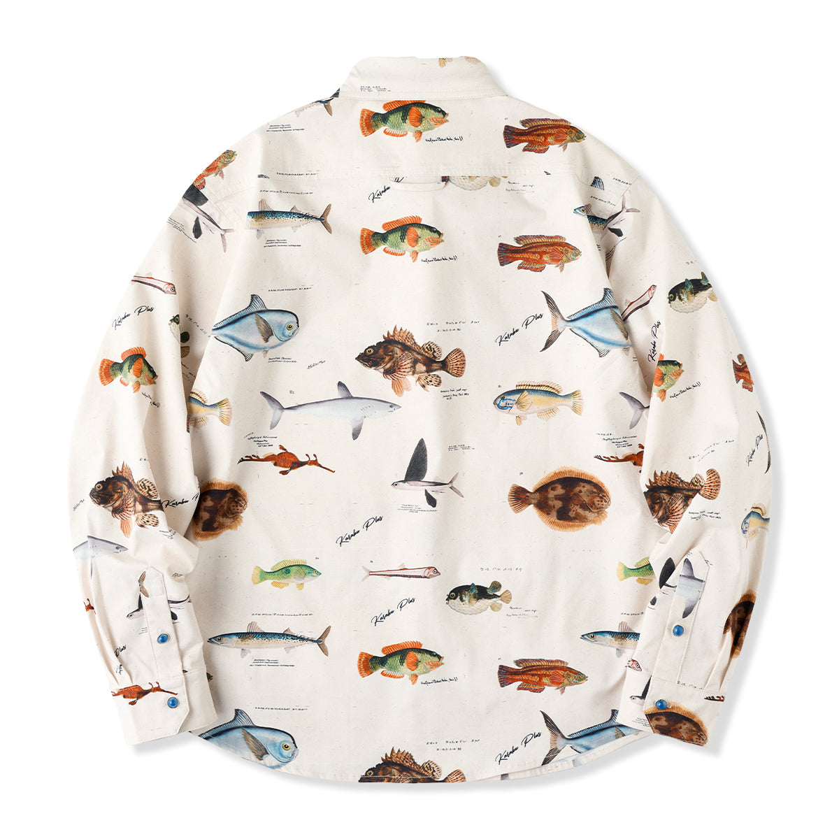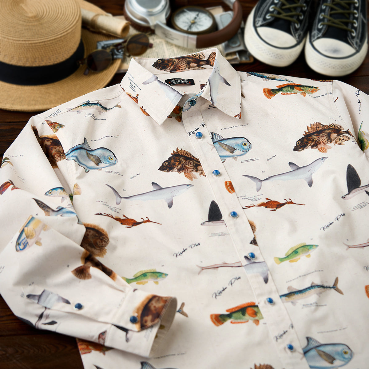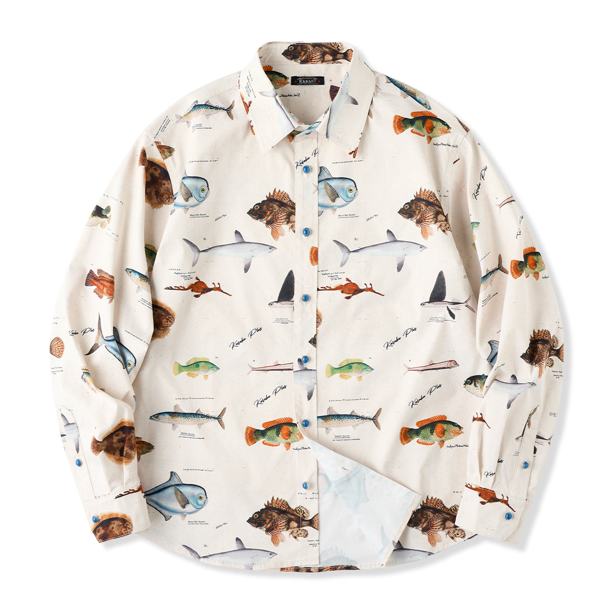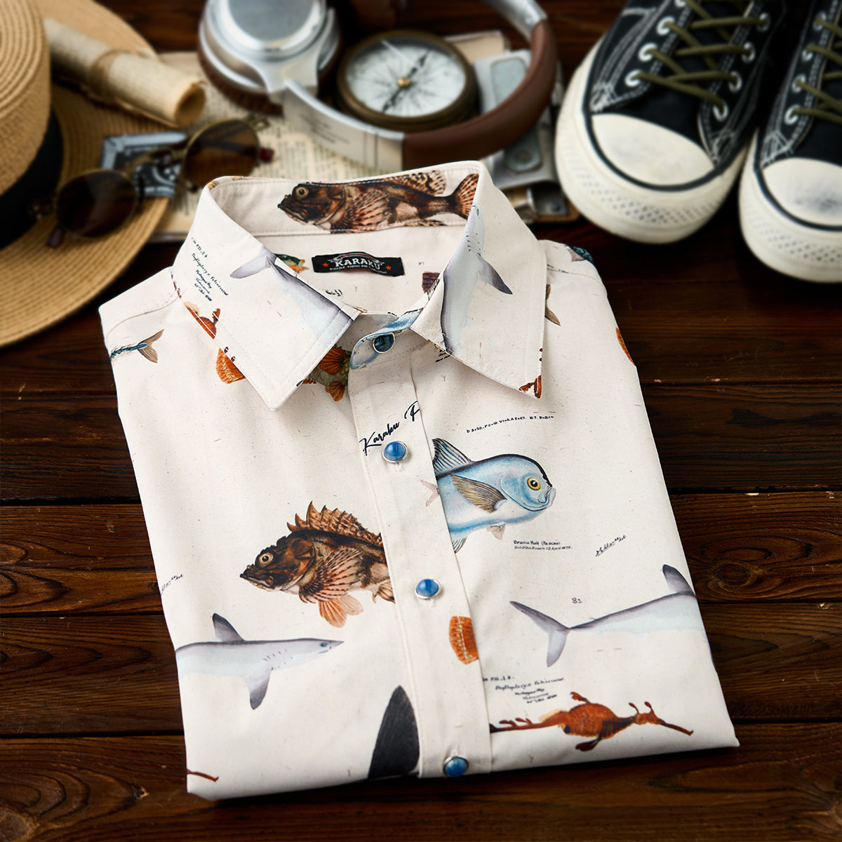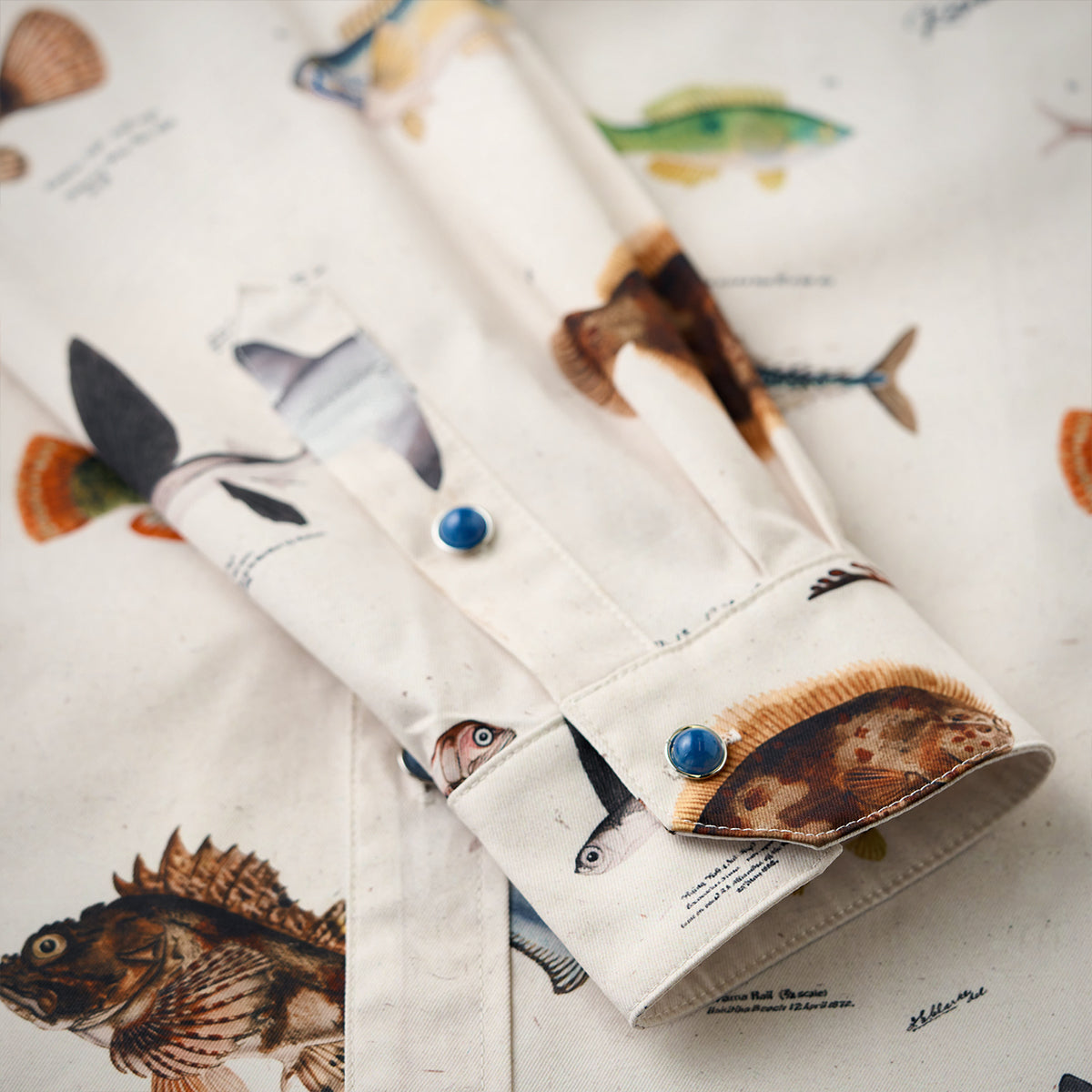 「博物図鑑・深海魚」総柄 オーダーメイドボタン付き長袖シャツ