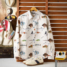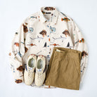 一見派手な総柄ながら、内容は非常に学術的。自然史博物館や図鑑を愛する層への訴求力が高い。チノパンやスリムフィットのパンツと合わせ、街中でも着用可能なスタイルに。スニーカーやローファーでモダンな印象をプラス。