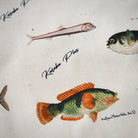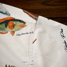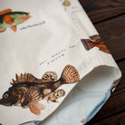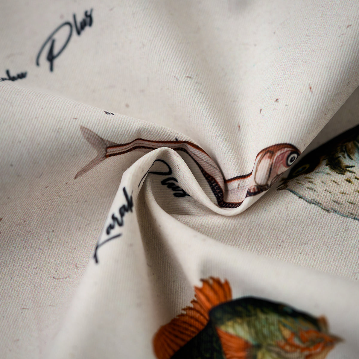 博物画のスタイルをベースにして、魚のイラストの隣に、種類名や学名、時には英語の注釈が小さなフォントで添えられて、まるで科学図鑑のページを再構成した。デフォルメされておらず、魚の特徴や鱗、ひれの構造まで丁寧に再現。アイボリーベースカラーで、清潔感があり、魚の色が際立つ。魚の配色はすべてナチュラルで、リアルな発色。赤、緑、茶、青などさまざまだが、全体は落ち着いて見える。左右対称や規則性はないが、色の濃淡・大きさ・向きがランダムに調整されて、「見飽きない」構成。