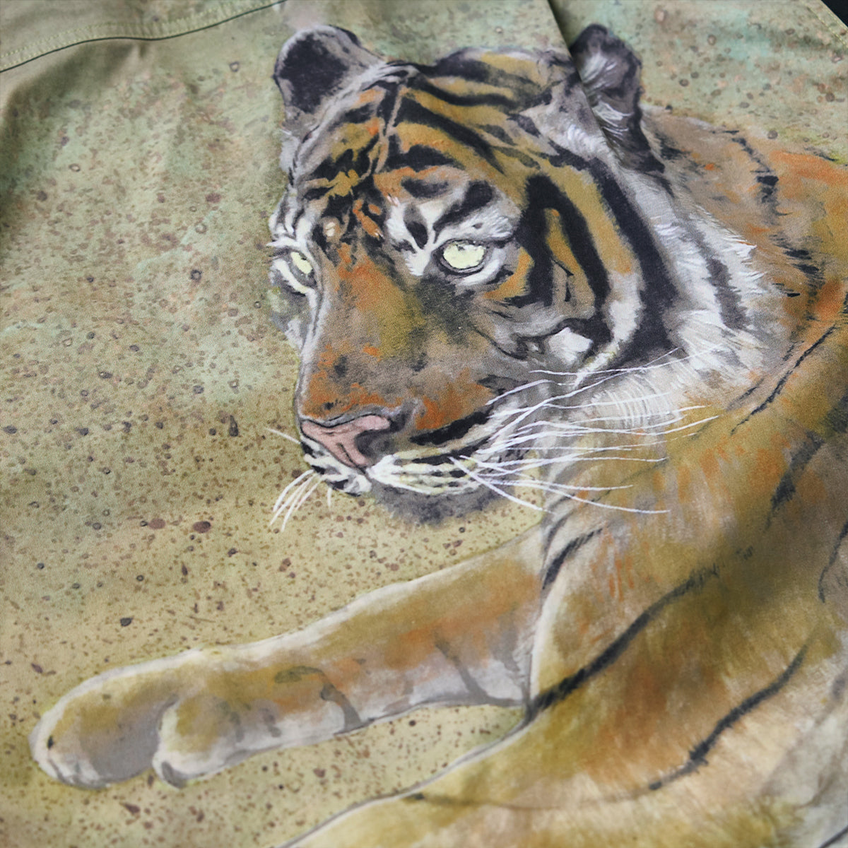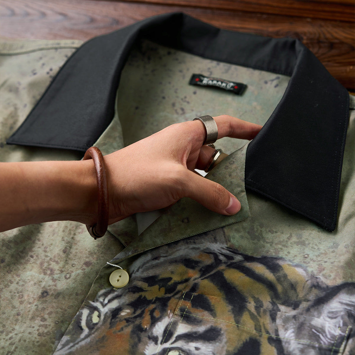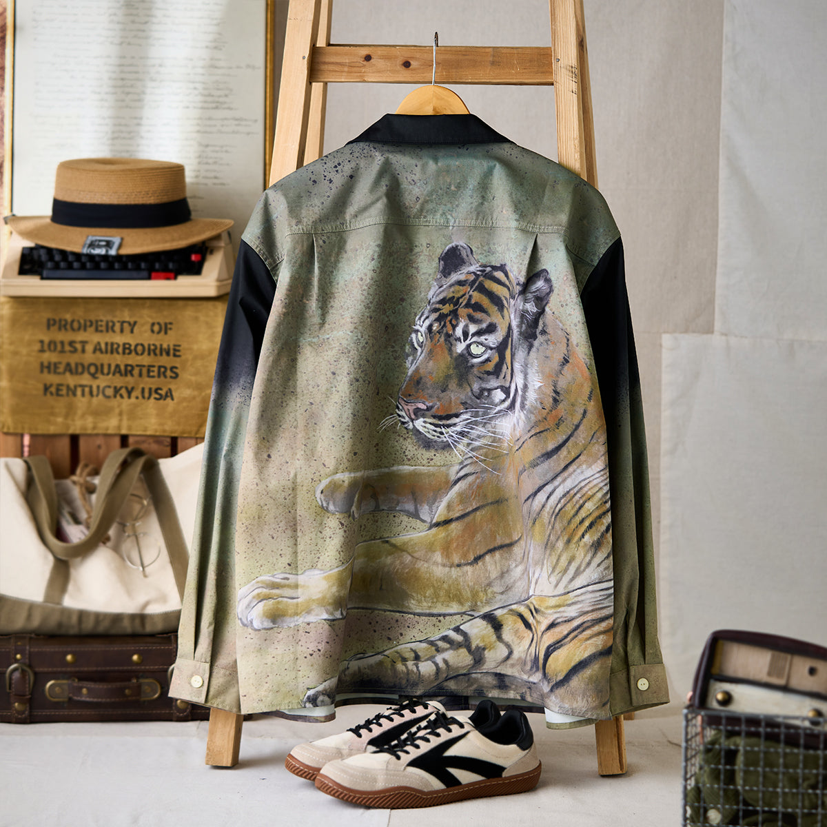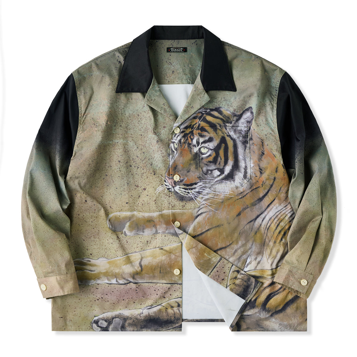 日本画家・川又聡とのコラボレーションによる特別なプリントオープンカラーシャツ。彼の代表作「虎図」をモチーフに、地に伏しながらも鋭い眼差しを放つ虎を生き生きと描き出しています。リアルかつ迫力ある筆致は、まるで今にも動き出すかのような存在感。襟元はブラックで引き締め、両袖は肩から袖口にかけてブラックのグラデーションを施し、全体にモダンで洗練された印象を与えています。アートとファッションが融合した一枚は、コーディネートの主役となること間違いなしのアイテムです。