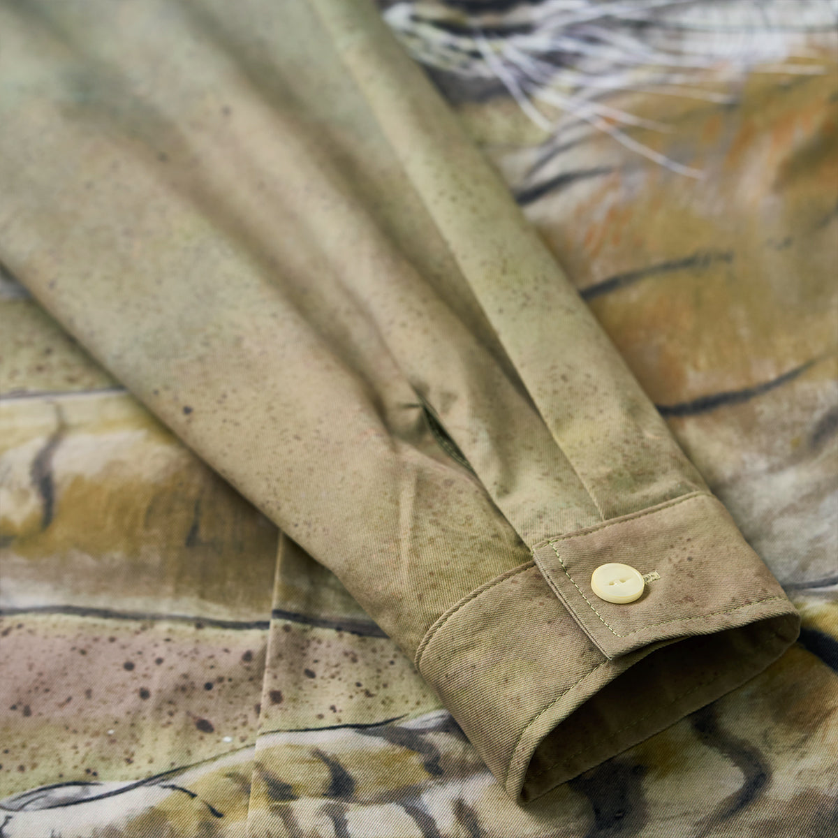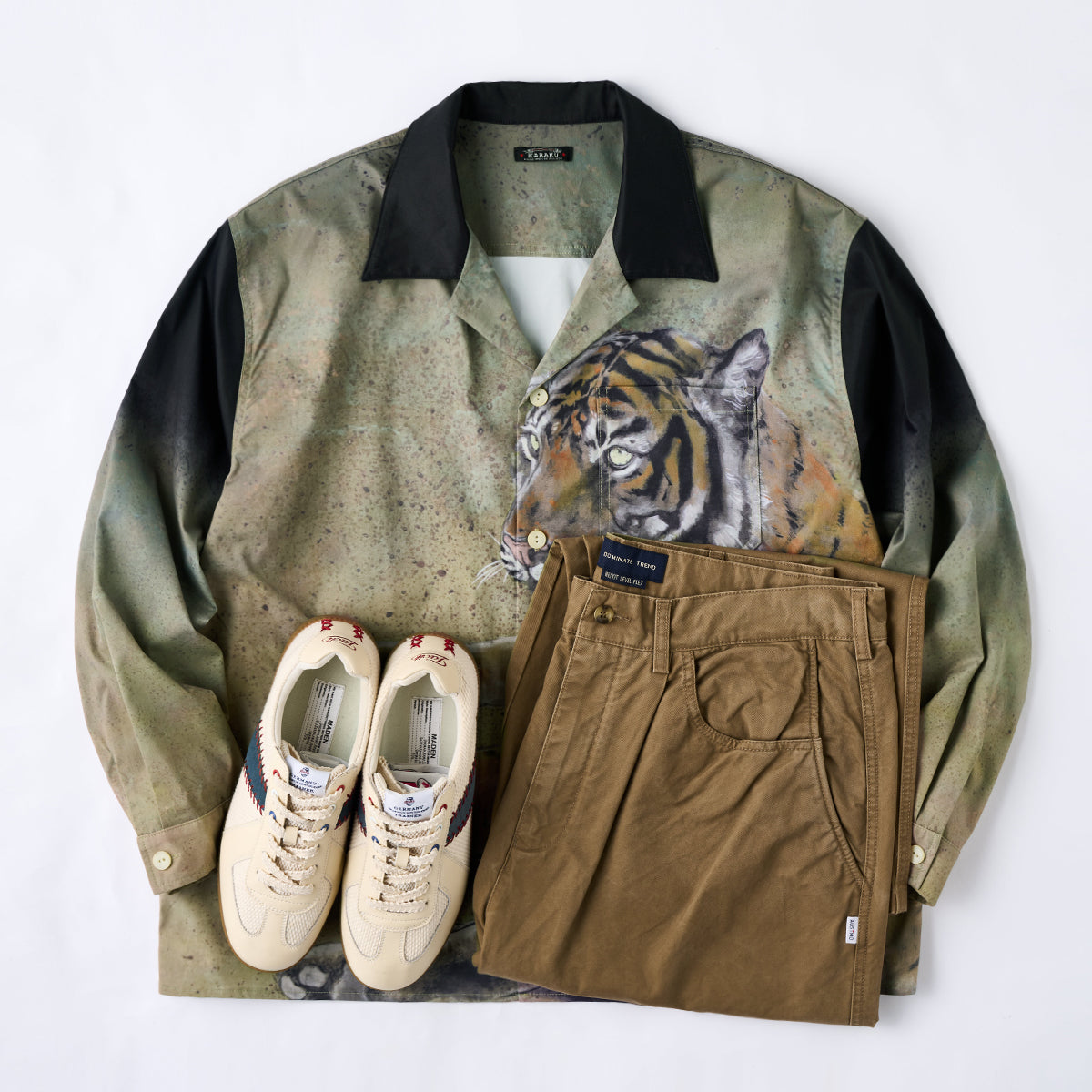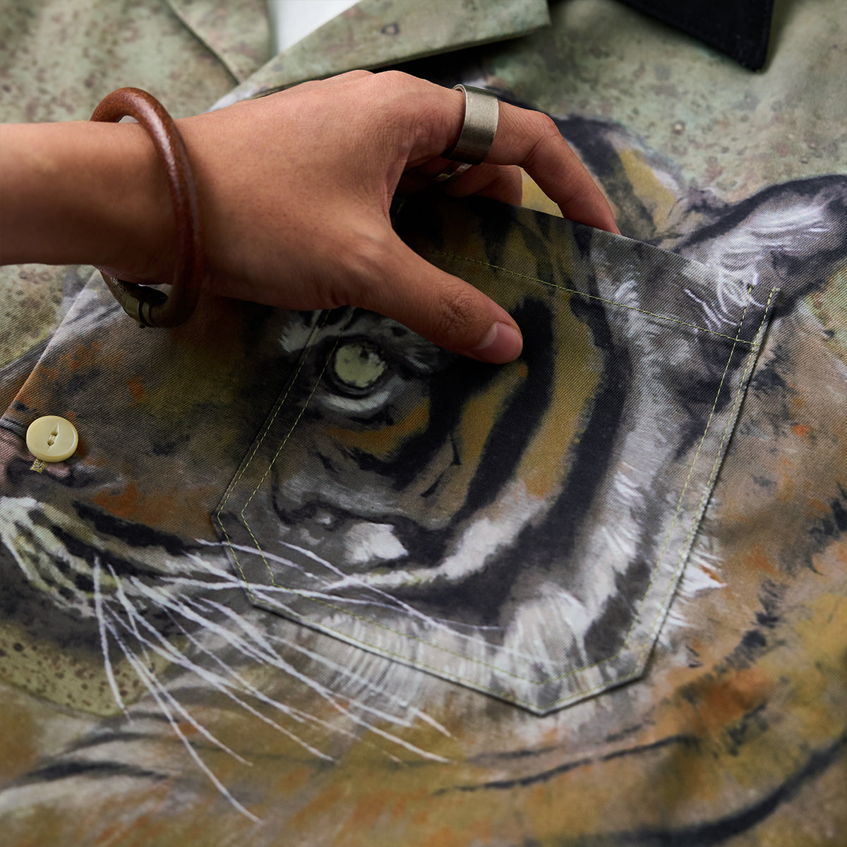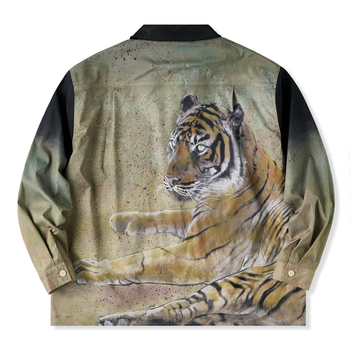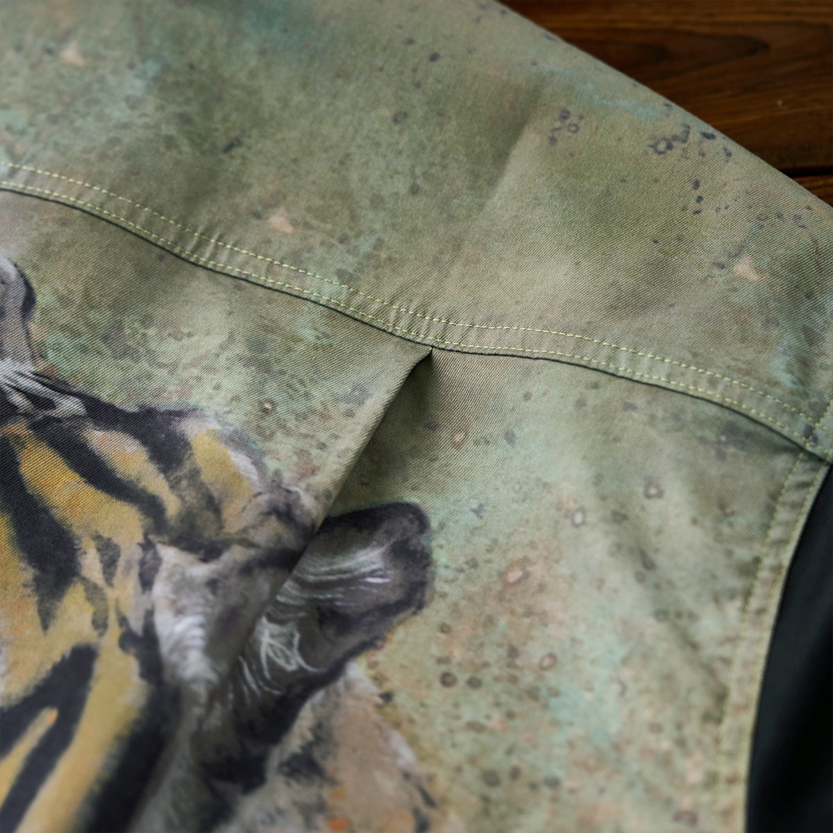 日本画家・川又聡とのコラボレーションによる特別なプリントオープンカラーシャツ。彼の代表作「虎図」をモチーフに、地に伏しながらも鋭い眼差しを放つ虎を生き生きと描き出しています。リアルかつ迫力ある筆致は、まるで今にも動き出すかのような存在感。襟元はブラックで引き締め、両袖は肩から袖口にかけてブラックのグラデーションを施し、全体にモダンで洗練された印象を与えています。アートとファッションが融合した一枚は、コーディネートの主役となること間違いなしのアイテムです。