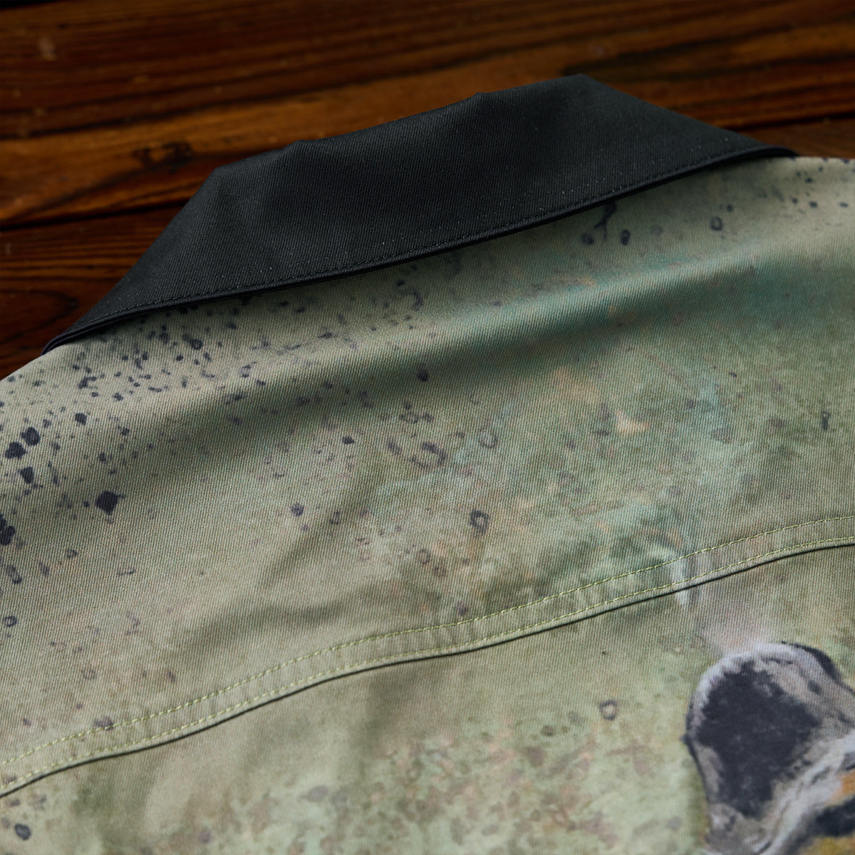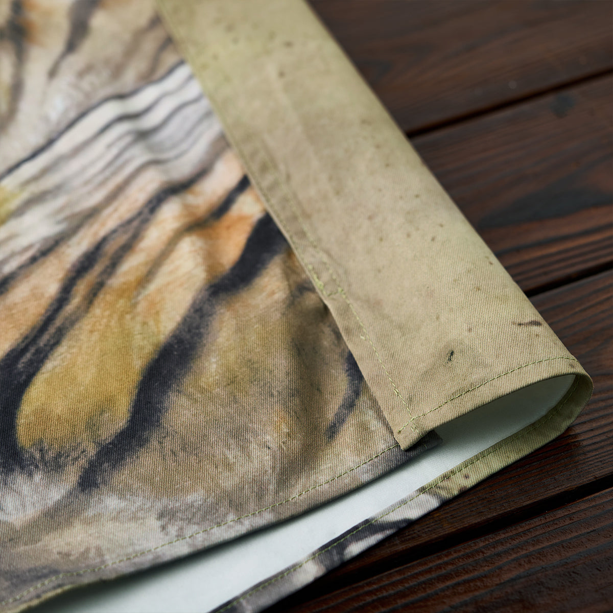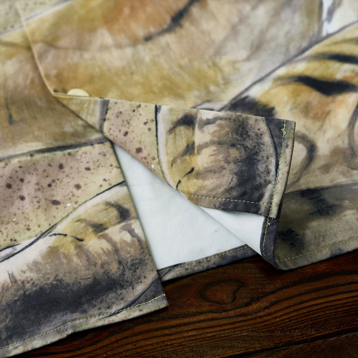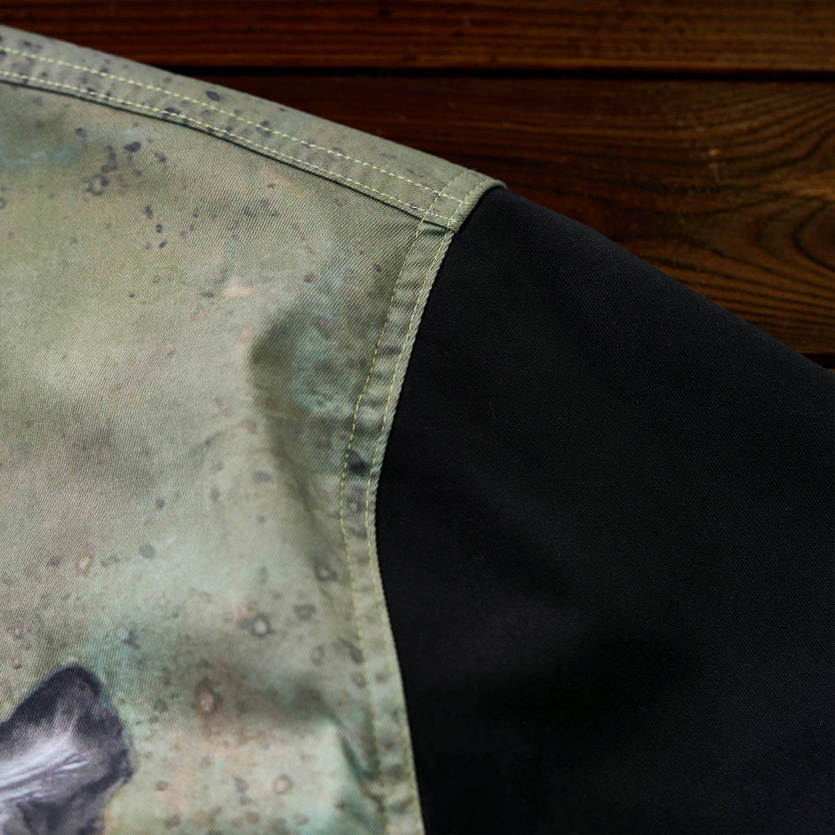 日本画家・川又聡とのコラボレーションによる特別なプリントオープンカラーシャツ。彼の代表作「虎図」をモチーフに、地に伏しながらも鋭い眼差しを放つ虎を生き生きと描き出しています。リアルかつ迫力ある筆致は、まるで今にも動き出すかのような存在感。襟元はブラックで引き締め、両袖は肩から袖口にかけてブラックのグラデーションを施し、全体にモダンで洗練された印象を与えています。アートとファッションが融合した一枚は、コーディネートの主役となること間違いなしのアイテムです。