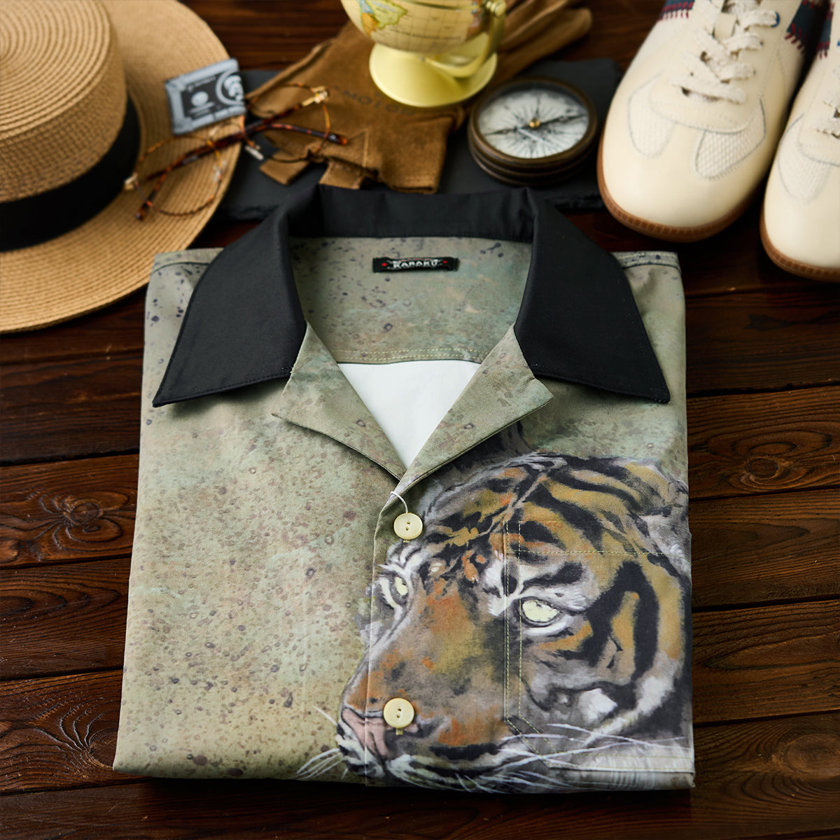 Karaku×川又聡「虎図」プリント入りオープンカラーシャツ