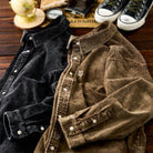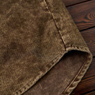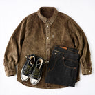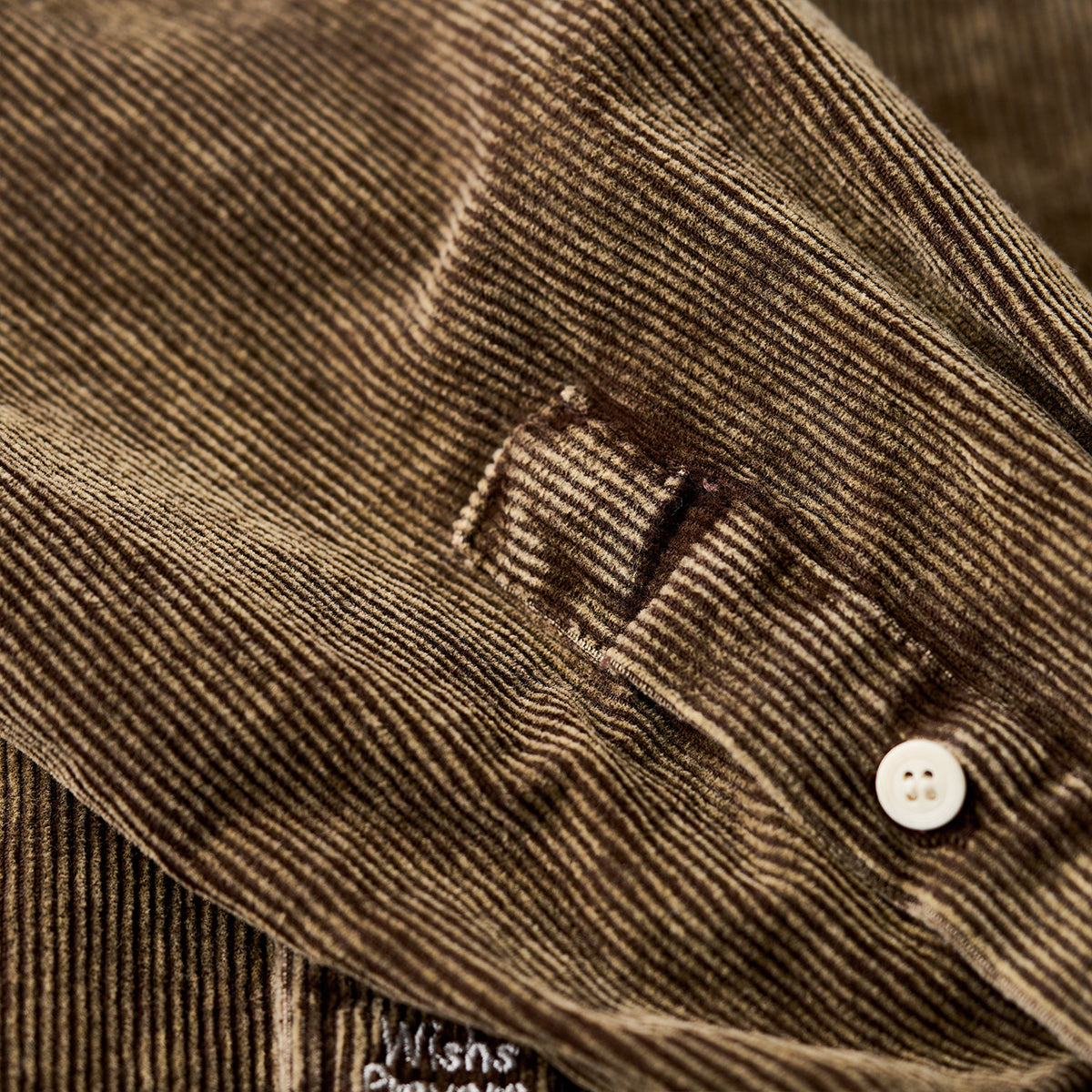 コットンコーデュロイ素材を使用し、厚すぎず薄すぎない適度なハリがあり、年間を通じて着用可能。ウォッシュ加工がされ、素材は自然の色落ちとユーズド感で現れ、ビンテージ感も満載。
