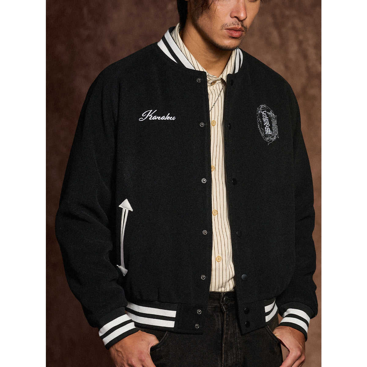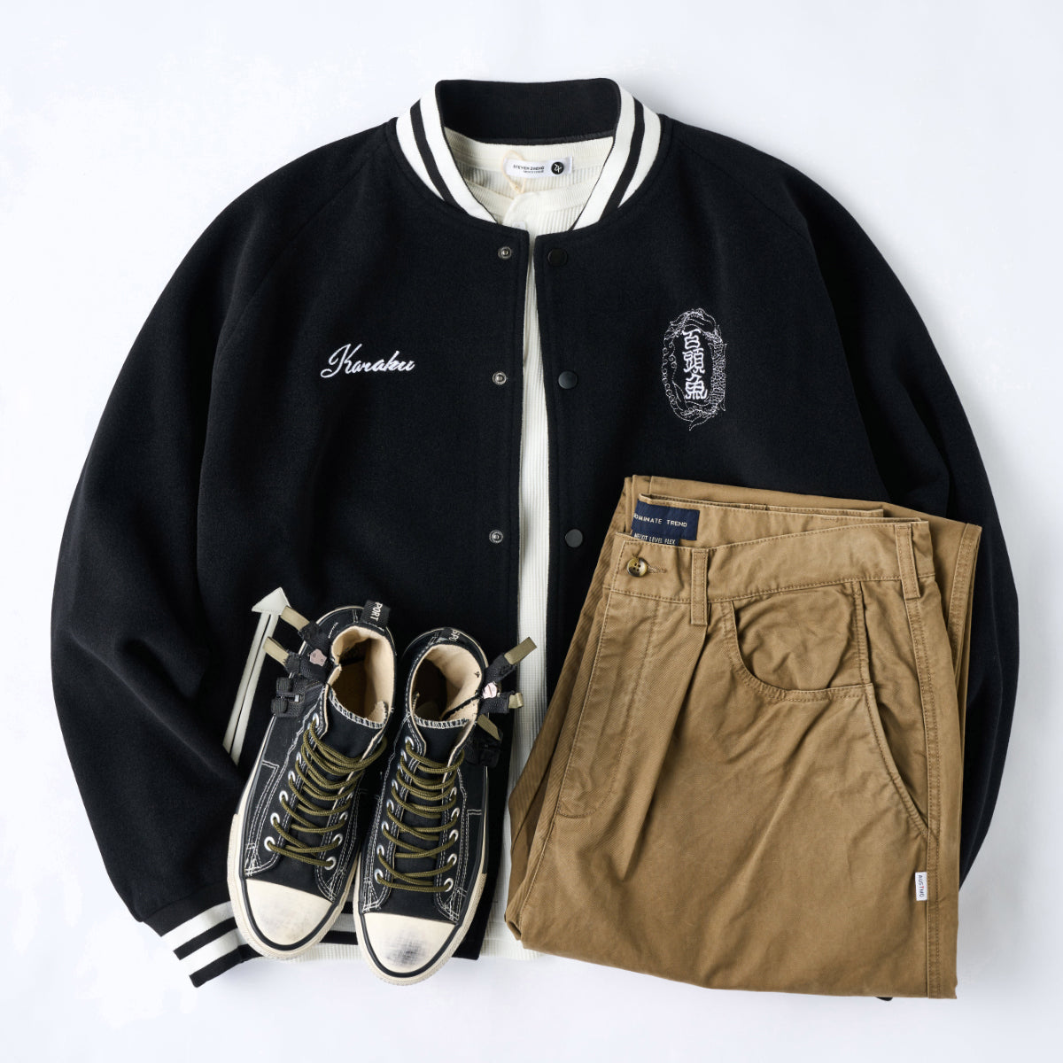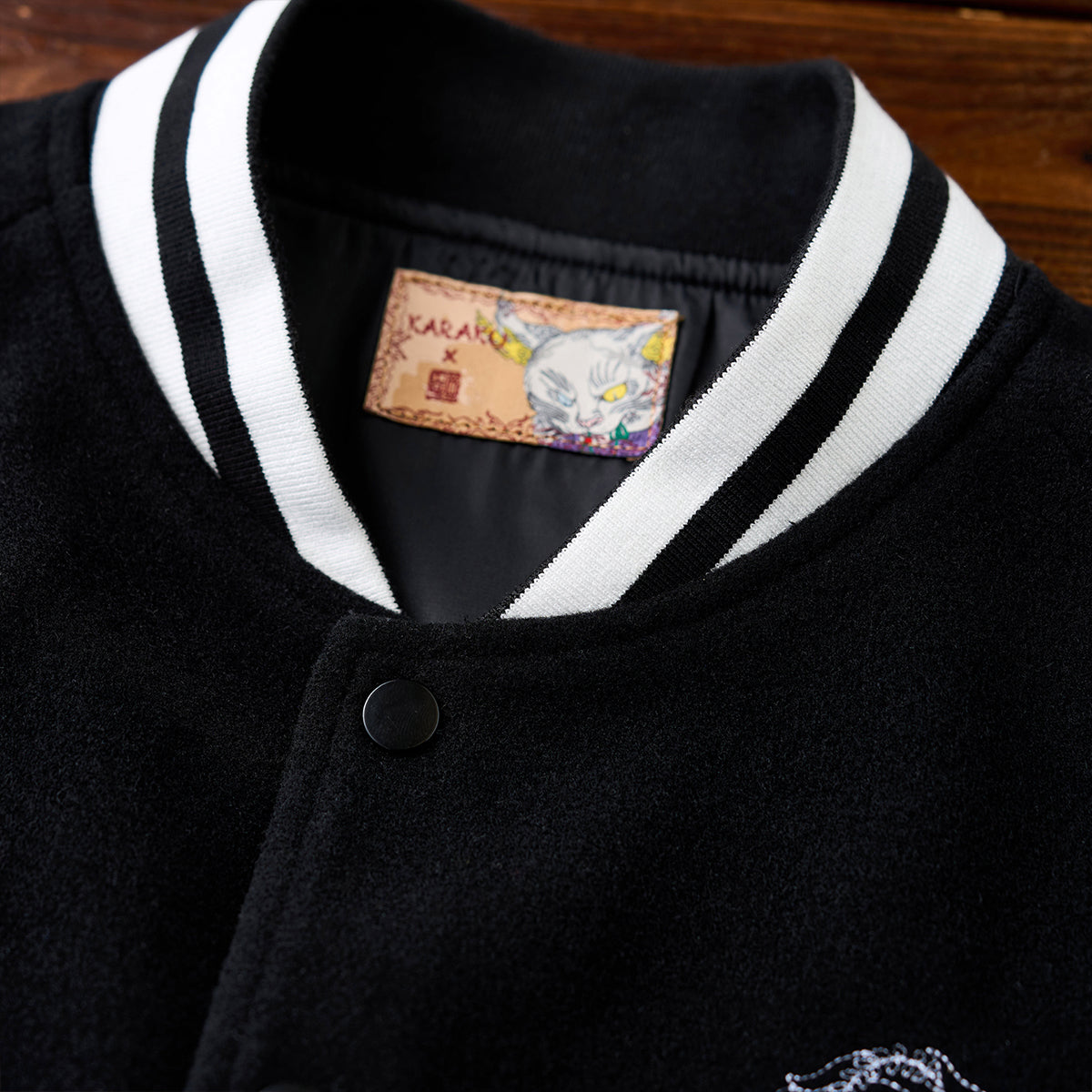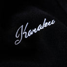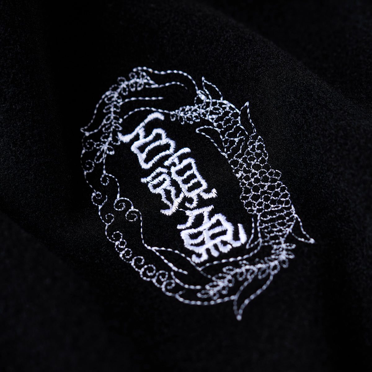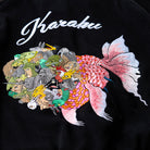 左胸に「百頭魚」という文字が刺繍されて、文字の周囲には魚をモチーフにしたような細かい装飾が施され、右胸には「Karaku」というロゴタイプが刺繍され、西洋風の書体と和風の刺繍が融合したデザインとなっています。