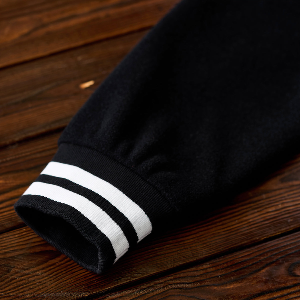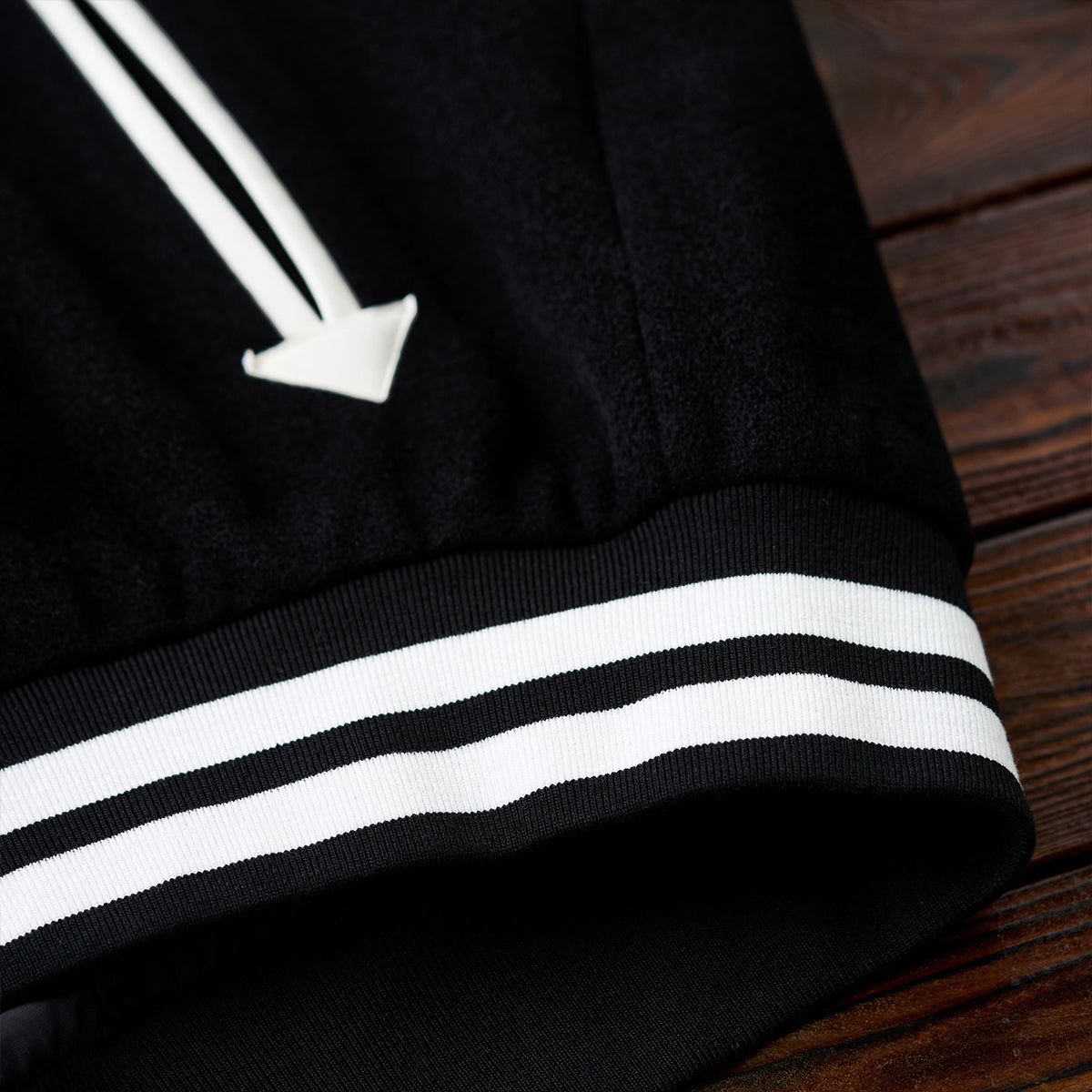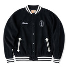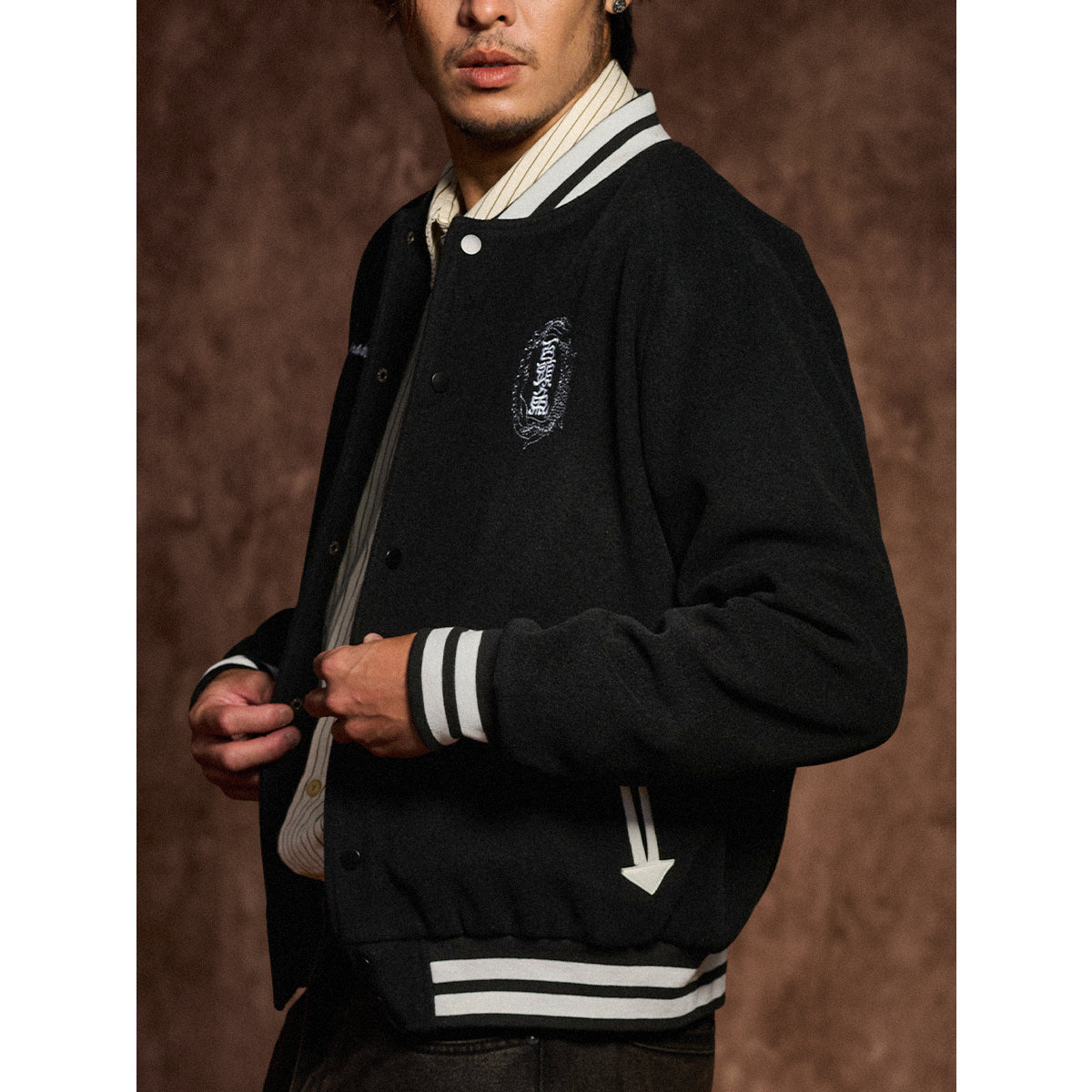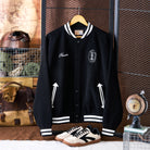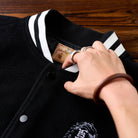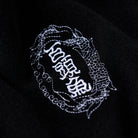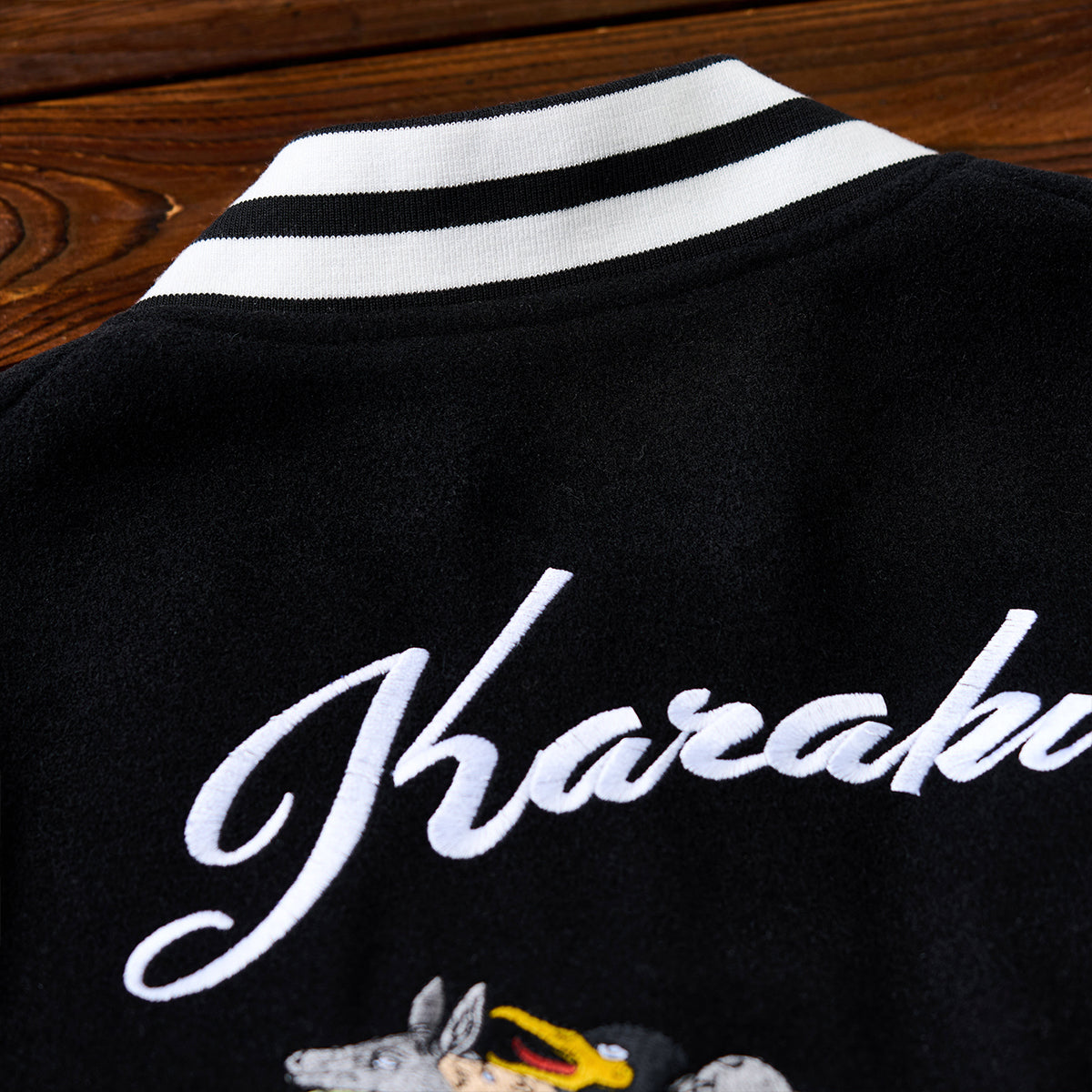 左胸に「百頭魚」という文字が刺繍されて、文字の周囲には魚をモチーフにしたような細かい装飾が施され、右胸には「Karaku」というロゴタイプが刺繍され、西洋風の書体と和風の刺繍が融合したデザインとなっています。