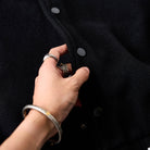 バックには非常に印象的な「百頭魚」の刺繍が施されています。百種類の動物の顔を集めて1つの魚の体を構成して、それぞれの顔が個性的に表現され、“生命の混沌と調和”を象徴している。輪郭線が極めて鋭角的かつ繊細=浮世絵師の「線のリズム」を踏襲。