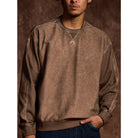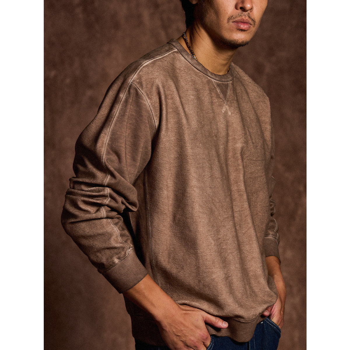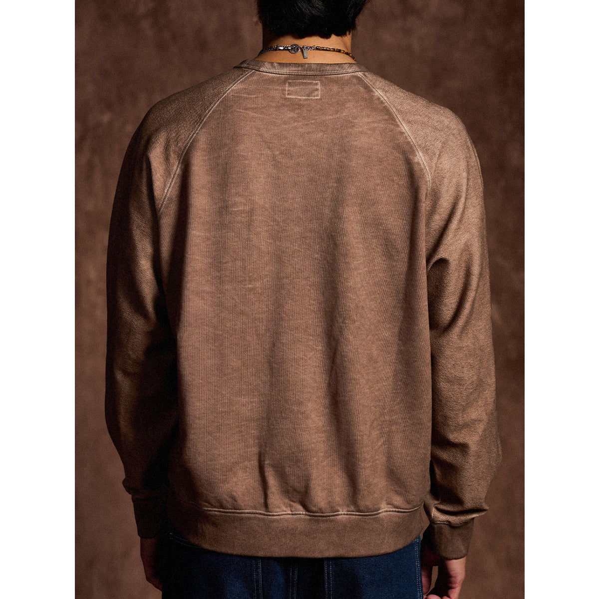 クルーネックデザインのデザインは、カジュアルかつクラシックな印象を与え、袖口と裾にリブが施されていて、フィット感を高めると同時に、カジュアルな雰囲気を強調する。