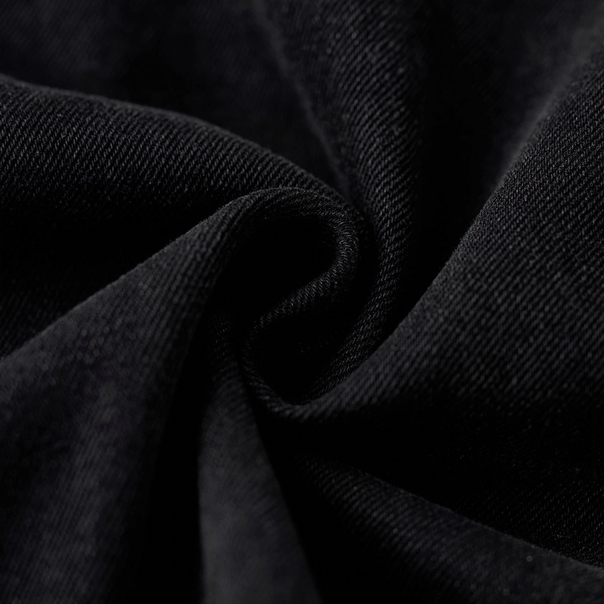 デニム生地とポリエステル素材の組み合わせが特徴的で、デザインに立体感を与えています。デニムのしっかりした質感と、ポリエステルの軽やかさ・光沢がコントラストを生み出しています。