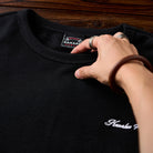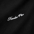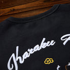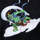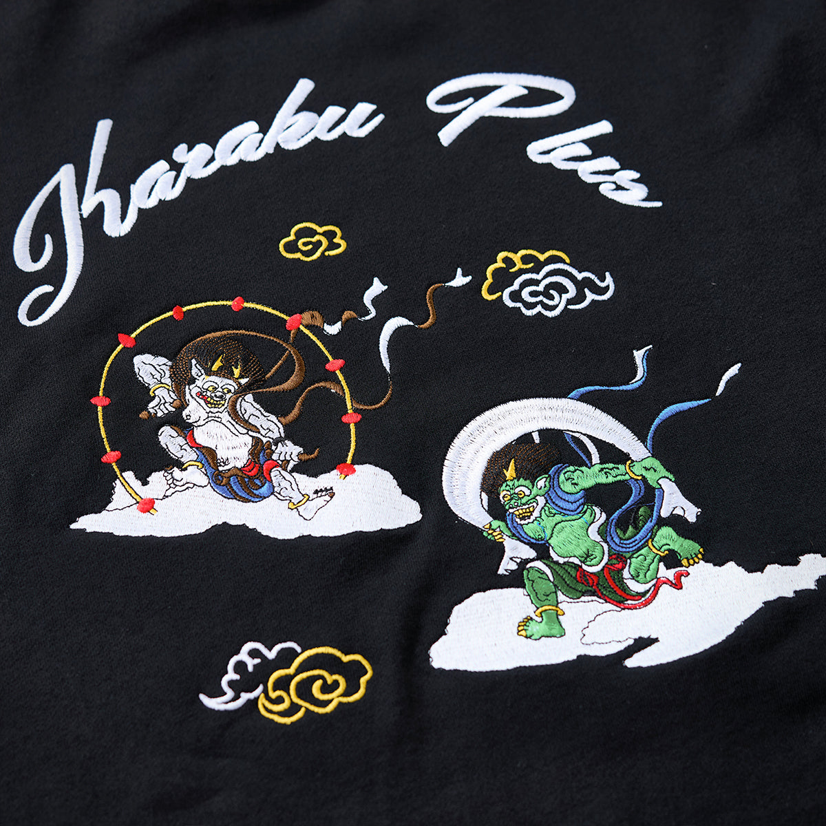 胸元に筆記体のロゴは柔らかく流れるようなデザインで、伝統的な風神雷神モチーフとの対比が印象的です。
