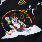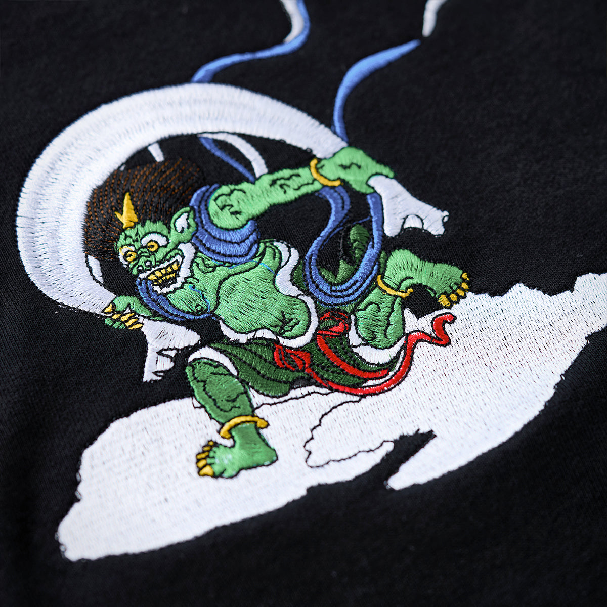 バックの風神と雷神の表情や筋肉のライン、衣服の動きなどが非常に精密に刺繍されている。風神の風袋や雷神の雷鼓が立体的に見えるよう、刺繍糸の太さや色合いが工夫されている。白い雲、金色や黒の装飾ラインが細かく刺繍されて、デザイン全体にリズム感を持たせている。
