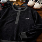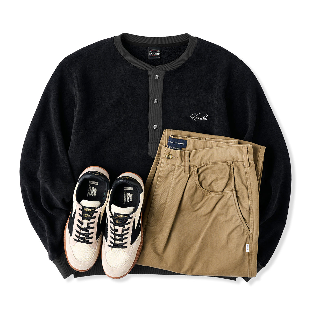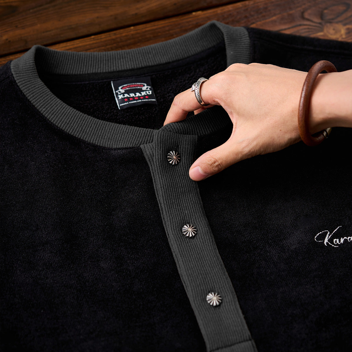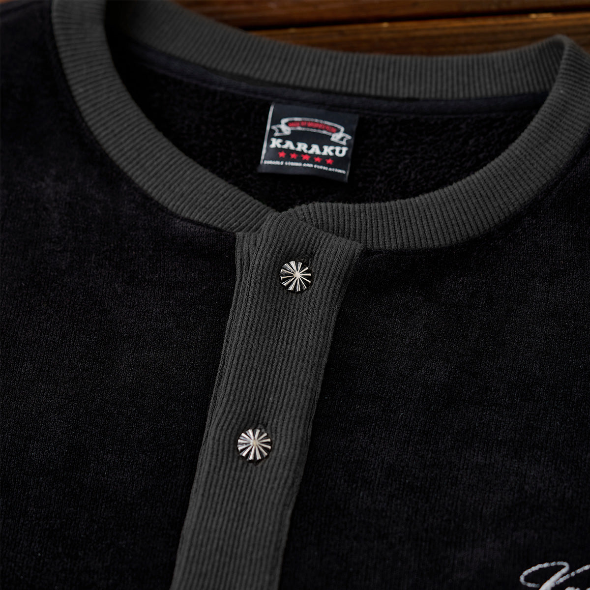 「KaraKu」刺繍入り 両面起毛フリースヘンリーネックスウェット