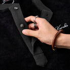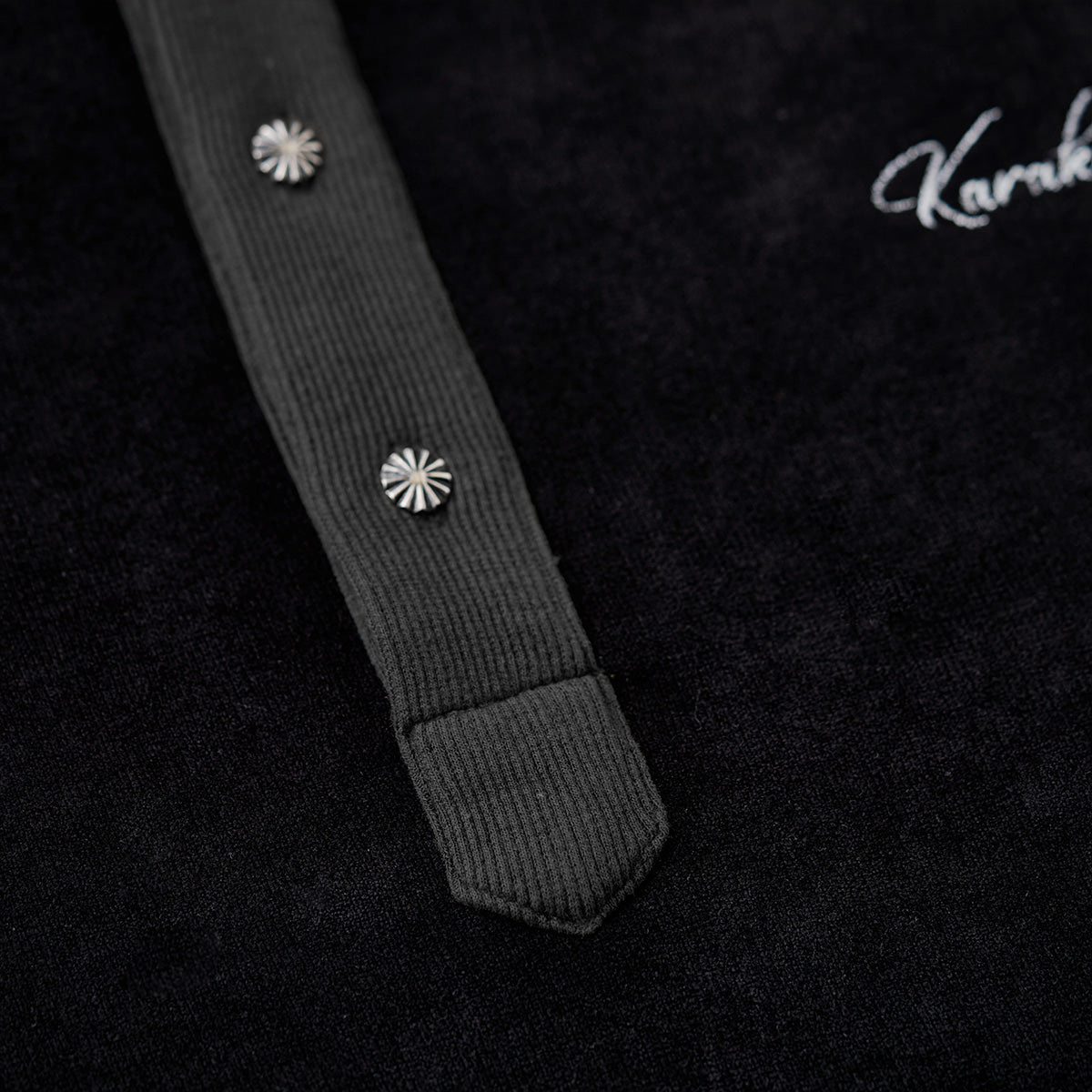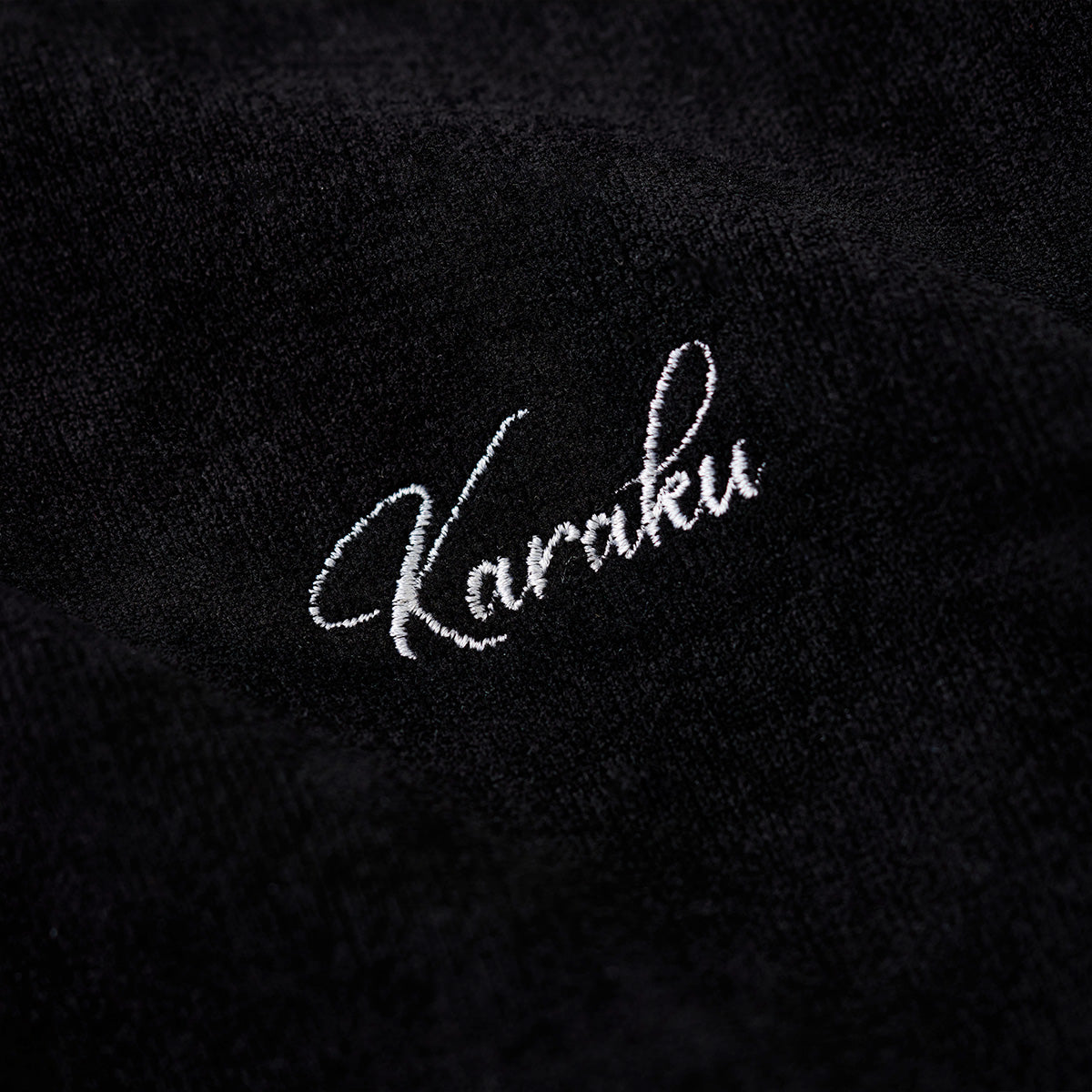 左胸部分に控えめな刺繍で「Karaku」のロゴが配置されて、シンプルながらも上品な雰囲気を醸し出して、ミニマルデザインとして全体の調和を損なわないポイントになっています。