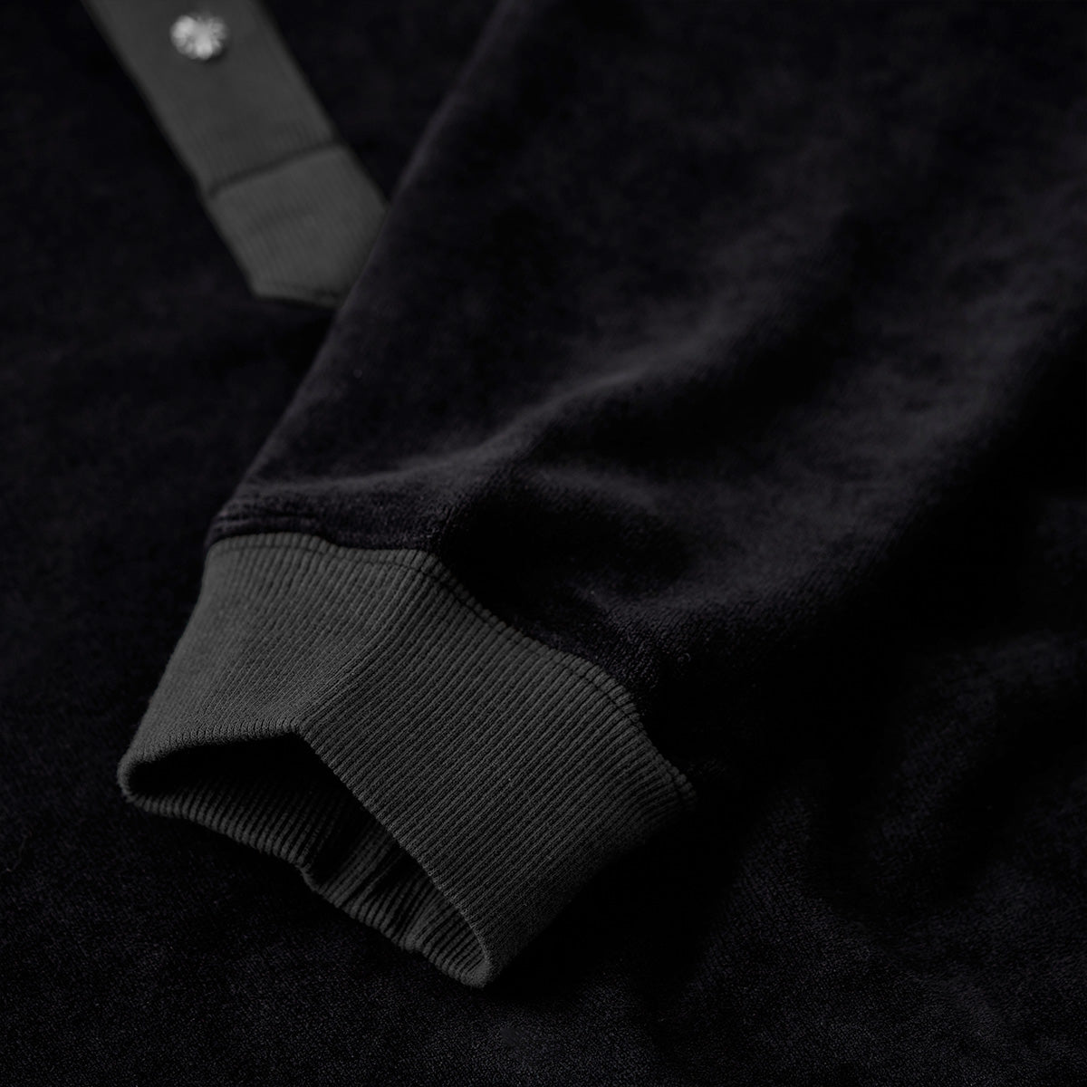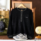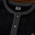 ヘンリーネック部分にメタルボタンが使用され、デザイン性と実用性を両立。ボタンには放射状の装飾が施されているため、ヴィンテージ感やクラシックな雰囲気が強調されています。