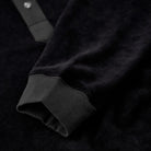 ボディーの黒い生地とネック部や袖口のリブ部分のダークグレーの配色が、落ち着いた印象を与えています。全体的にモノトーンで統一感があり、カジュアルな中にも洗練された雰囲気があります。